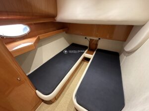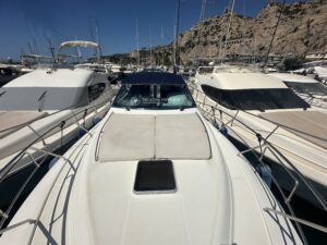Le bateau est équipé d’un GPS, sondeur, traceur, centrale de navigation Lowrance HDS16, pilote-automatique, radar, générateur, climatisation réversible, cuisine extérieure, bain de soleil avant et arrière, propulseur d’étrave, guideau électrique, passerelle hydraulique, plateforme de bain en teck…