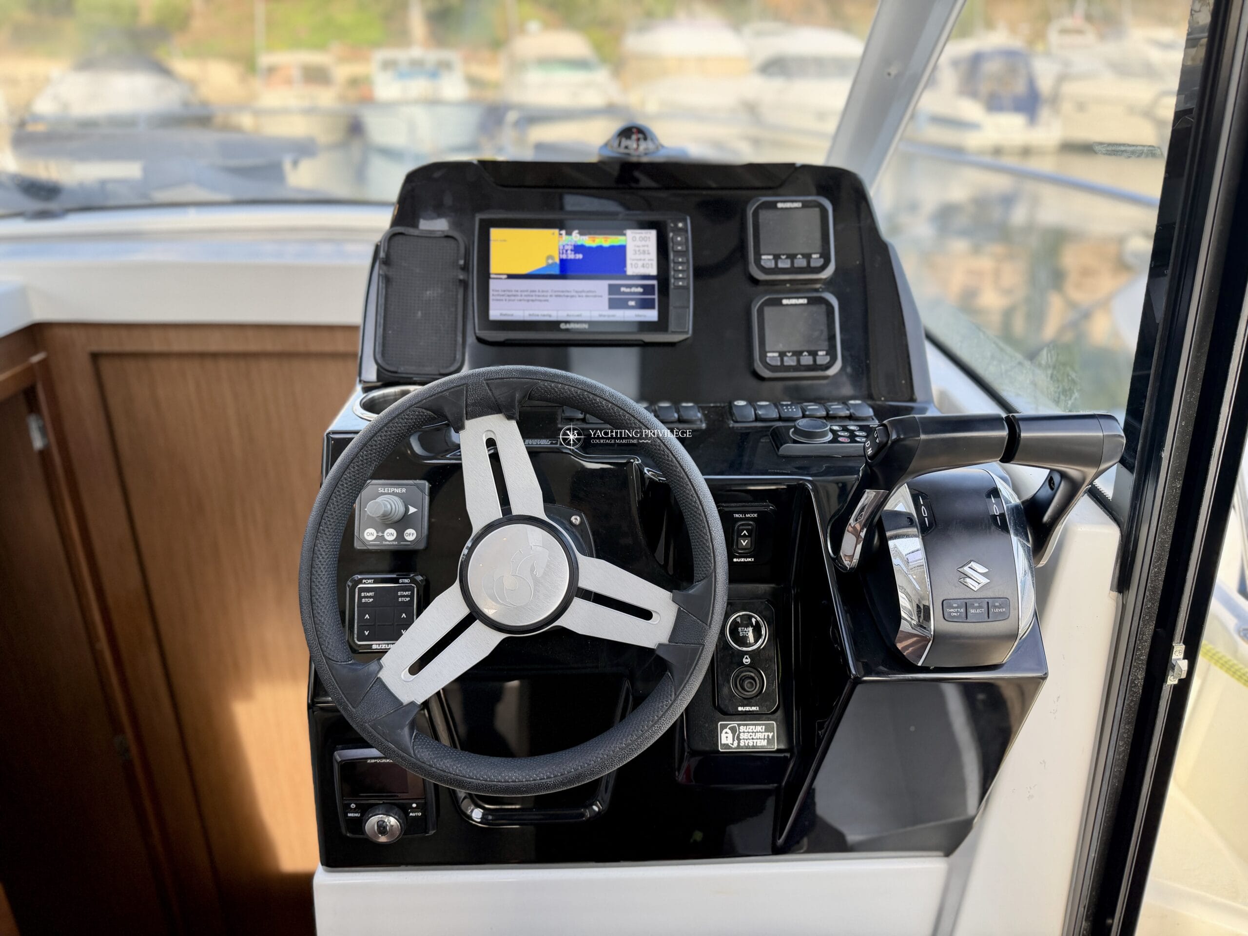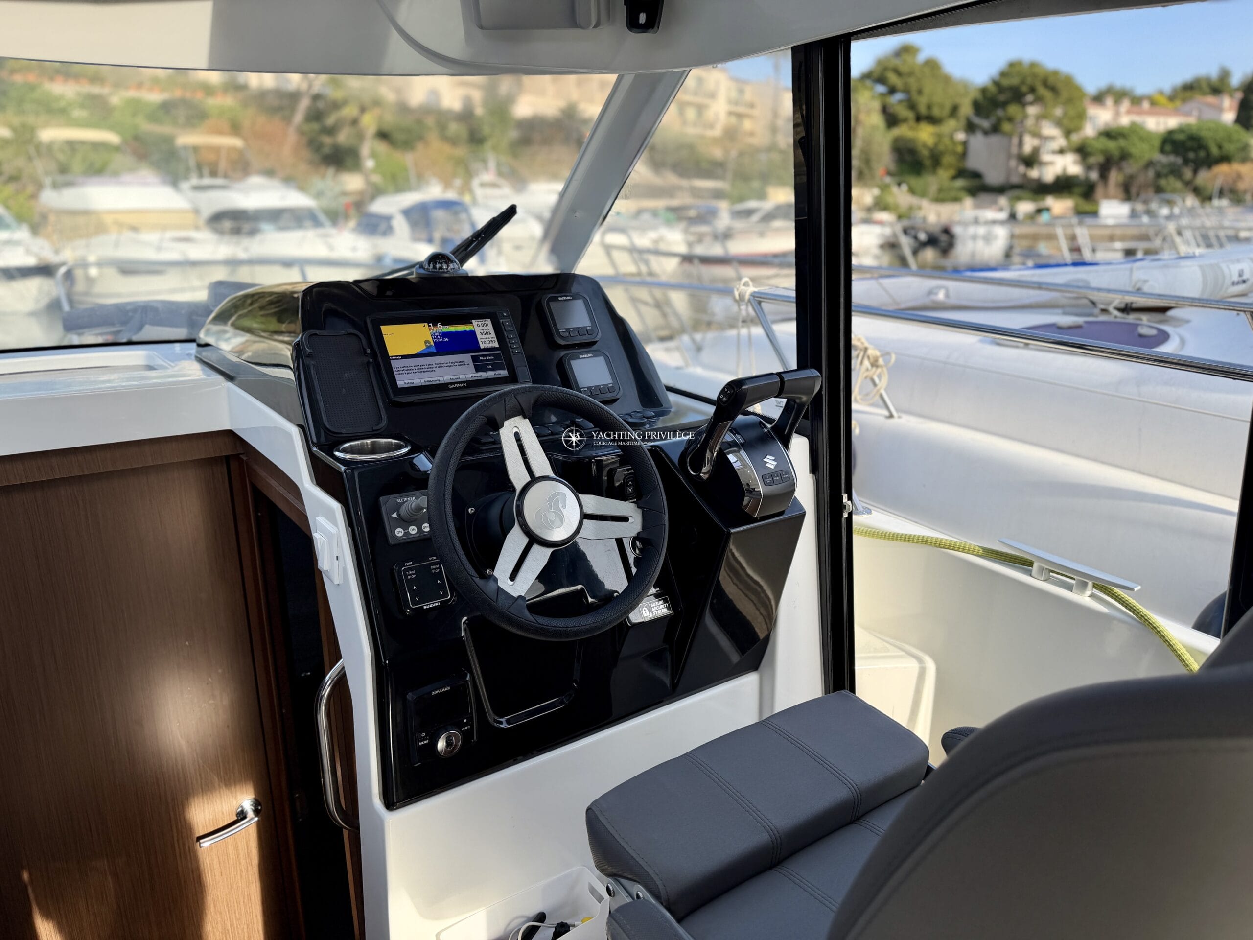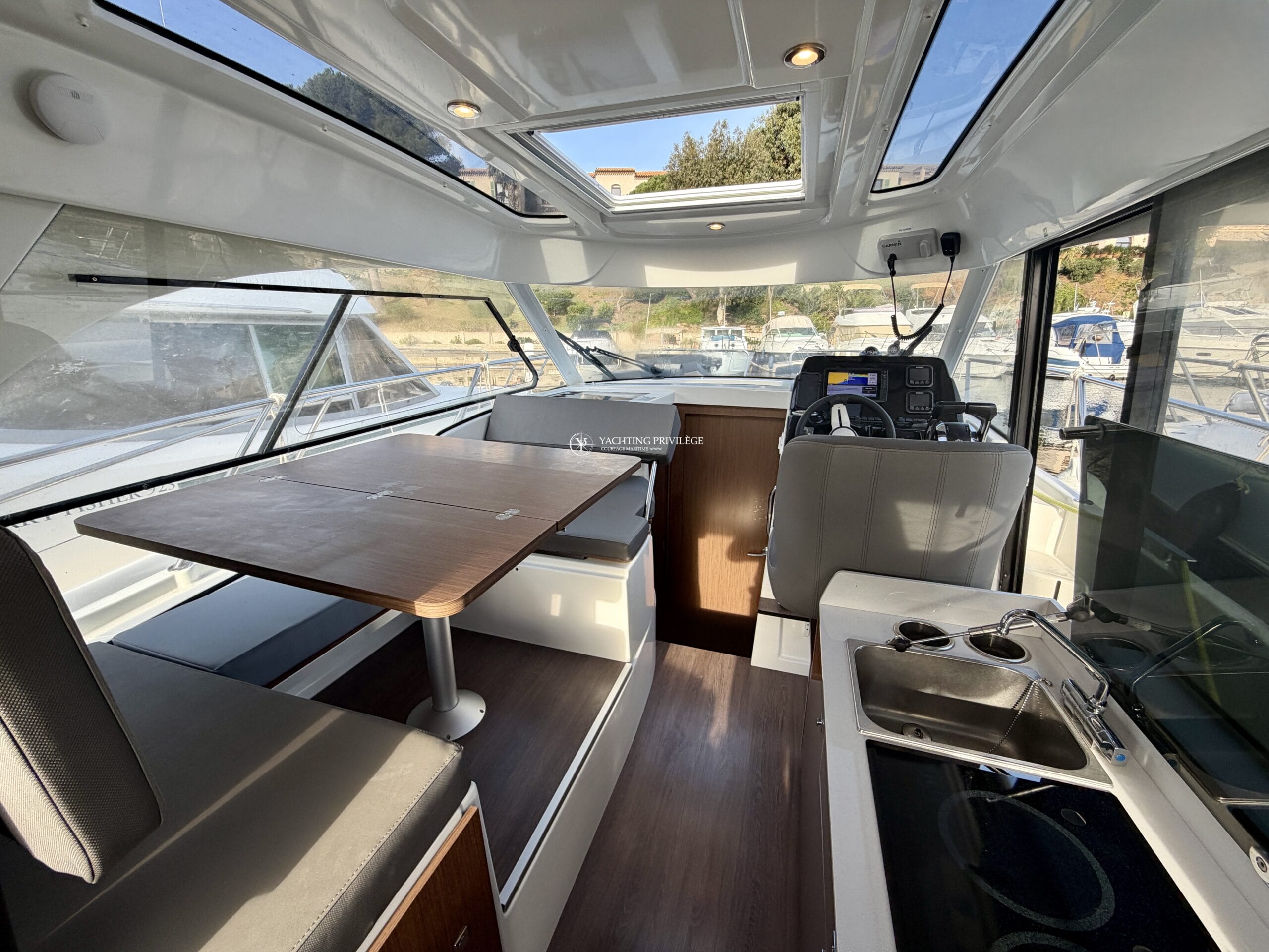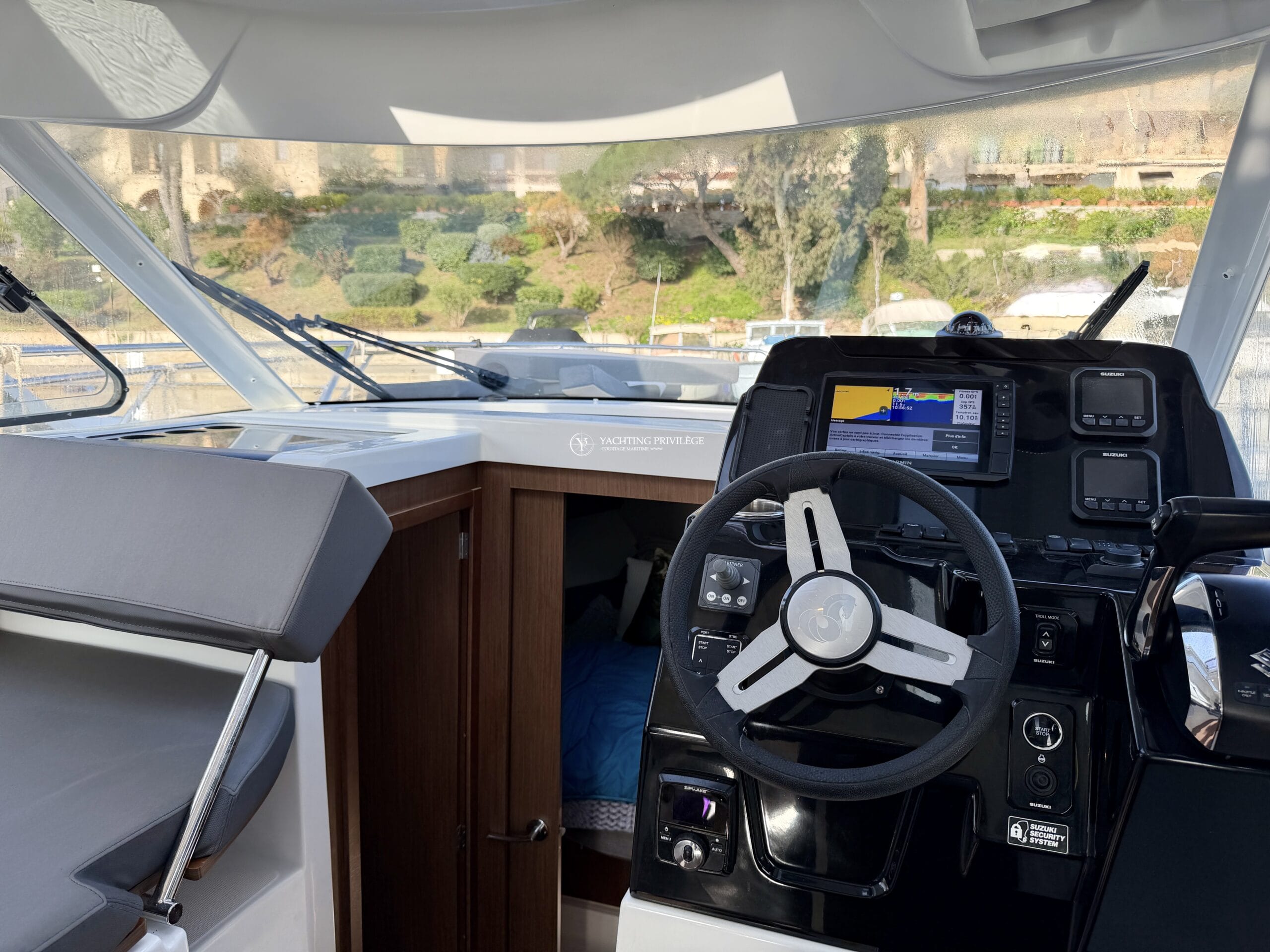 Côté électronique, le navire est équipé d’une VHF Garmin 215i, GPS / sondeur / traceur Garmin Echomap 9", loch-speedomètre, Zipwake…
