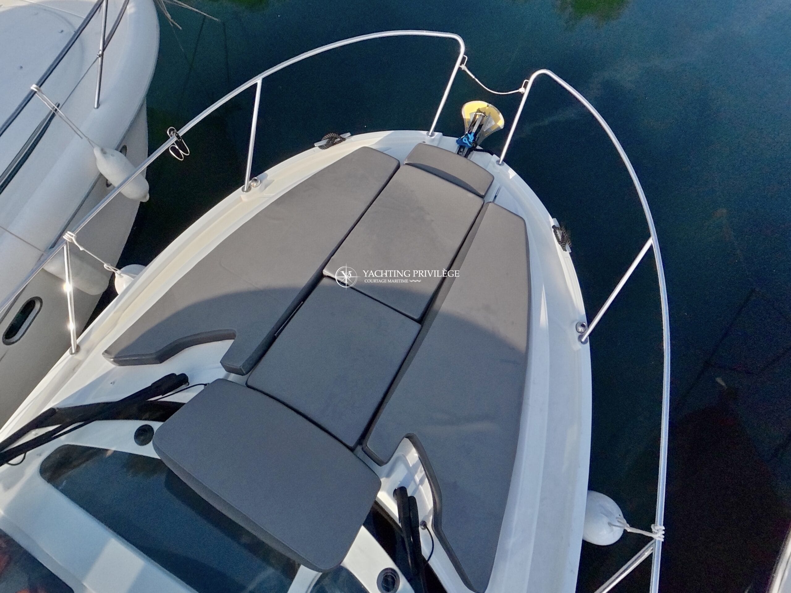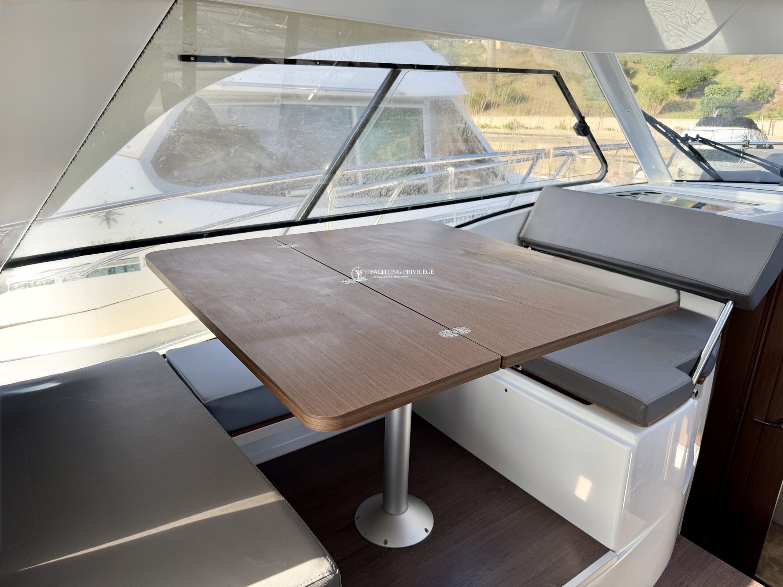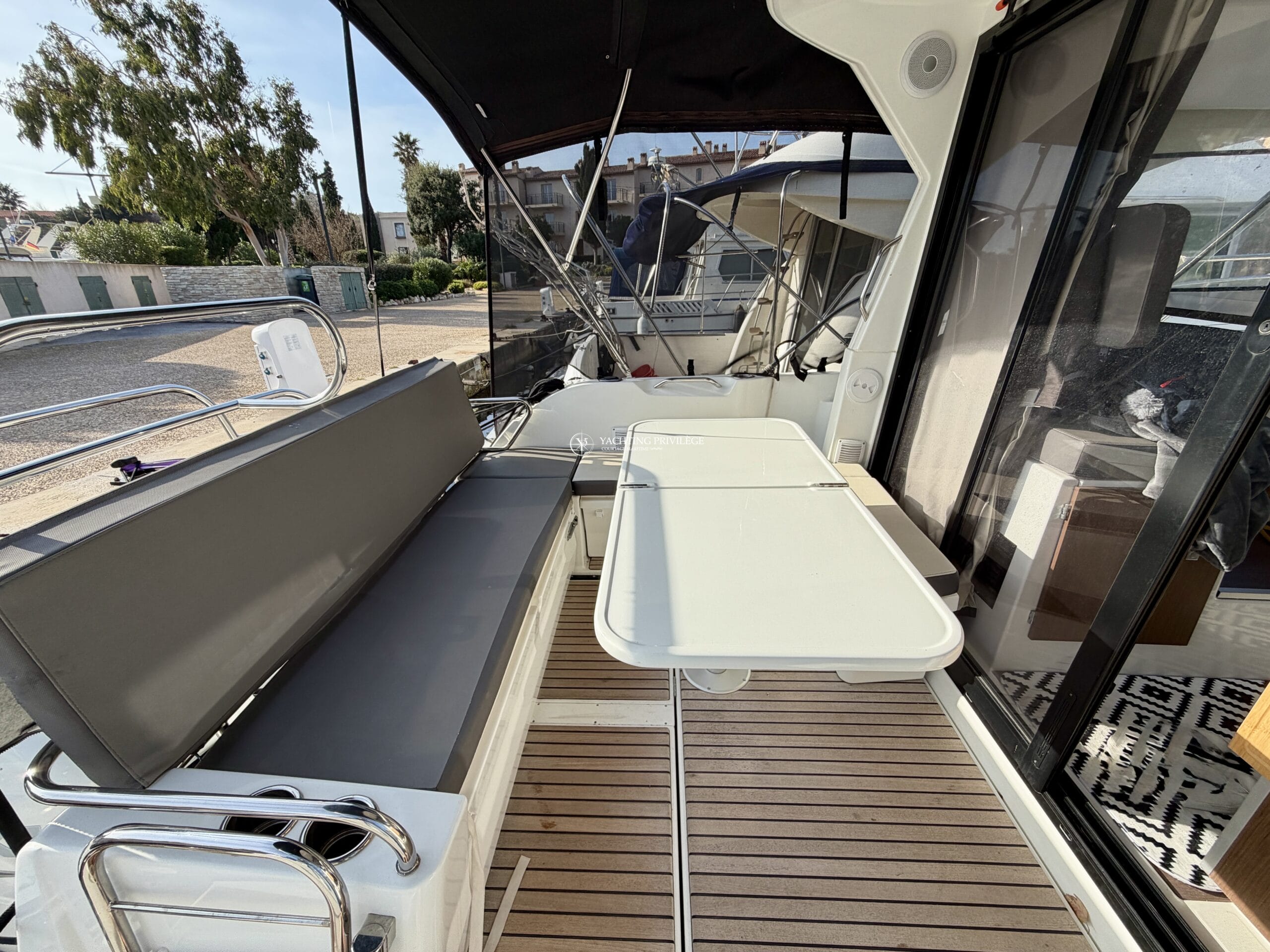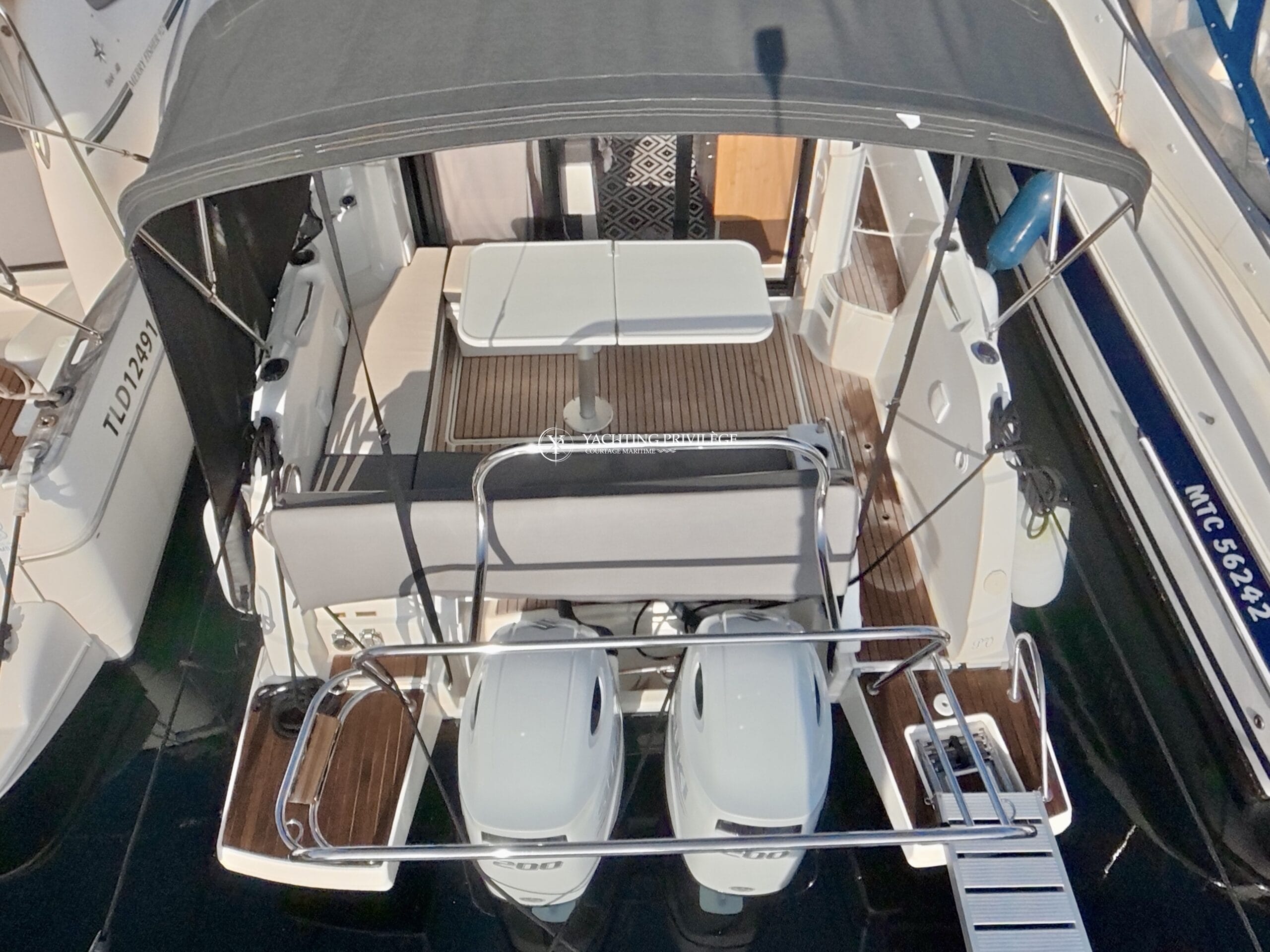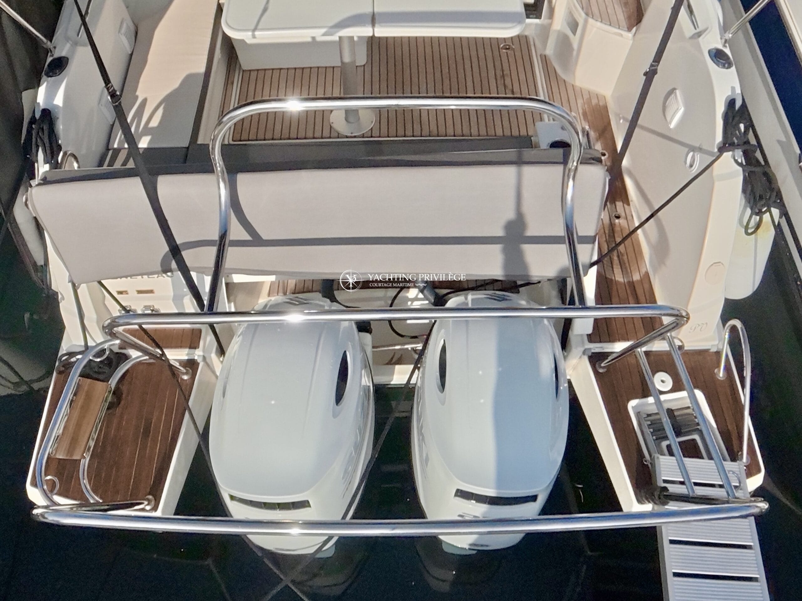 Retrouvez de nombreux équipements et options sur le pont : cockpit en teck, support d’annexe sur mesure, taud de camping (+ taud micro-perforé), bain de soleil avant, guindeau électrique, table de cockpit, passerelle, système Hi-Fi Fusion, taud d’hivernage…
