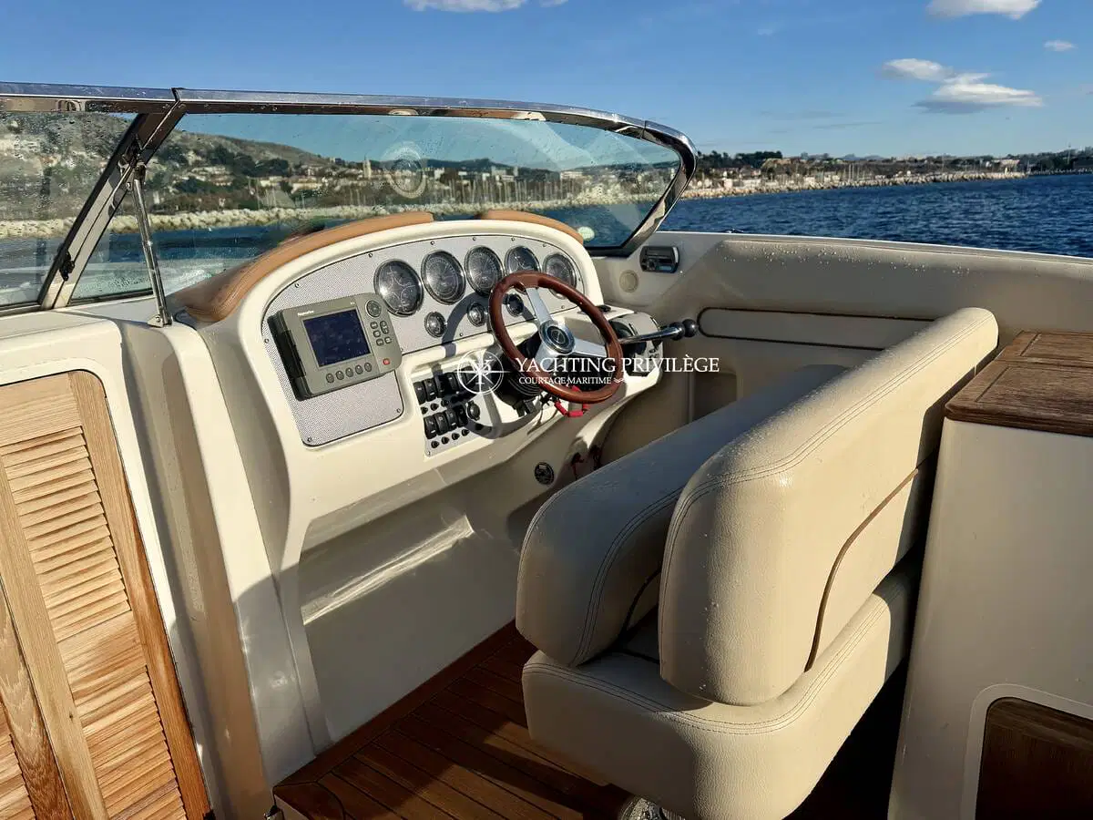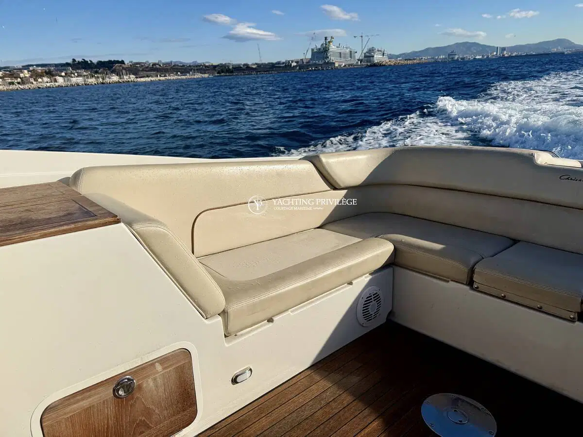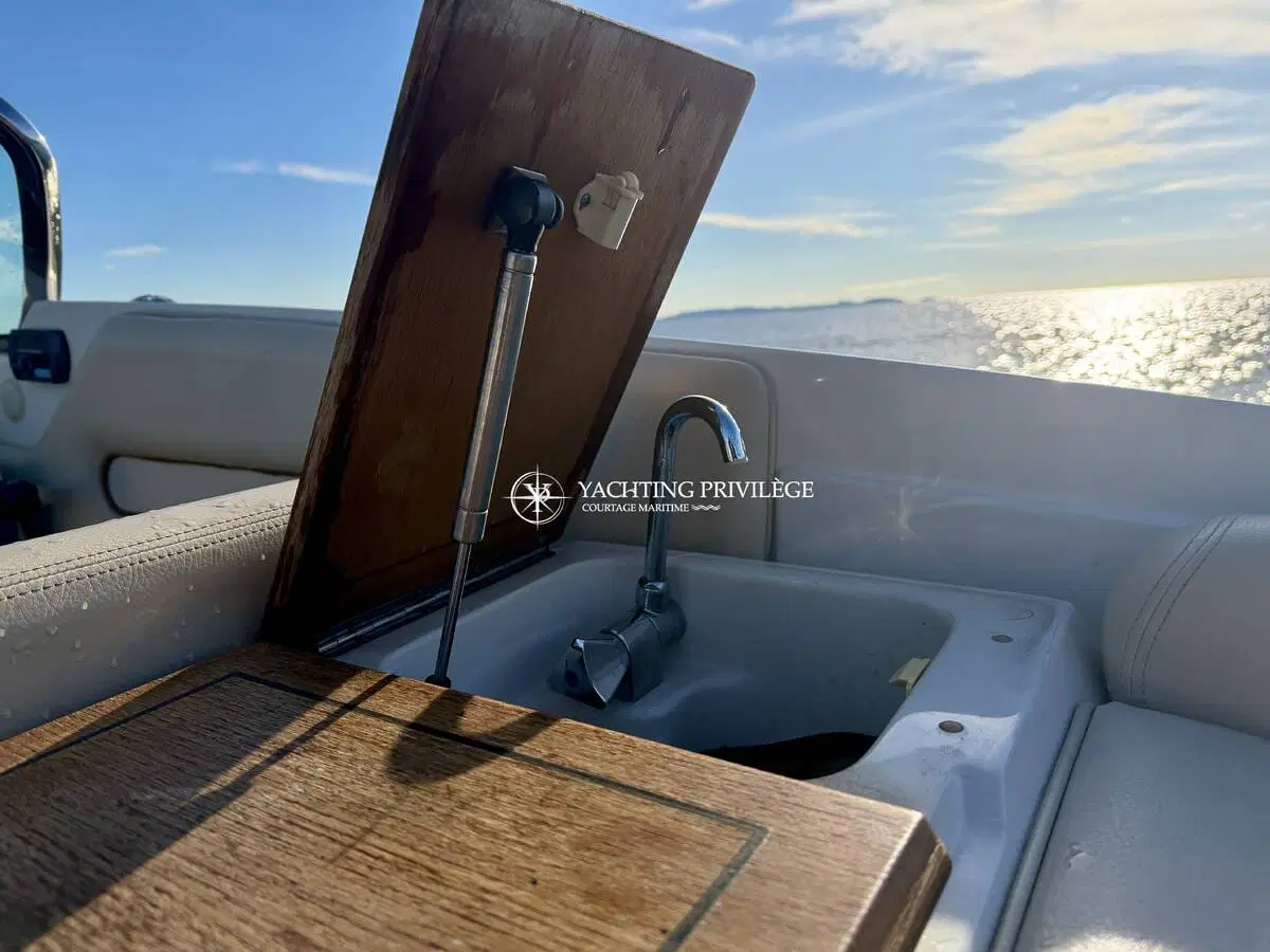 L’équipement comprend un guindeau électrique, une grande plateforme de bain en teck, une douchette de cockpit, une sellerie complète, un bimini selon configuration, une table de cockpit, un système audio et un WC marin. Plusieurs rangements sont intégrés dans les banquettes et sous le cockpit.