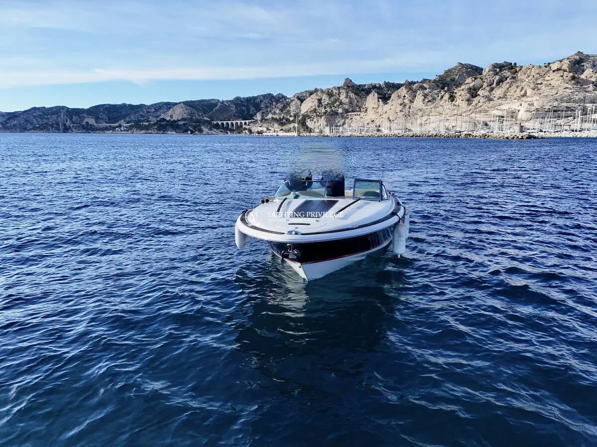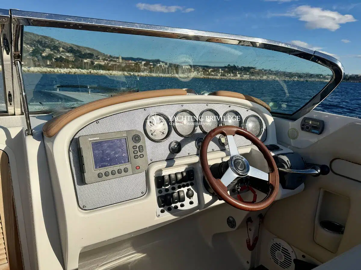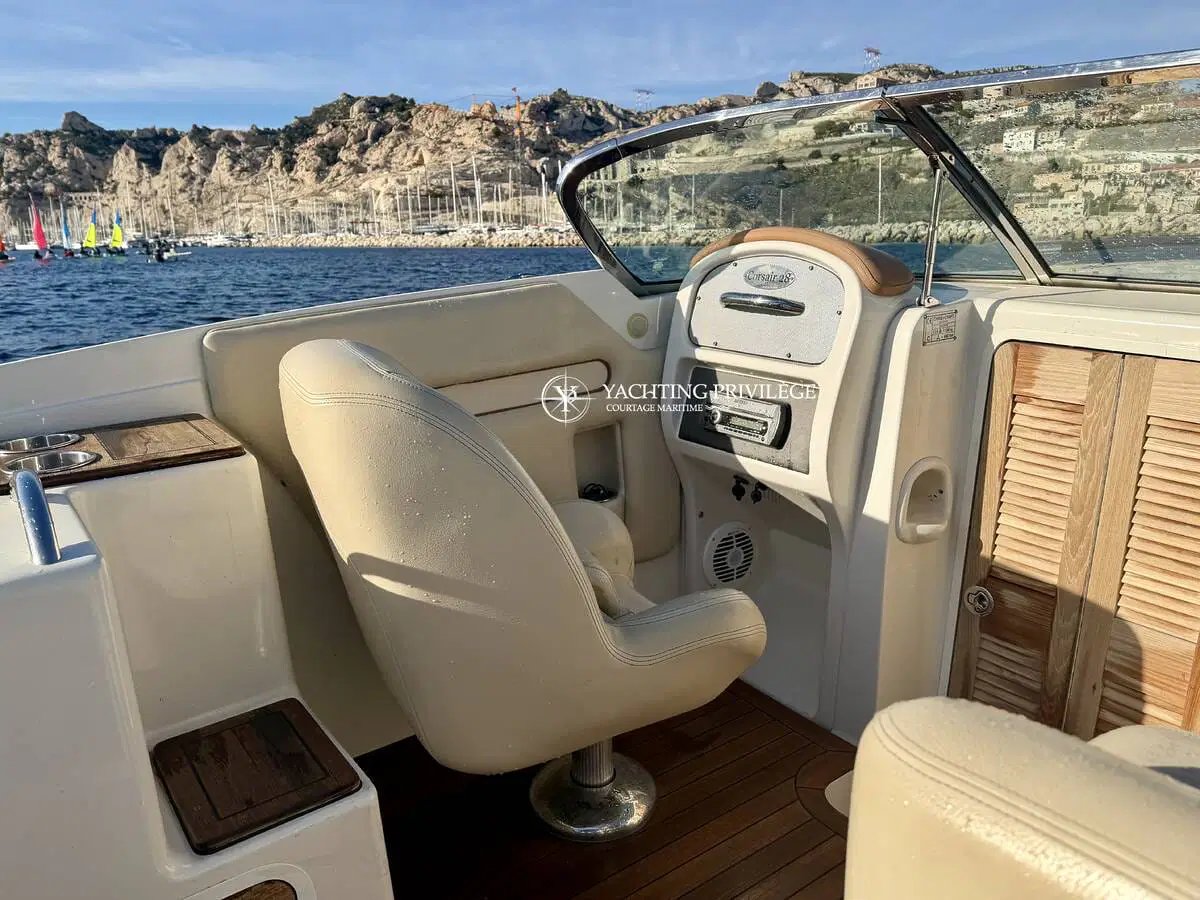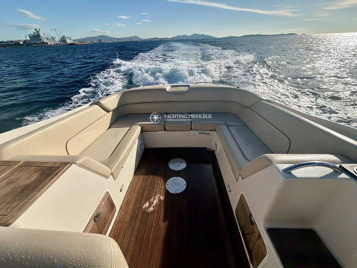 L’équipement comprend un guindeau électrique, une grande plateforme de bain en teck, une douchette de cockpit, une sellerie complète, un bimini selon configuration, une table de cockpit, un système audio et un WC marin. Plusieurs rangements sont intégrés dans les banquettes et sous le cockpit.