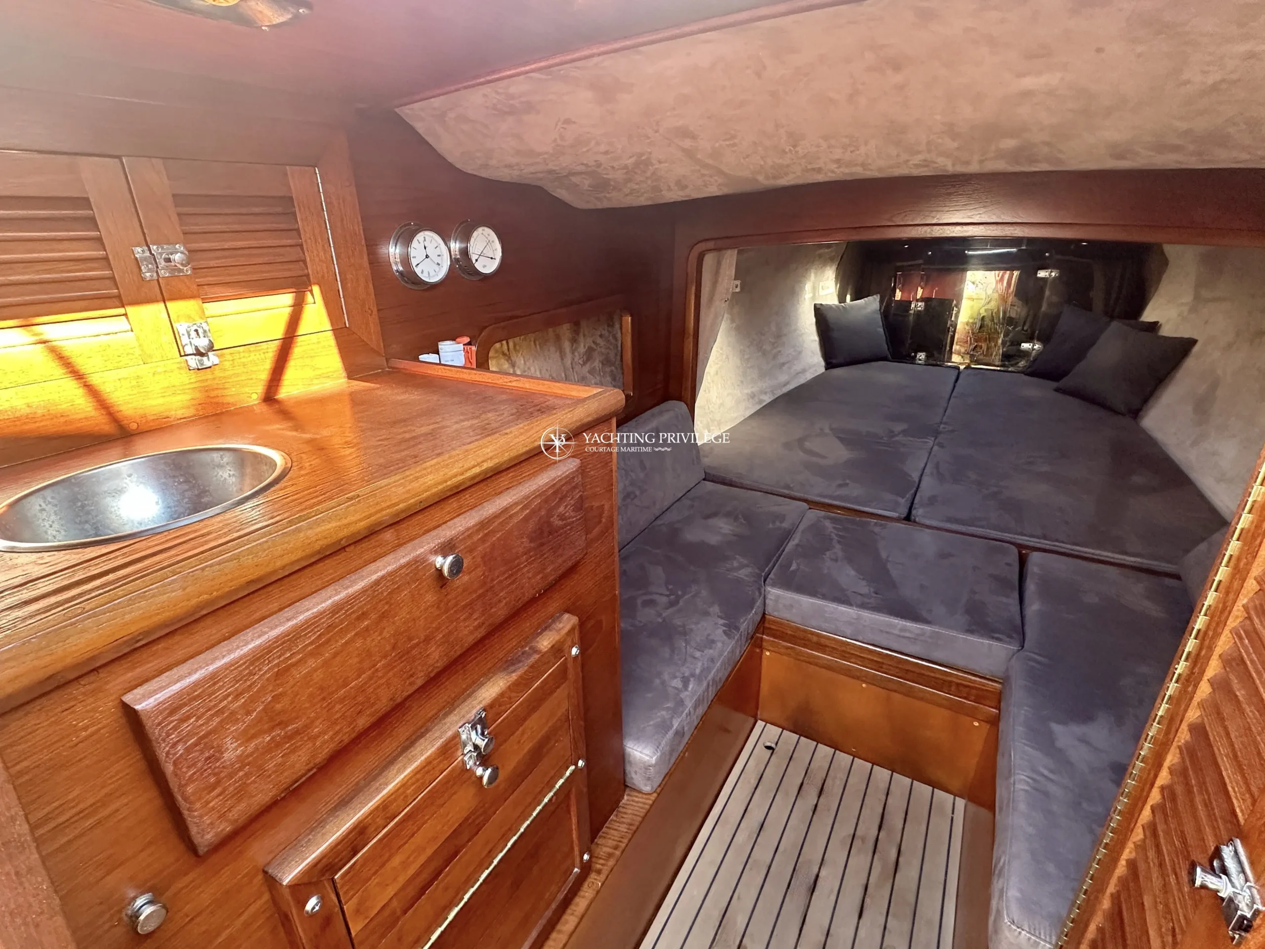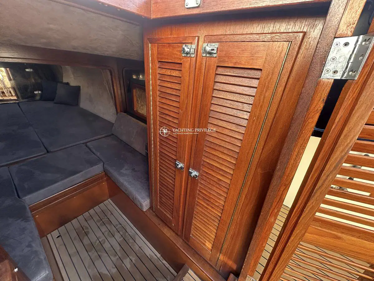 Gps sondeur Garmin, douchette de cockpit, revêtement de cockpit en flexiteck, guindeau électrique, une cabine, 2/3 couchages, voile d’ombrage sur mâts, taud de camping, taud d’été, taud d’hivernage.