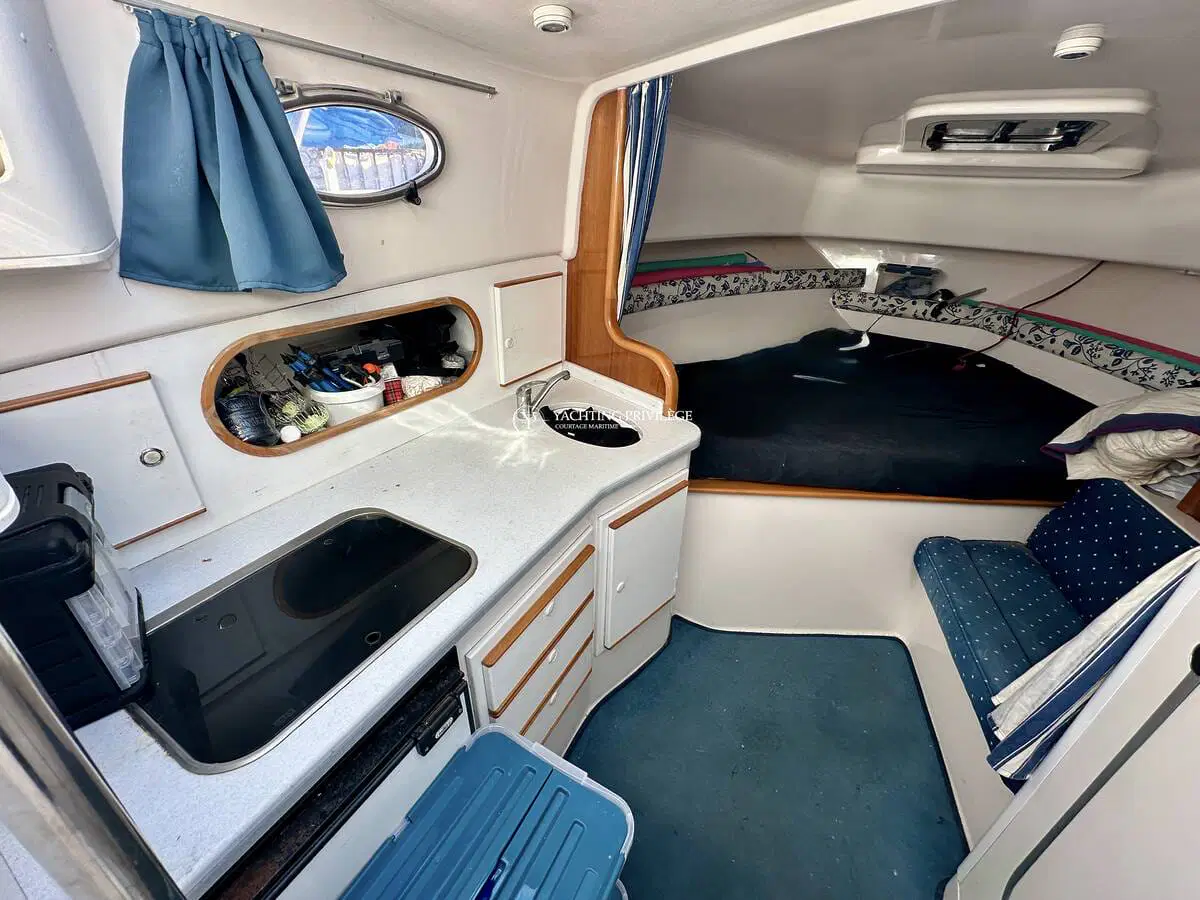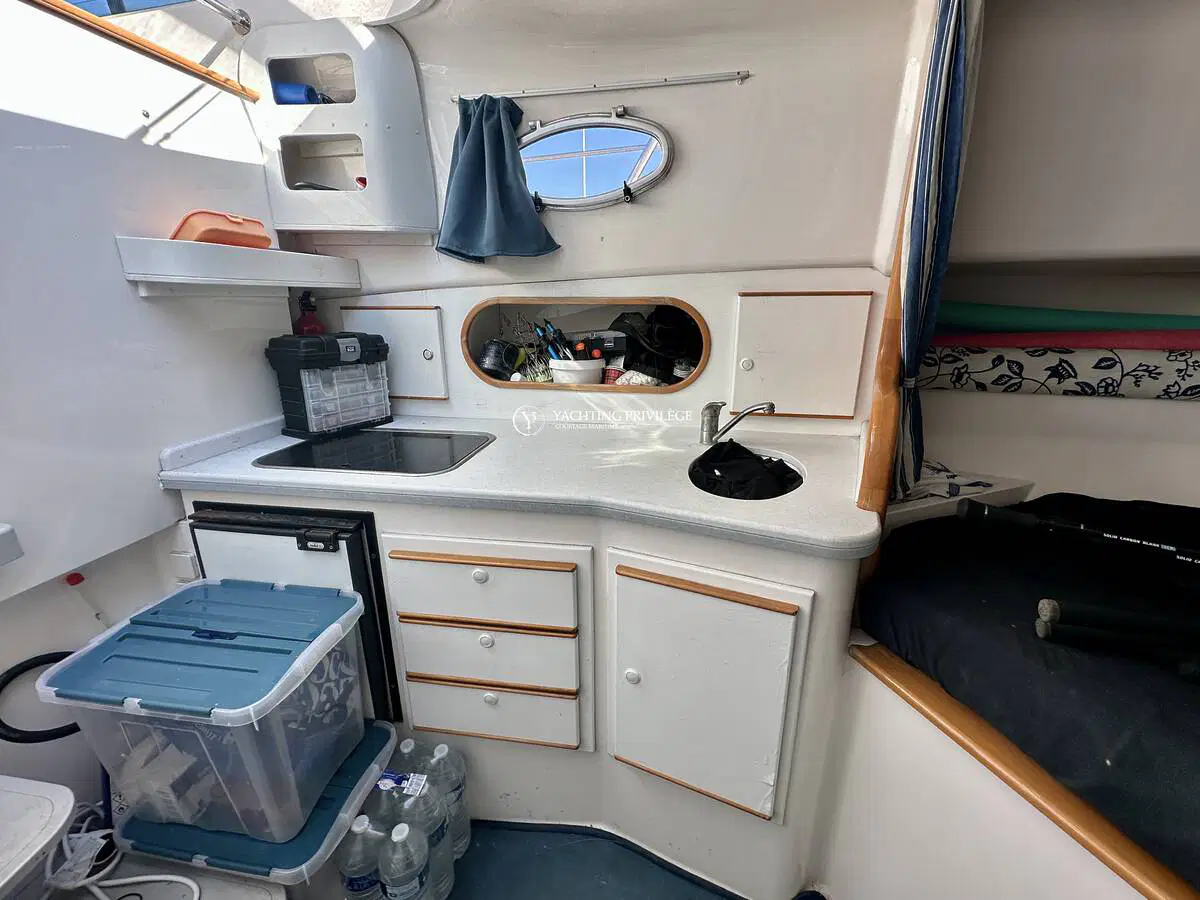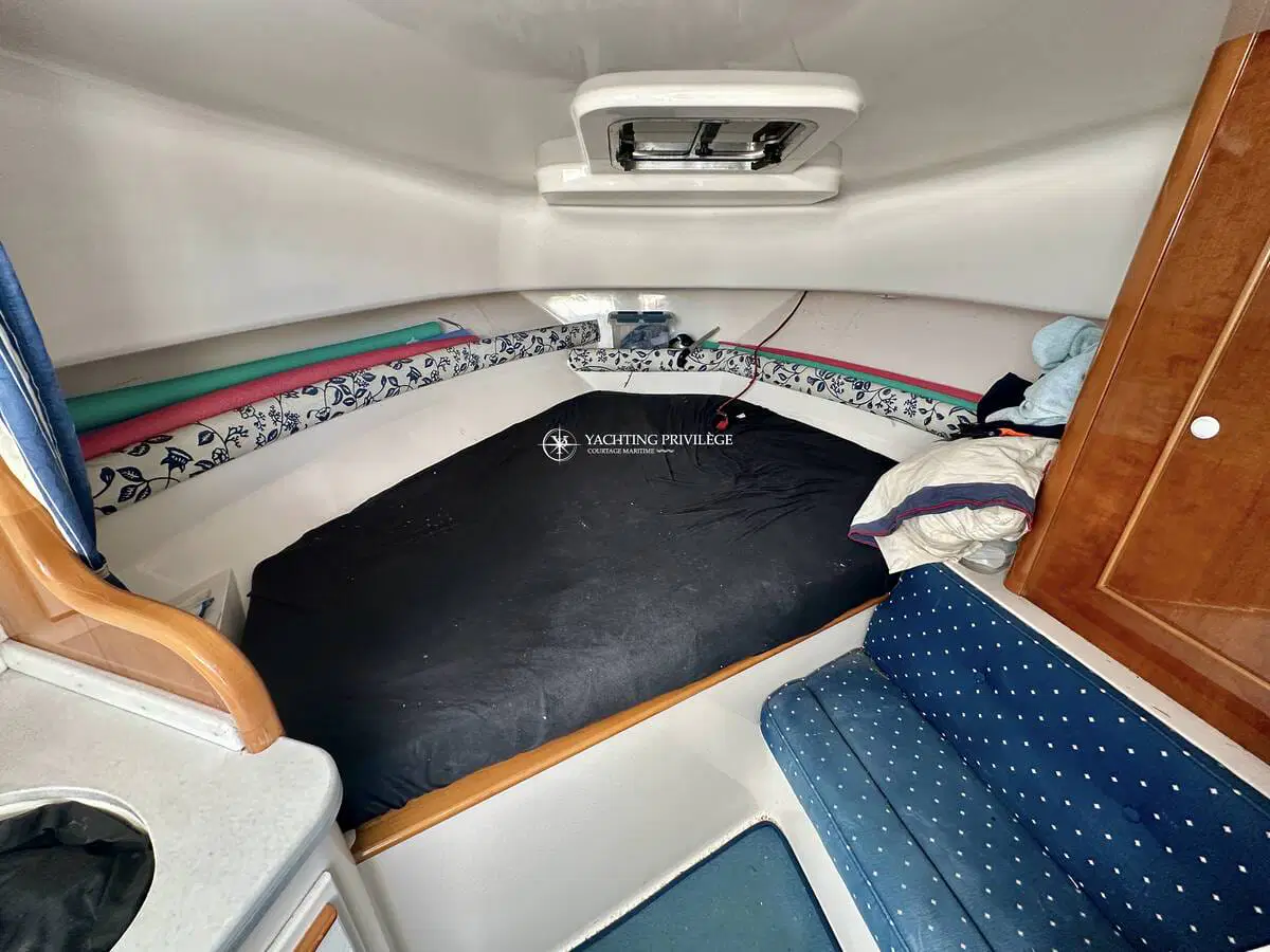 Il dispose d’une cabine avec couchage double, d’une cuisine équipée (réfrigérateur, cuisinière) ainsi que d’une salle d’eau avec WC et douche. Le carré lumineux et panoramique offre une belle habitabilité, complété par un grand cockpit et une vaste plateforme de bain elle même équipée d’une chaise de combat.