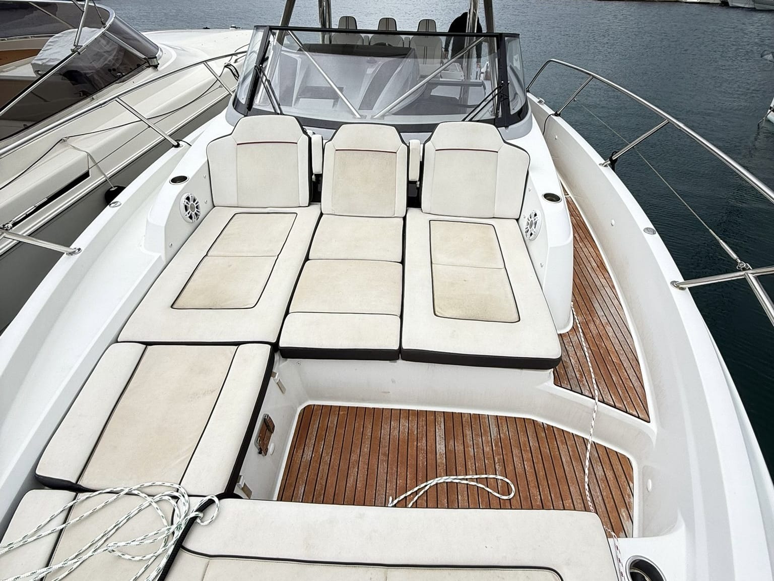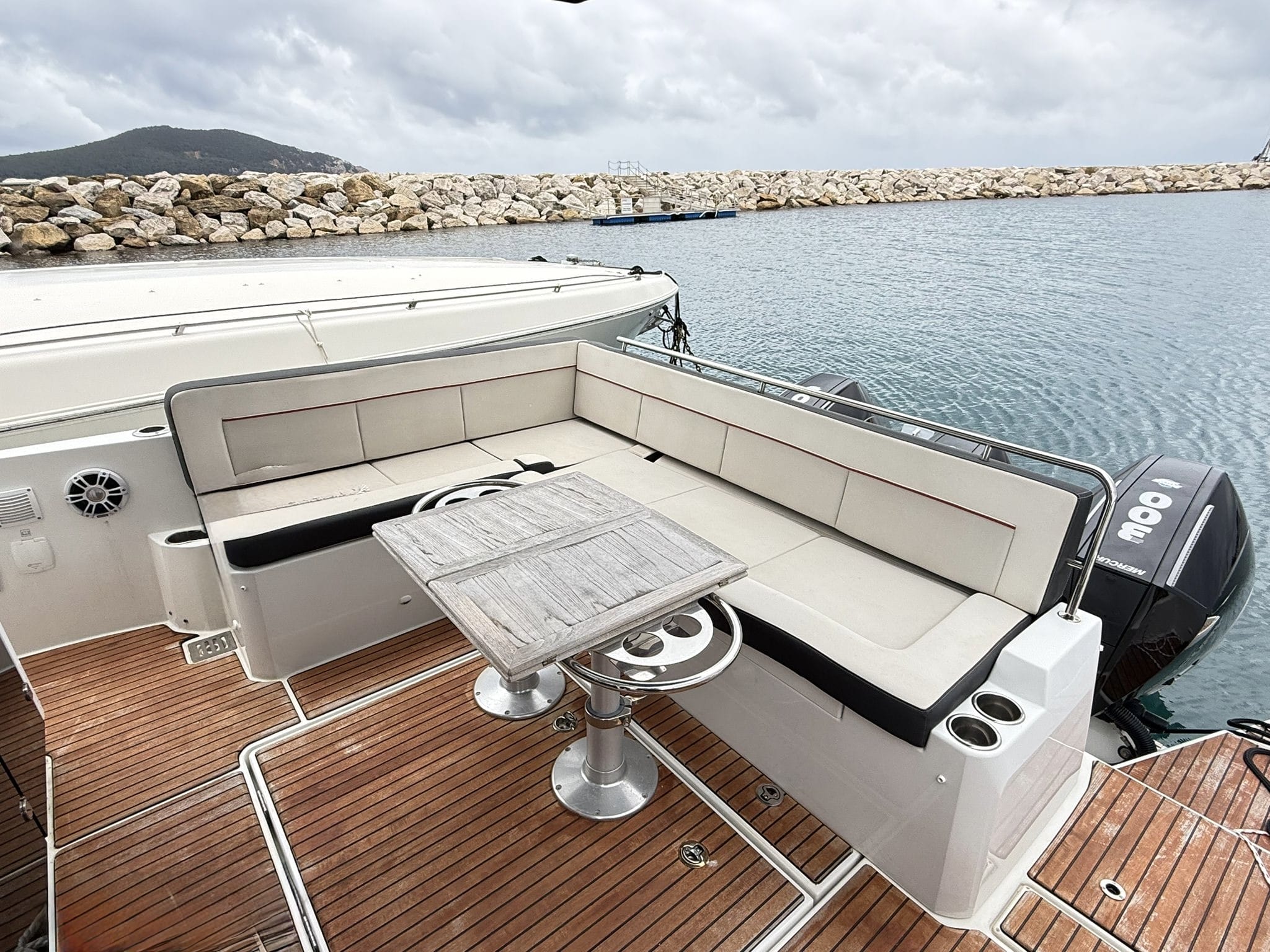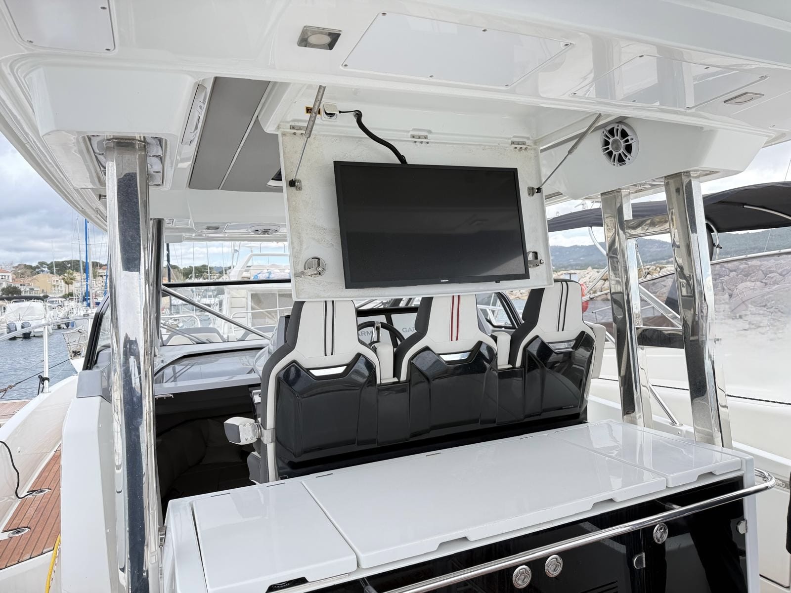 Côté équipements extérieurs, il dispose d’un T-Top avec toit ouvrant électrique, d’un voile d’ombrage avant, bain de soleil, cockpit en teck, ainsi que d’une cuisine extérieure complète avec évier, plancha et réfrigérateur. Un mât de ski pour vos activités nautiques, ainsi qu'un éclairage sous-marin pour profiter pleinement de vos soirées dans une ambiance unique au mouillage.