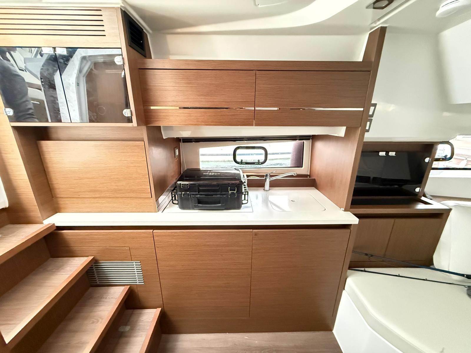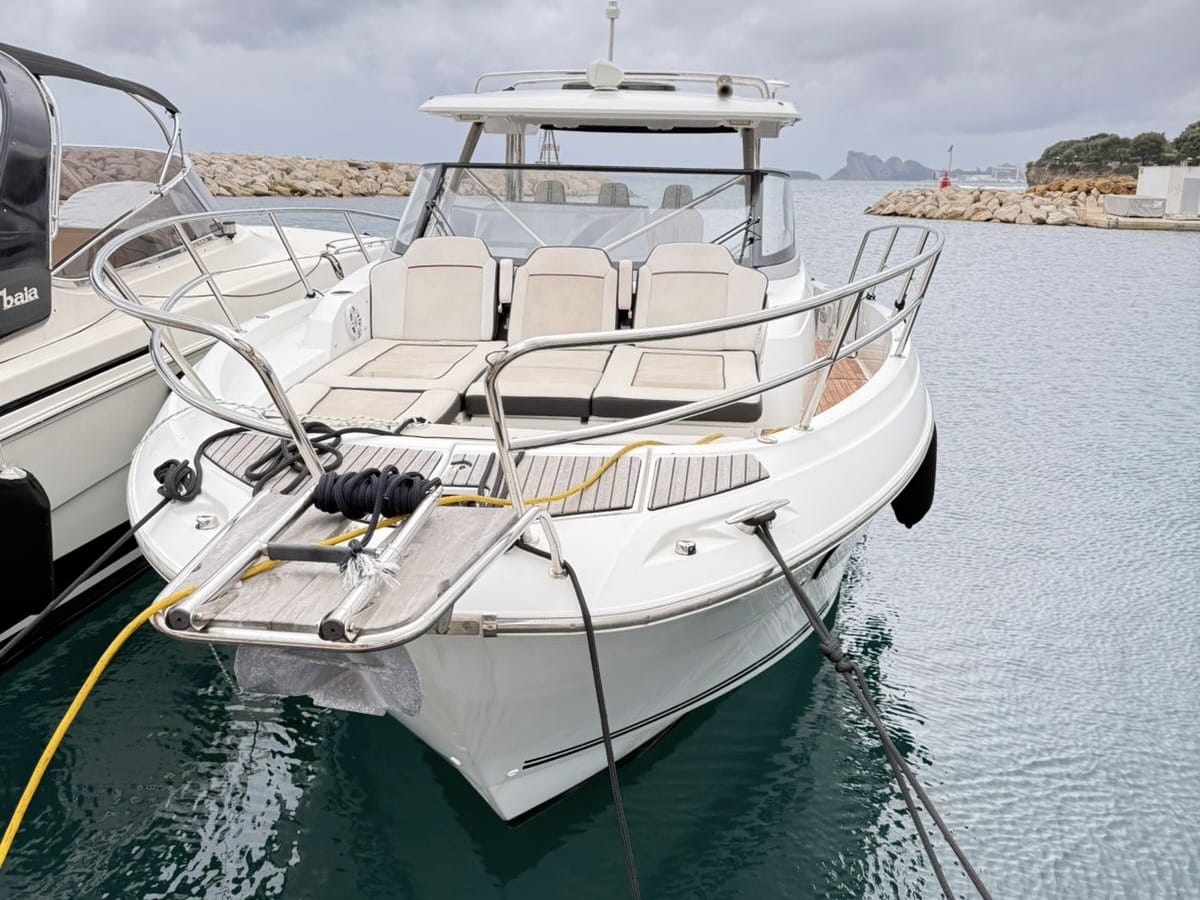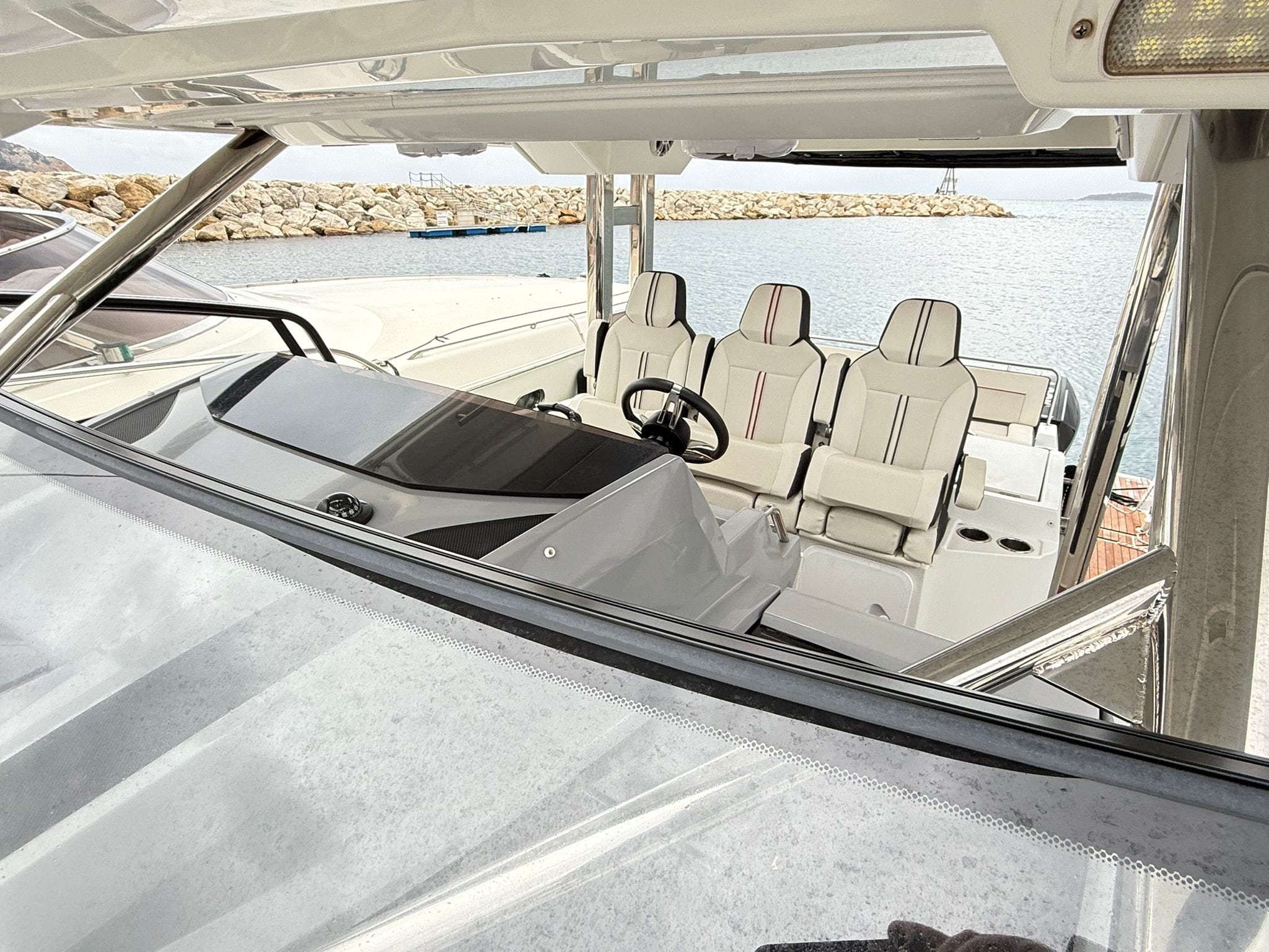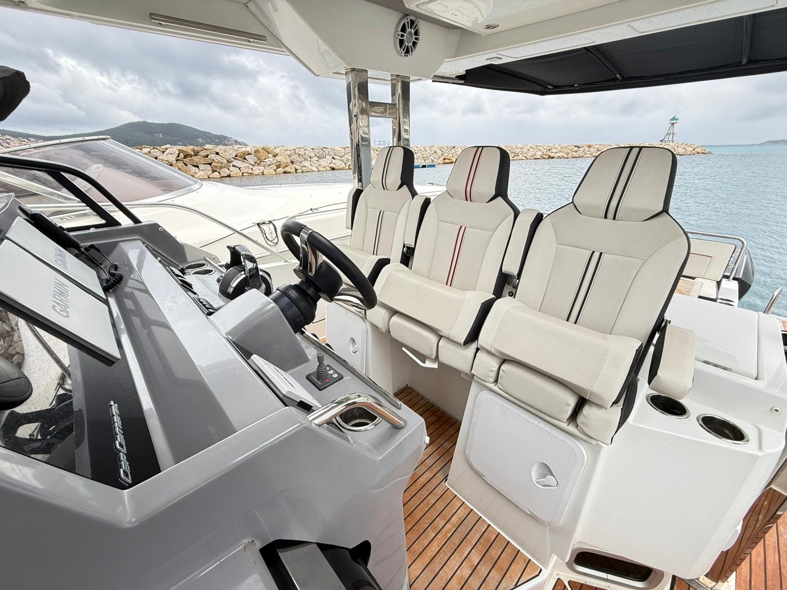 Côté équipements extérieurs, il dispose d’un T-Top avec toit ouvrant électrique, d’un voile d’ombrage avant, bain de soleil, cockpit en teck, ainsi que d’une cuisine extérieure complète avec évier, plancha et réfrigérateur. Un mât de ski pour vos activités nautiques, ainsi qu'un éclairage sous-marin pour profiter pleinement de vos soirées dans une ambiance unique au mouillage.