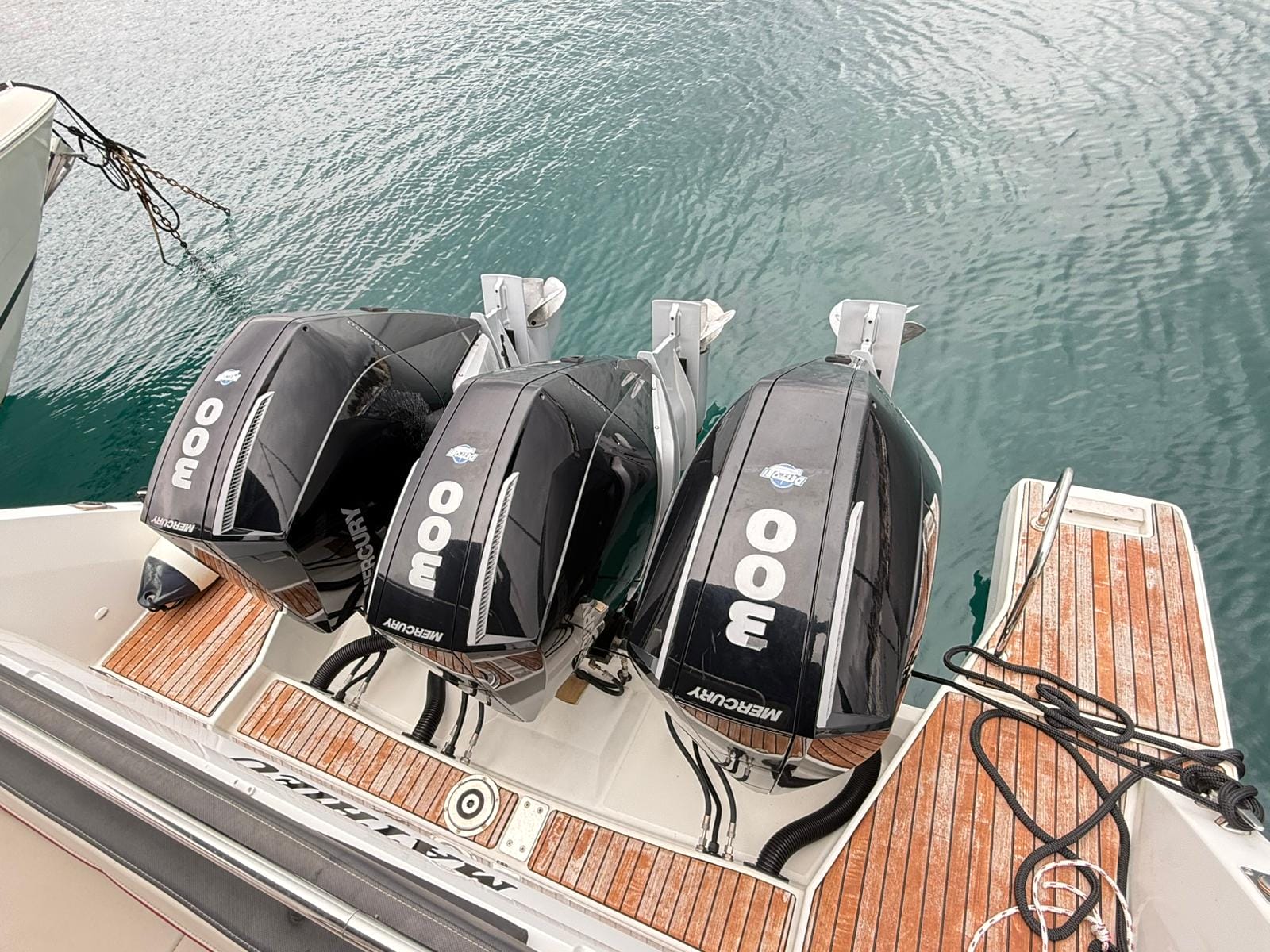 Ce bateau est équipé d’une motorisation Mercury verado V8, 3x300cv , totalisant seulement 160 heures de navigation. Cette configuration offre des performances remarquables, une excellente maniabilité et un grand confort de navigation.
