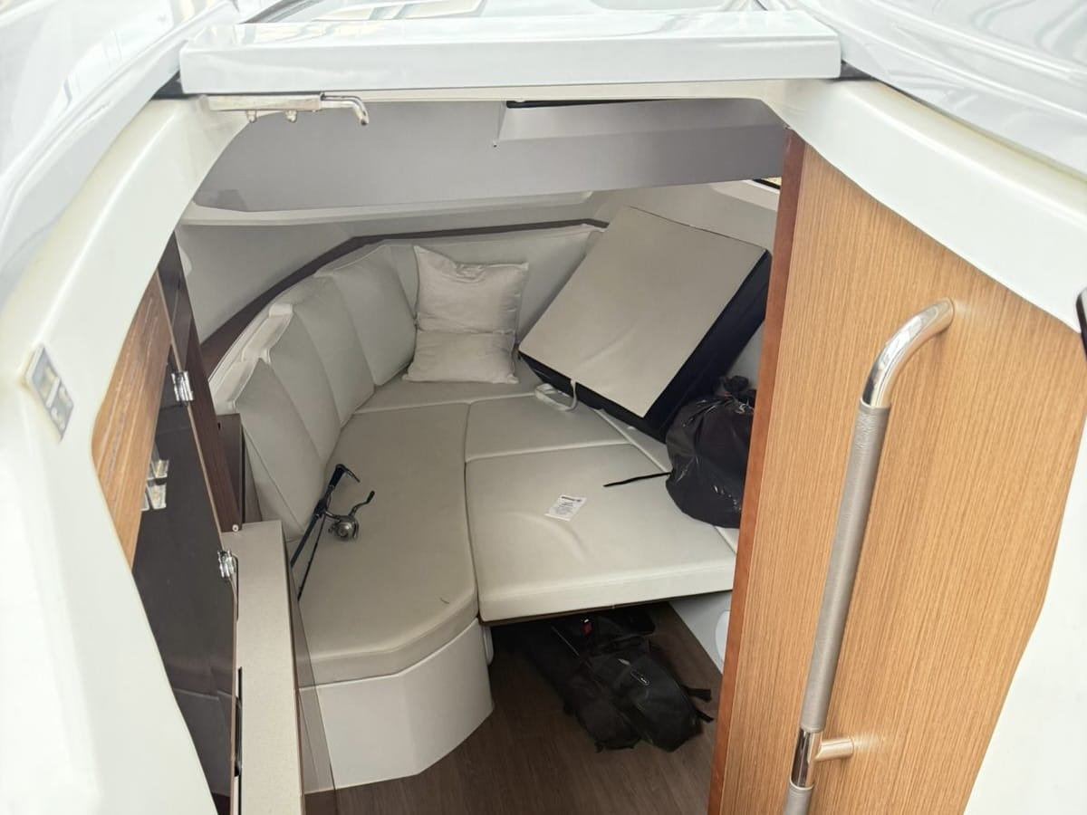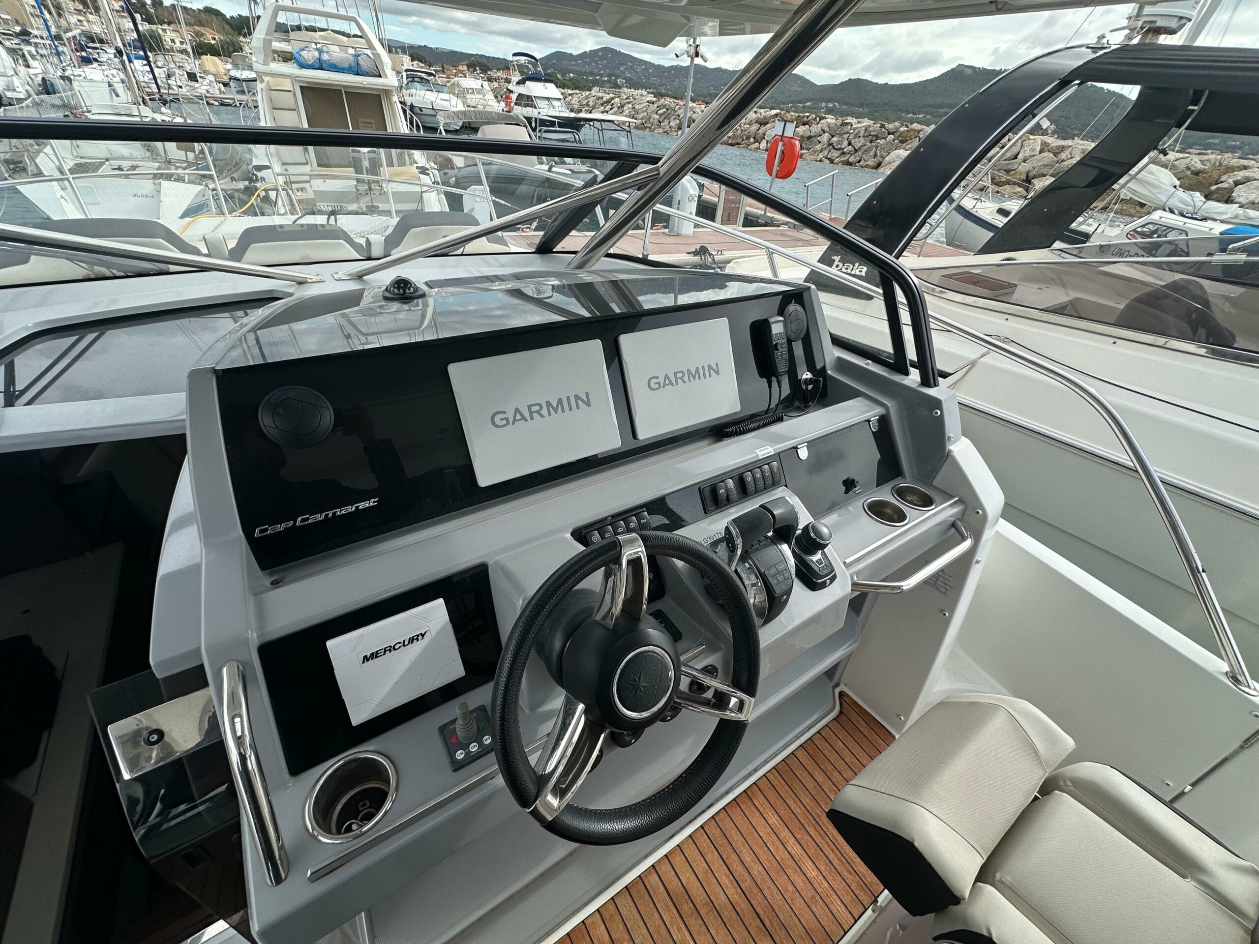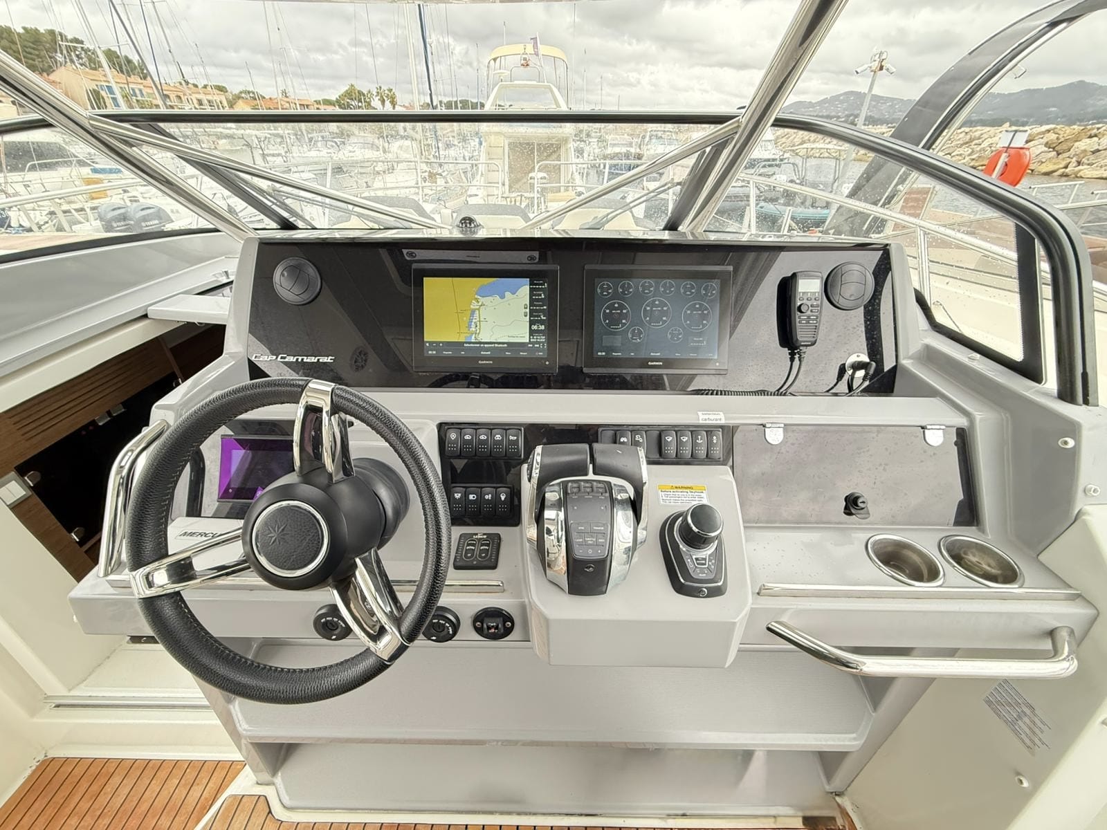 À l’intérieur, le Cap Camarat 12.5 WA propose un aménagement moderne, lumineux et particulièrement confortable. Le bateau dispose d'une belle cabine, d’un carré intérieur transformable, ainsi que d’une salle d’eau spacieuse avec douche et WC. Les volumes sont généreux pour un bateau de cette catégorie et les finitions sont de grande qualité, offrant un véritable confort.