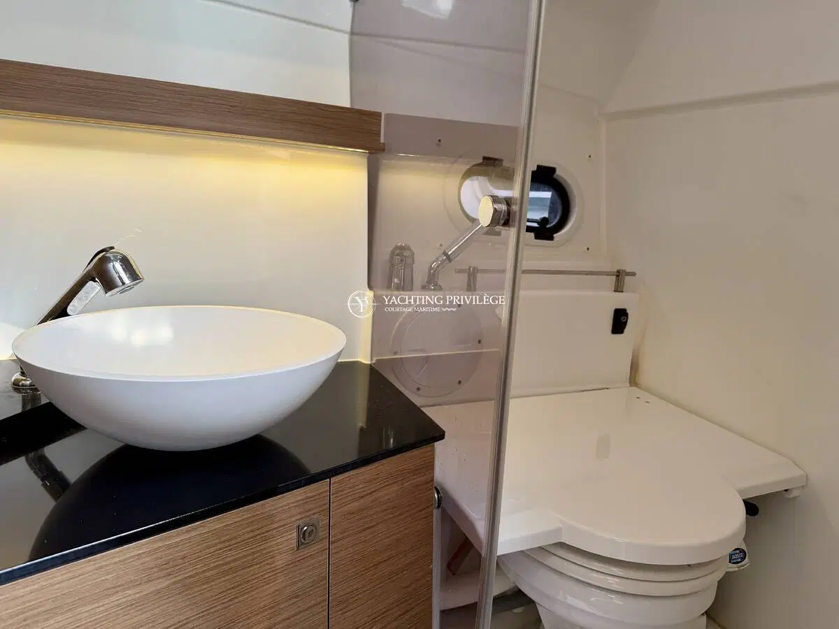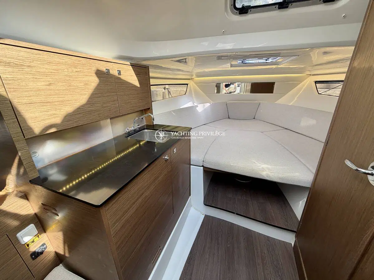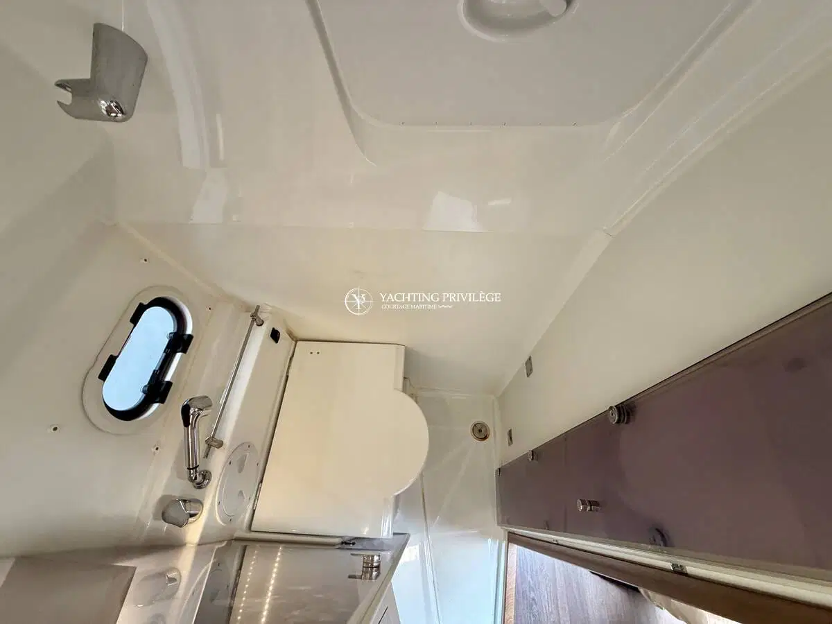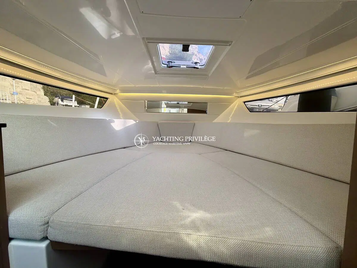 L’aménagement intérieur propose un espace lumineux et fonctionnel, comprenant un couchage double à l’avant, une mid-cabin complémentaire, un coin cuisine, ainsi que des toilettes séparées. L’ensemble permet d’envisager aussi bien les sorties à la journée que de petites croisières côtières en tout confort.