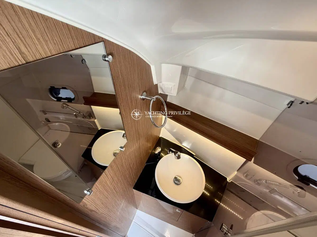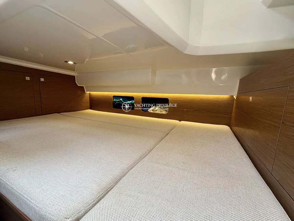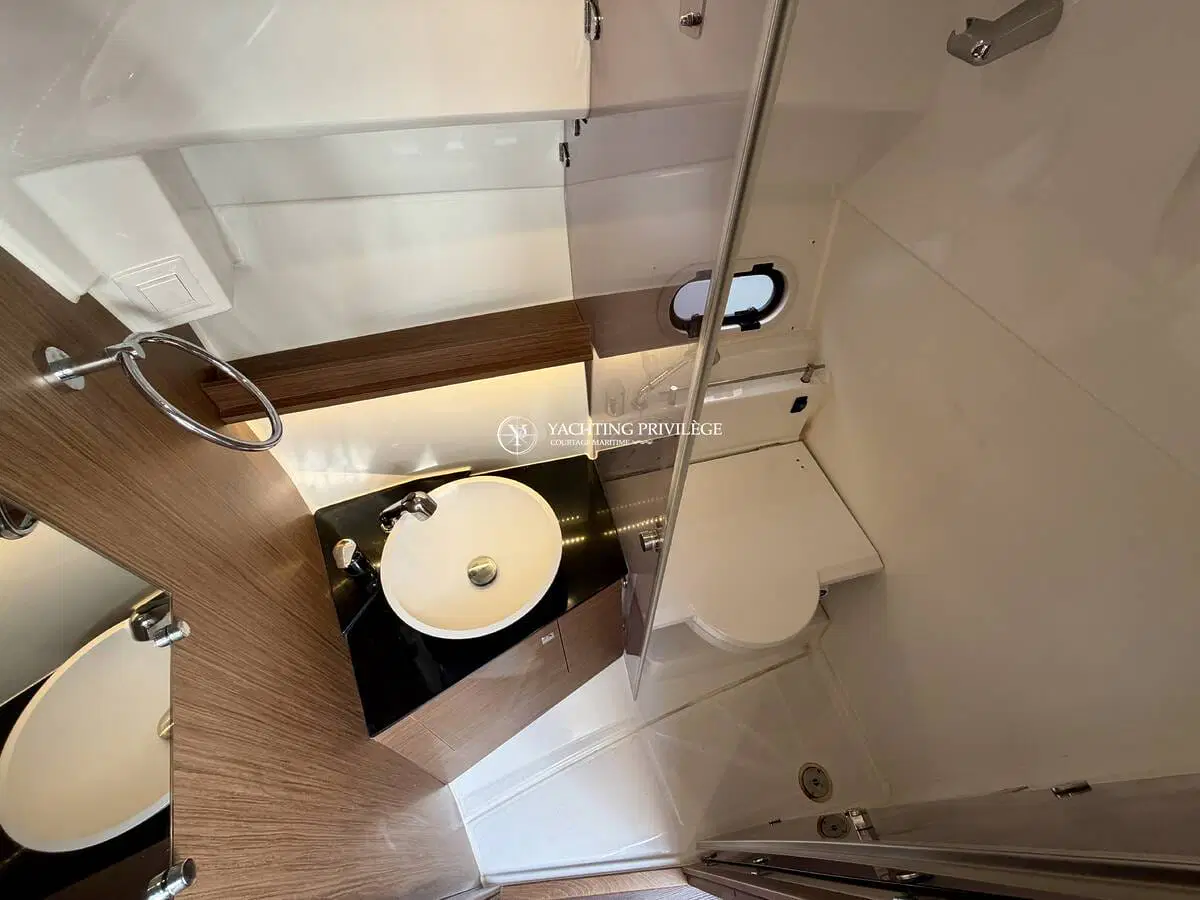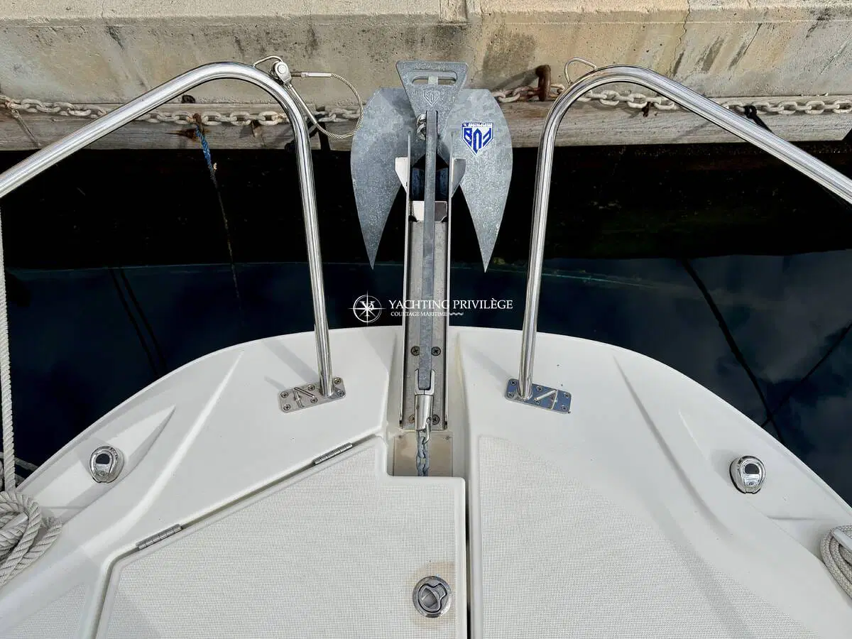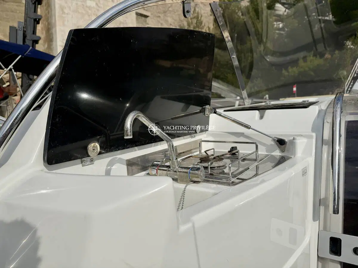 L’aménagement intérieur propose un espace lumineux et fonctionnel, comprenant un couchage double à l’avant, une mid-cabin complémentaire, un coin cuisine, ainsi que des toilettes séparées. L’ensemble permet d’envisager aussi bien les sorties à la journée que de petites croisières côtières en tout confort.