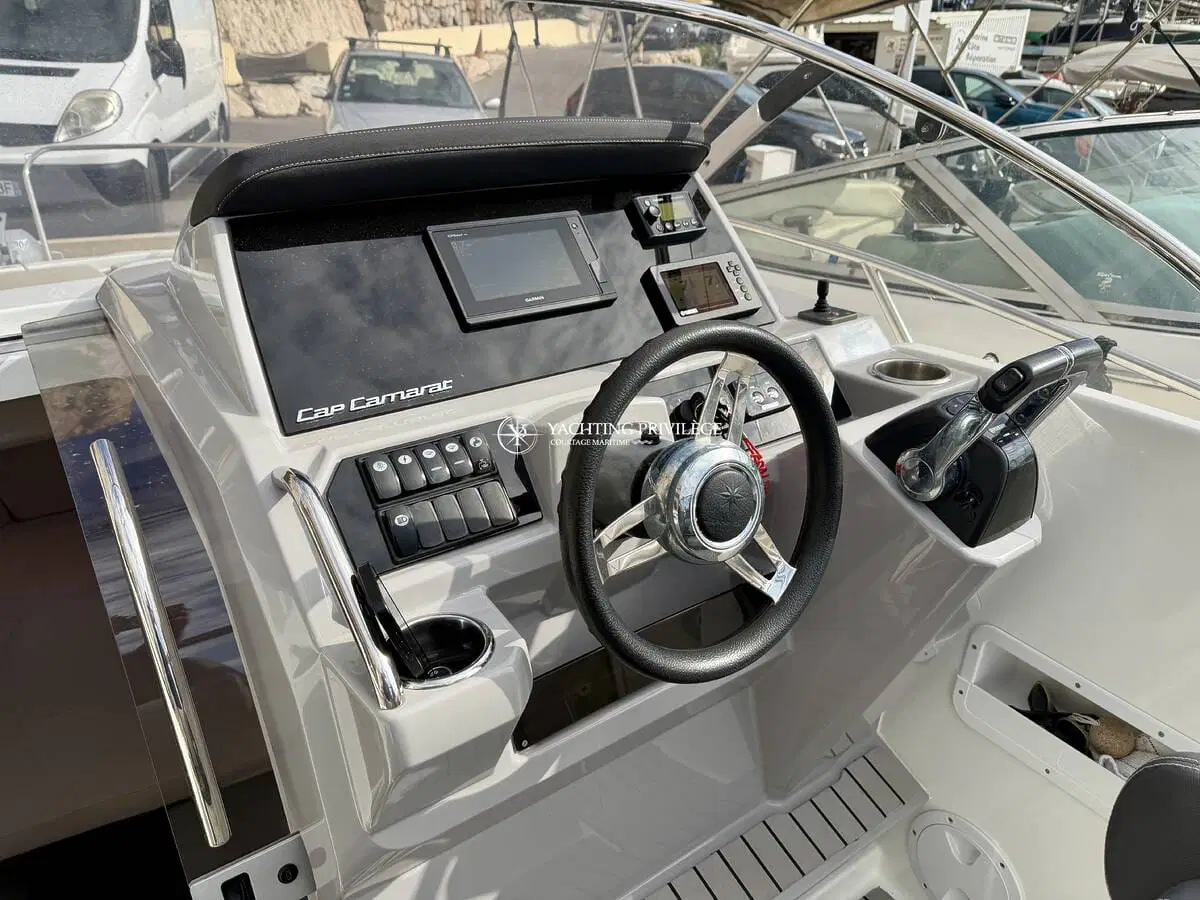 Homologué en catégorie C, ce Cap Camarat peut accueillir jusqu’à 10 personnes en navigation. Son état, et ses faibles heures de fonctionnement en font une unité particulièrement soignée et prête à naviguer.