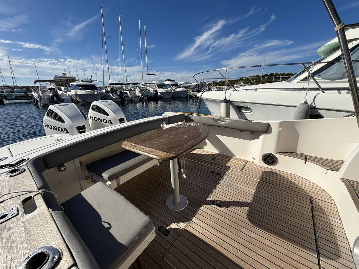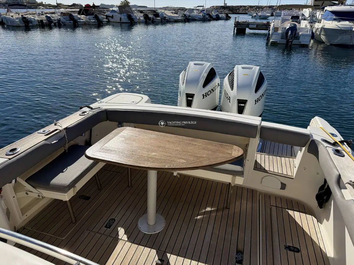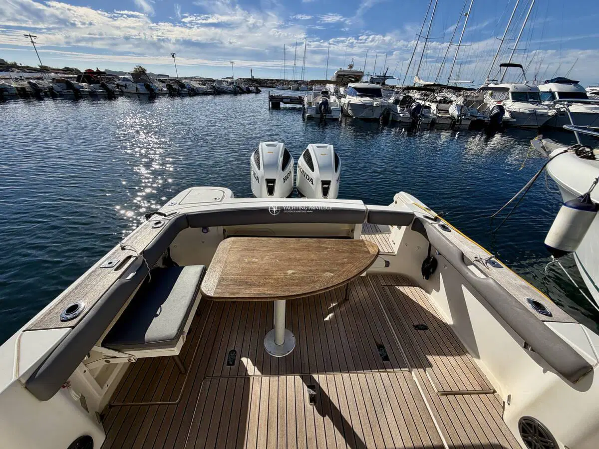 Sur le pont, retrouvez un carré arrière en teck spacieux, bain de soleil avant et arrière, pompe à eau de mer, T-Top, taud de fermeture arrière, leaning-post, plateforme de bain, haut-parleurs…