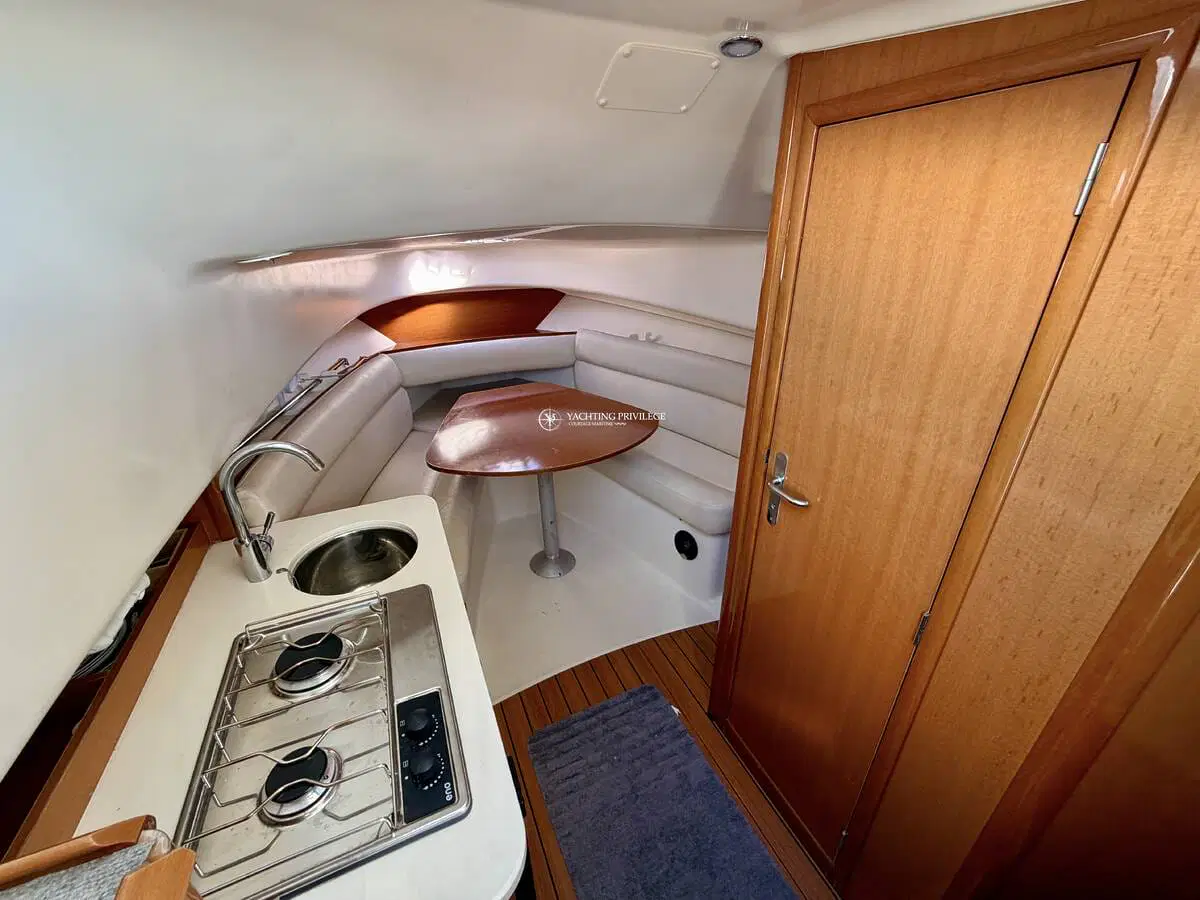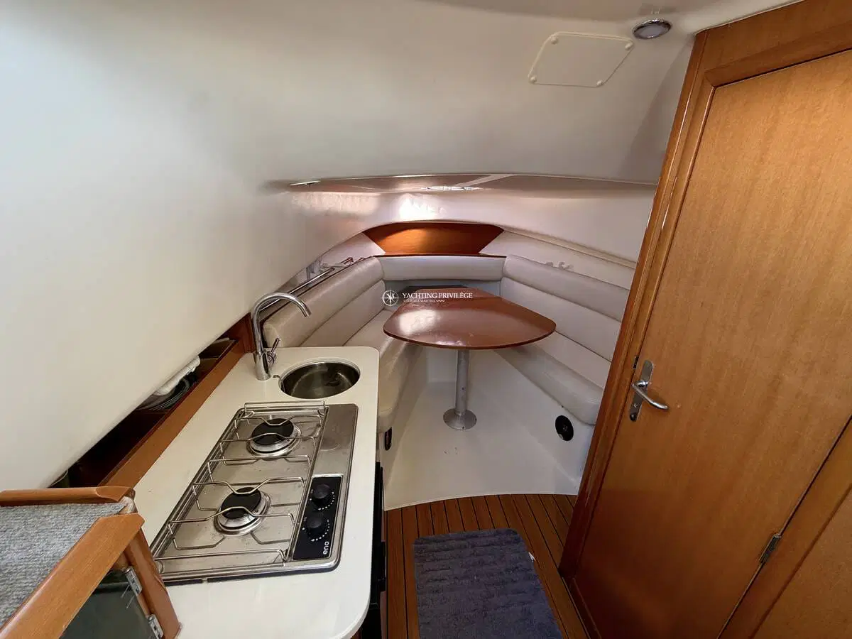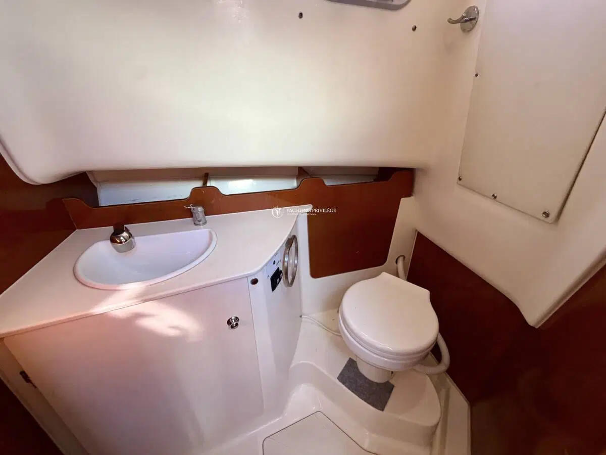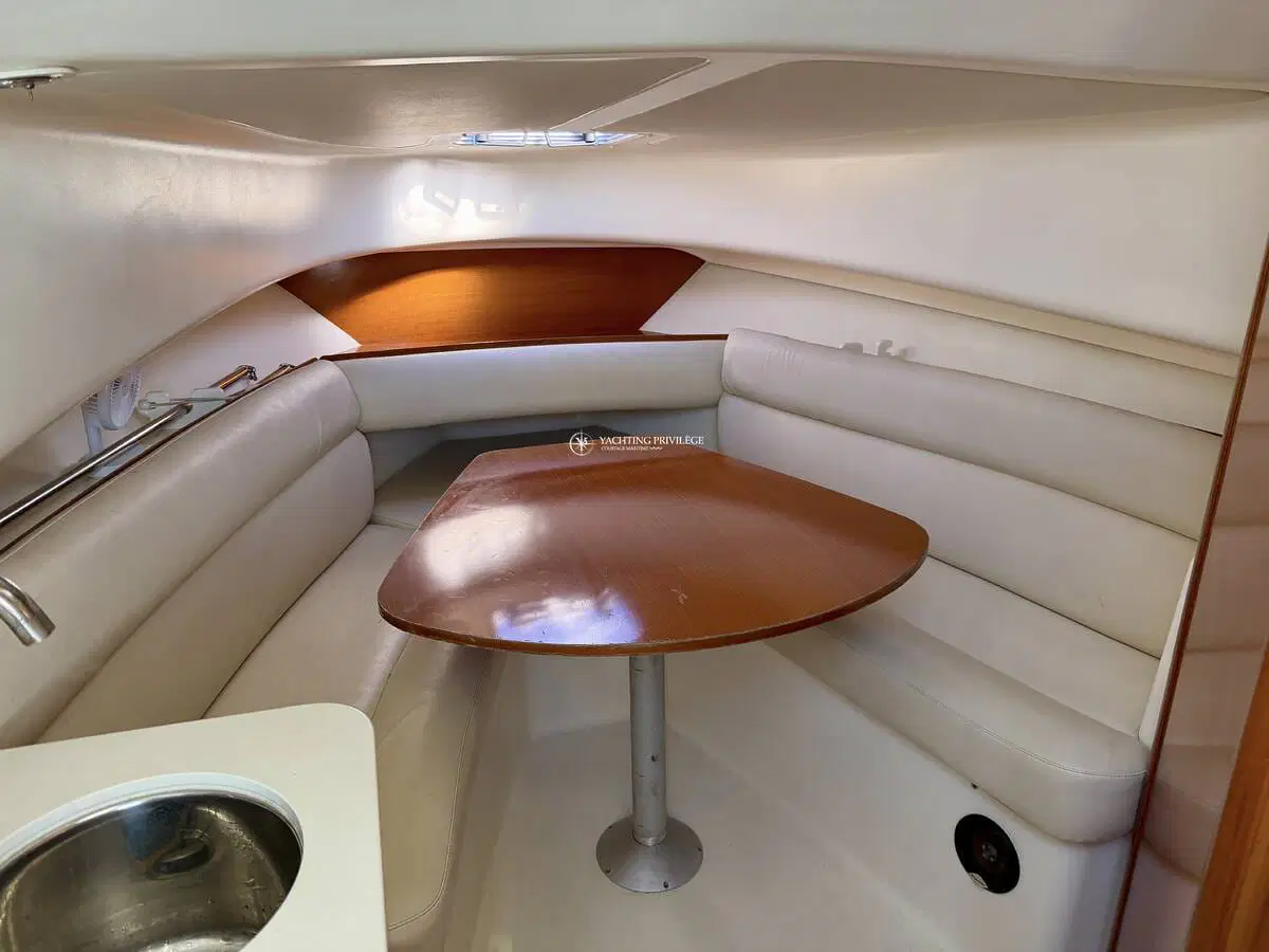 Sur le pont, retrouvez un carré arrière en teck spacieux, bain de soleil avant et arrière, pompe à eau de mer, T-Top, taud de fermeture arrière, leaning-post, plateforme de bain, haut-parleurs…