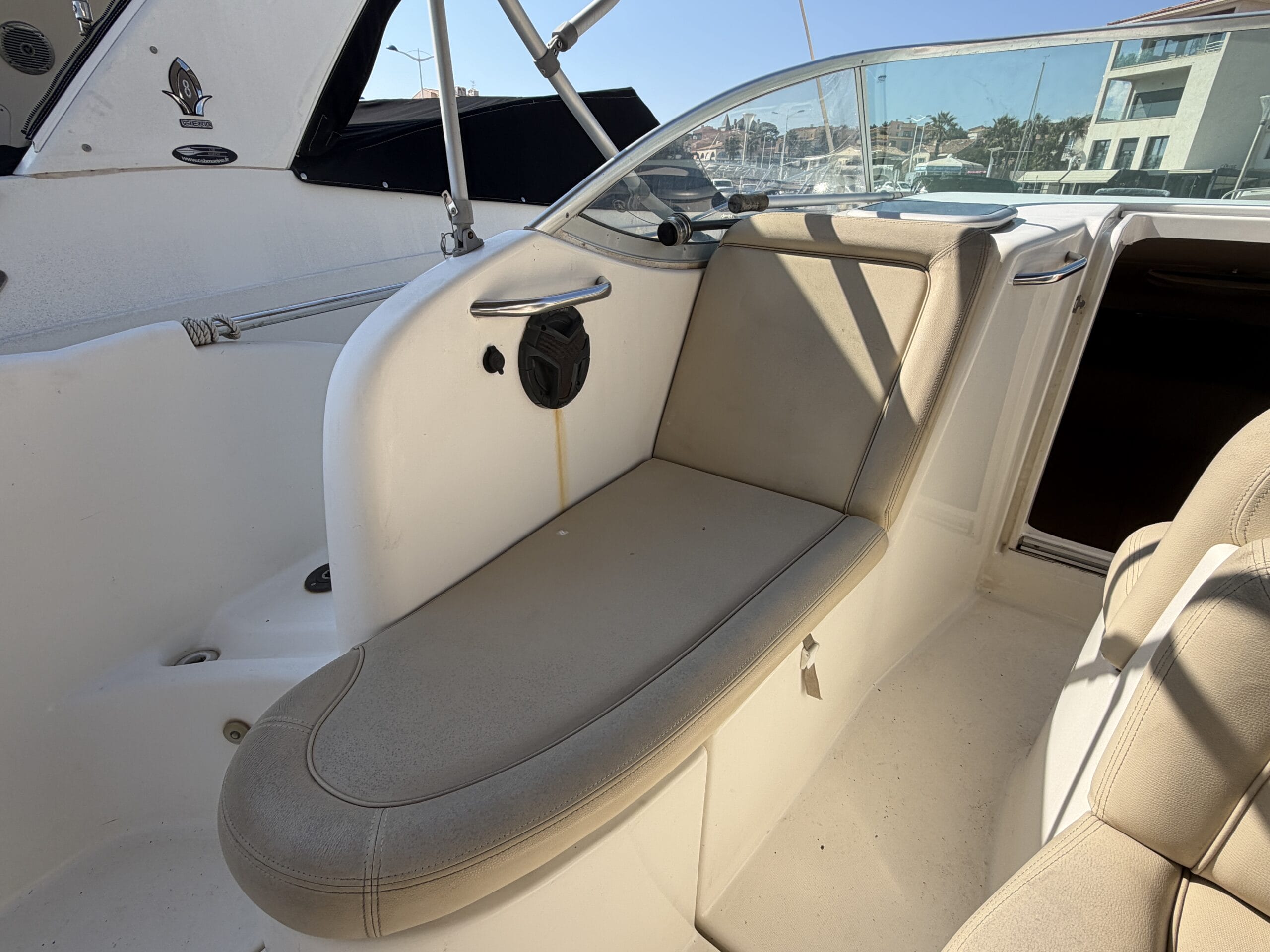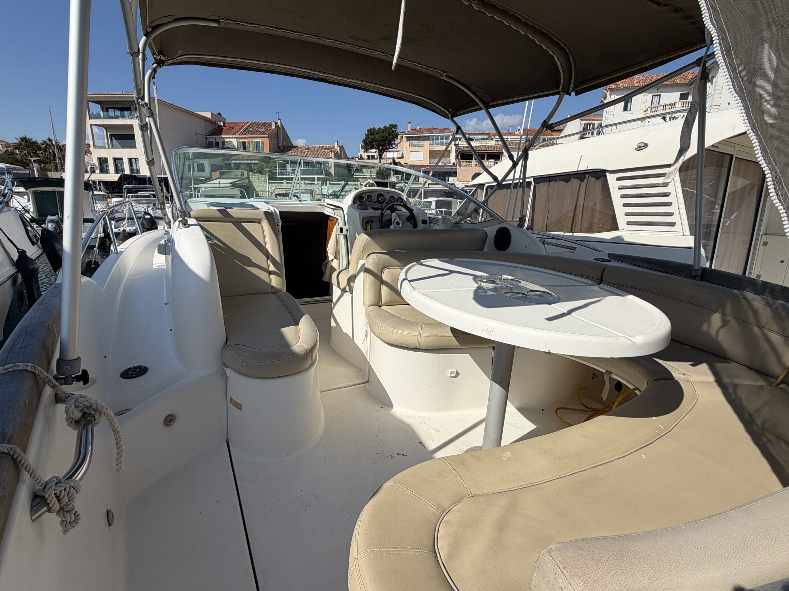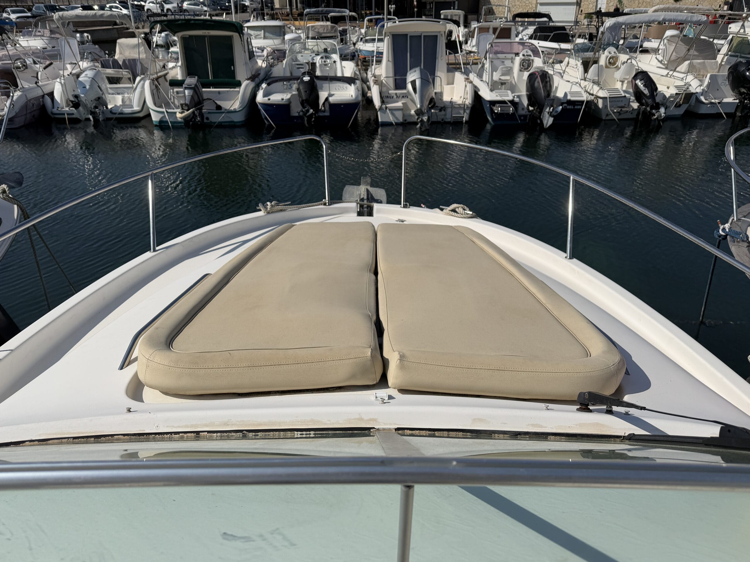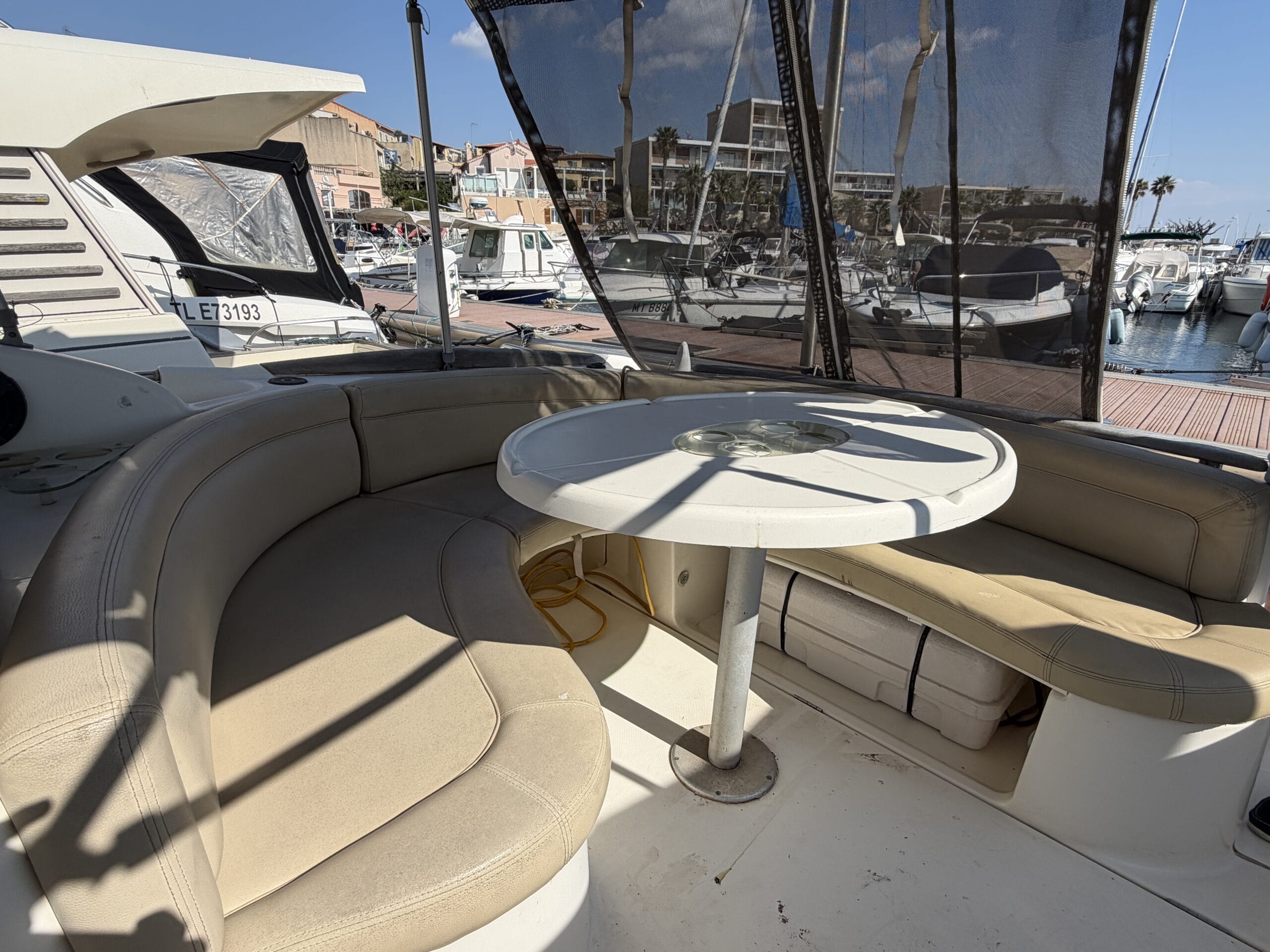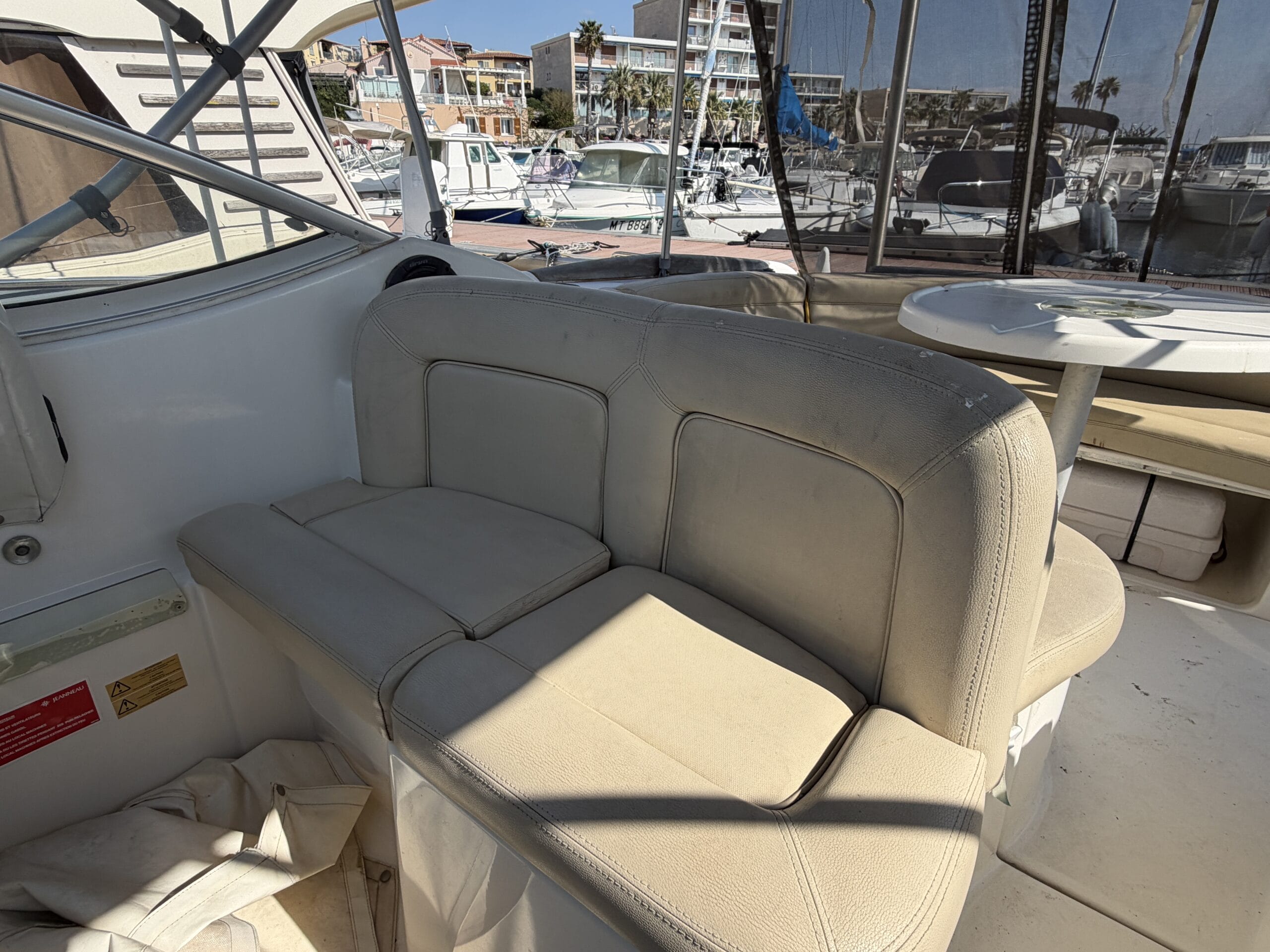 Le bateau dispose de bains de soleil à l’avant et à l’arrière. Il est également équipé d’un bimini et d’un taud de camping, actuellement en état d’usage et qui nécessiteraient d’être refaits. Les selleries de cockpit sont en état moyen.