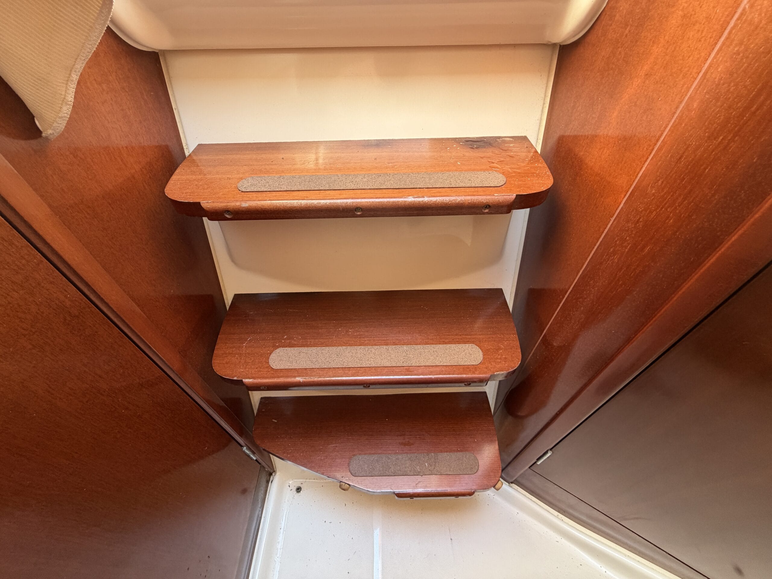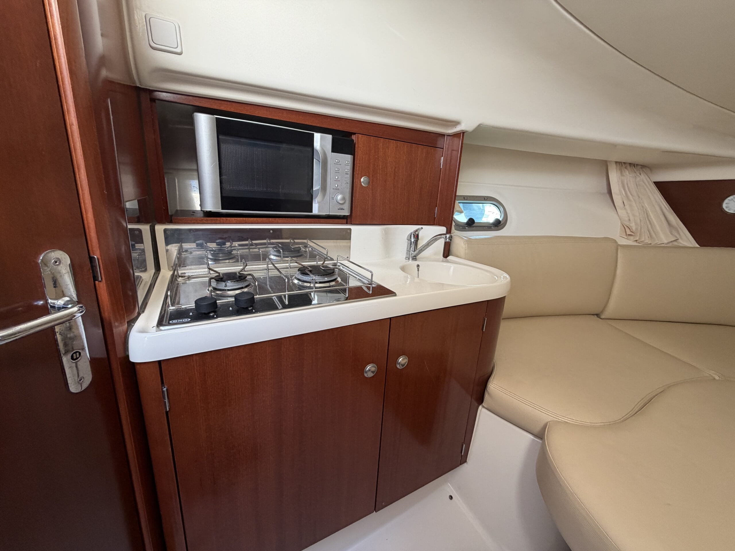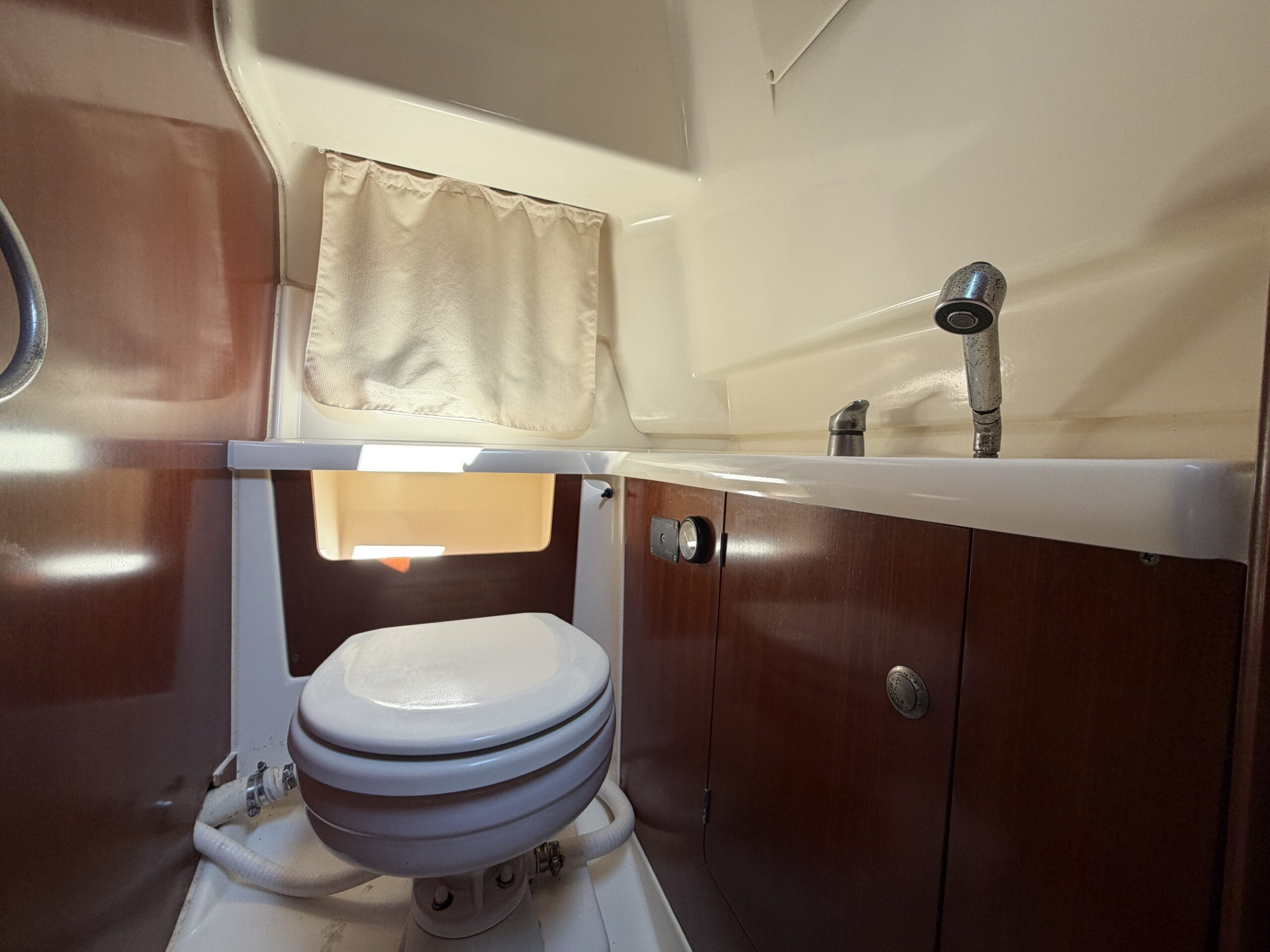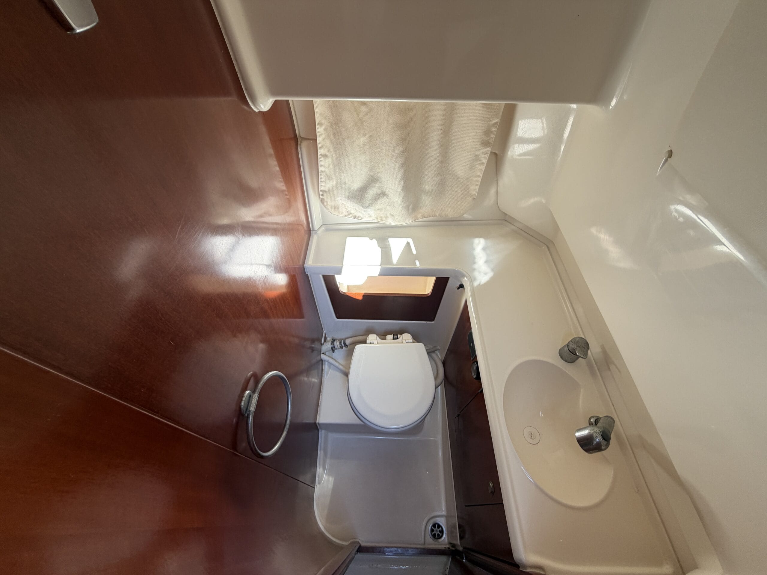 L’intérieur propose un aménagement fonctionnel avec une cuisine équipée d’un réfrigérateur, d’un évier et d’un réchaud à gaz, ainsi qu’un WC électrique et une douche, permettant de passer des nuits à bord dans de bonnes conditions.