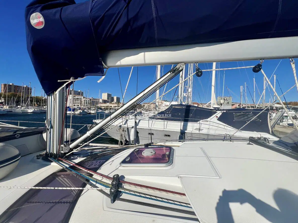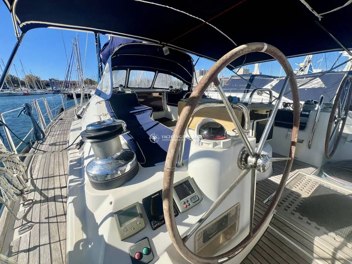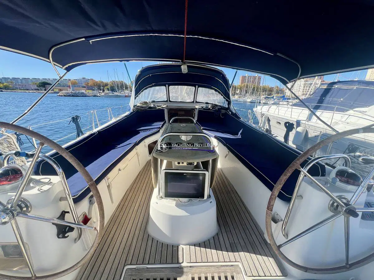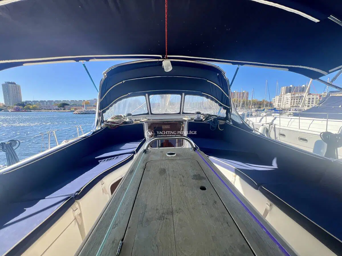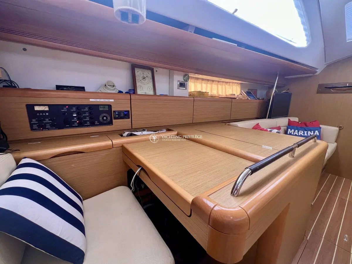 Le cockpit est spacieux avec une grande table pouvant accueillir 8 personnes. Ce voilier est équipé d’un génois sur enrouleur, d’une grande voile full batten en Dacron SF polyant 410 grammes avec coulisseaux à roulettes Ruttgerson, d’une trinquette coupe triradiale en hydranet sur enrouleur Facnor LX200 et d’un code 0 Elvström sur emmagasineur FX 4500 avec traitement anti-uv. Il est également composé de 4 winchs Harken dont 3 électriques, de 2 bras pour l’annexe, ainsi que tous l’équipement électronique nécessaire mise à jour et l’équipement de sécurité pour naviguer sereinement.