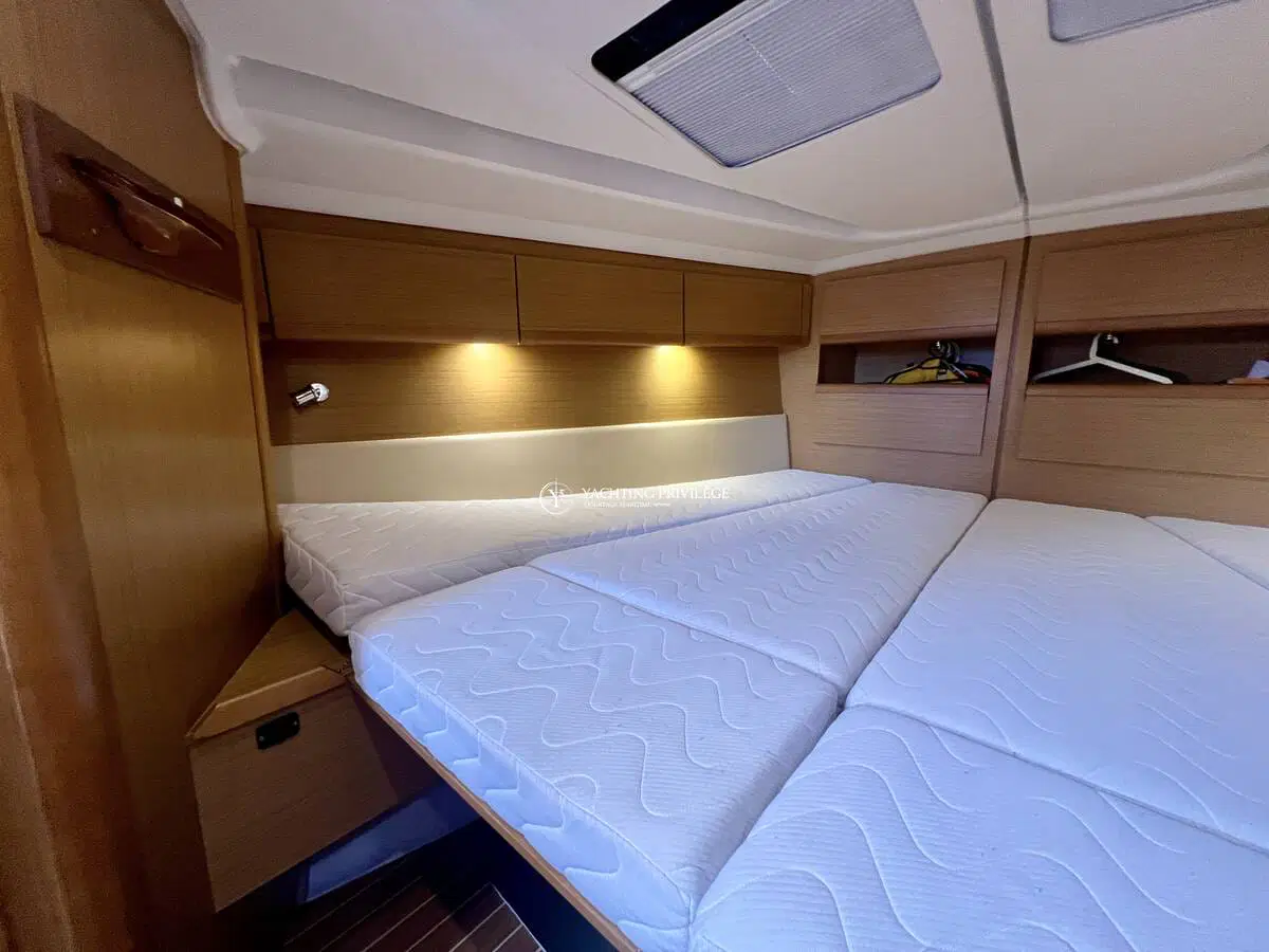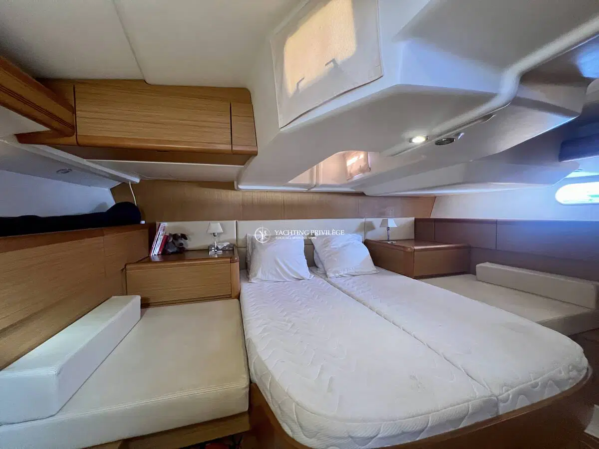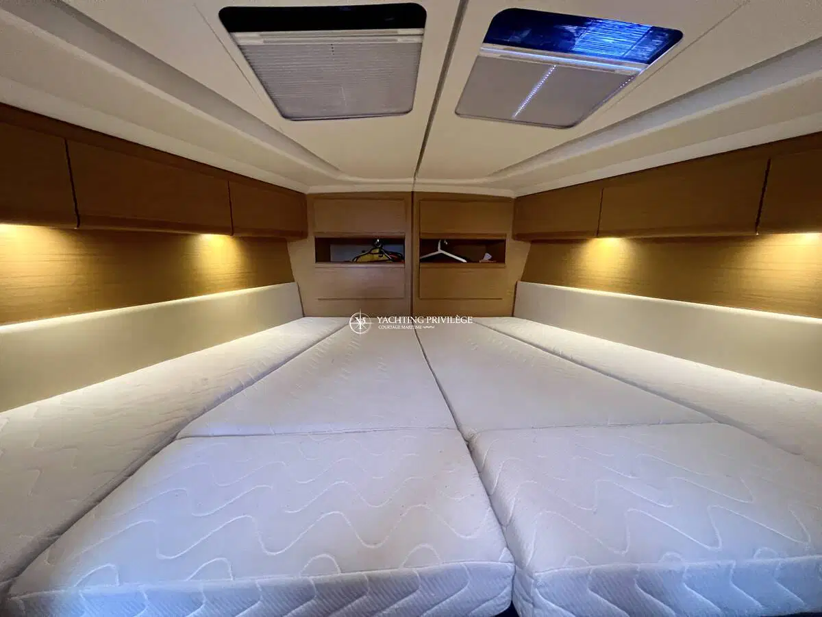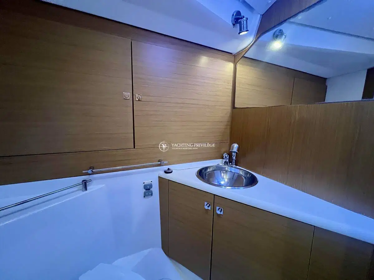 L’intérieur spacieux et lumineux, est composé d’une grande cabine arrière-propriétaire avec salle d’eau privative, une cabine spacieuse à l’avant avec 2 salles d’eau et WC pouvant être divisé par 2 pour faire une 3ème cabine grâce a ses cloisons amovibles. Le carré est transformable et il est équipé d’une climatisation réversible d’un groupe électrogène Paguro, d’une machine à laver/sèche-linge et d’un dessalinisateur HP Full automatique pour vous apporter un maximum de confort à bord.