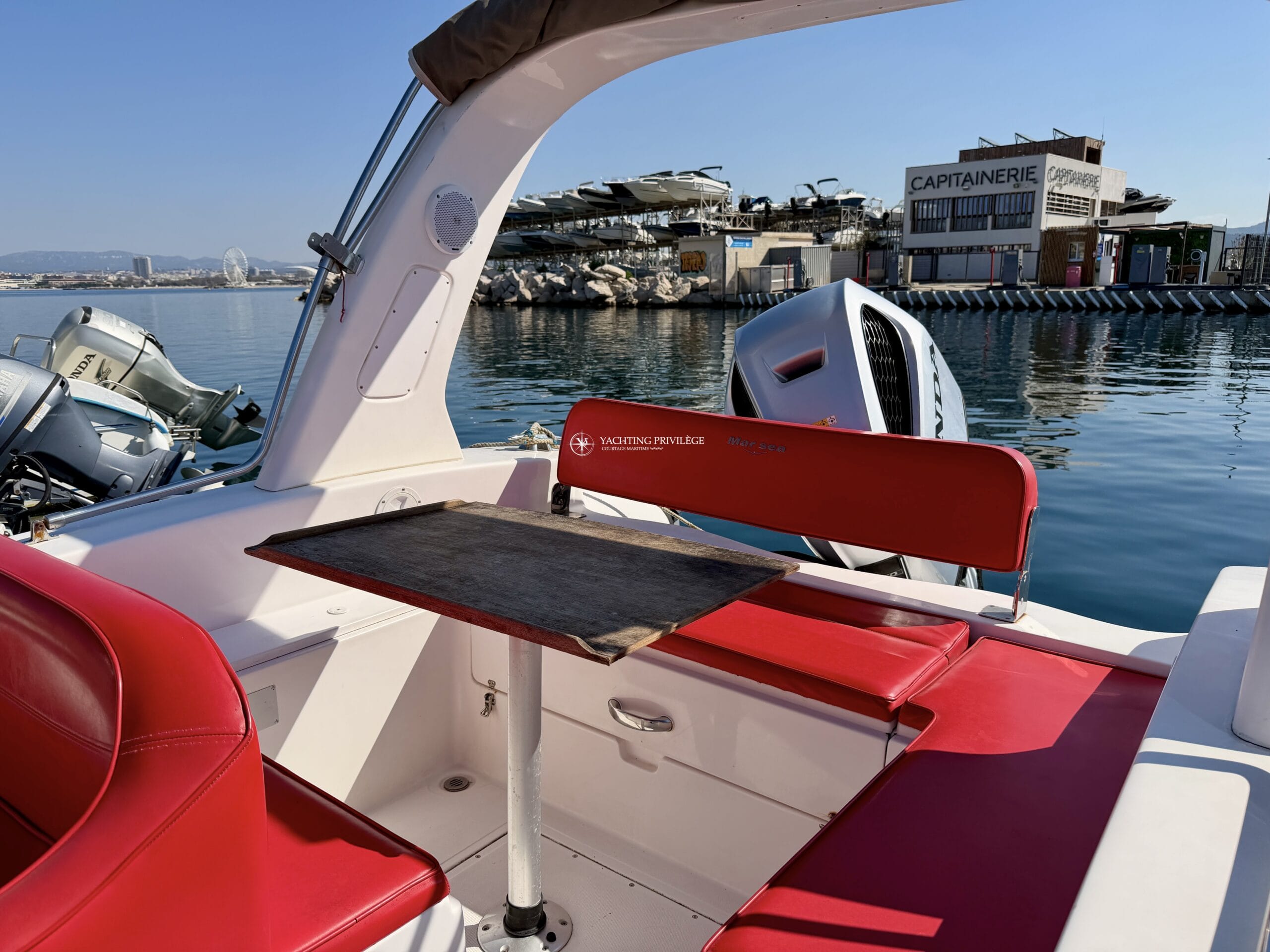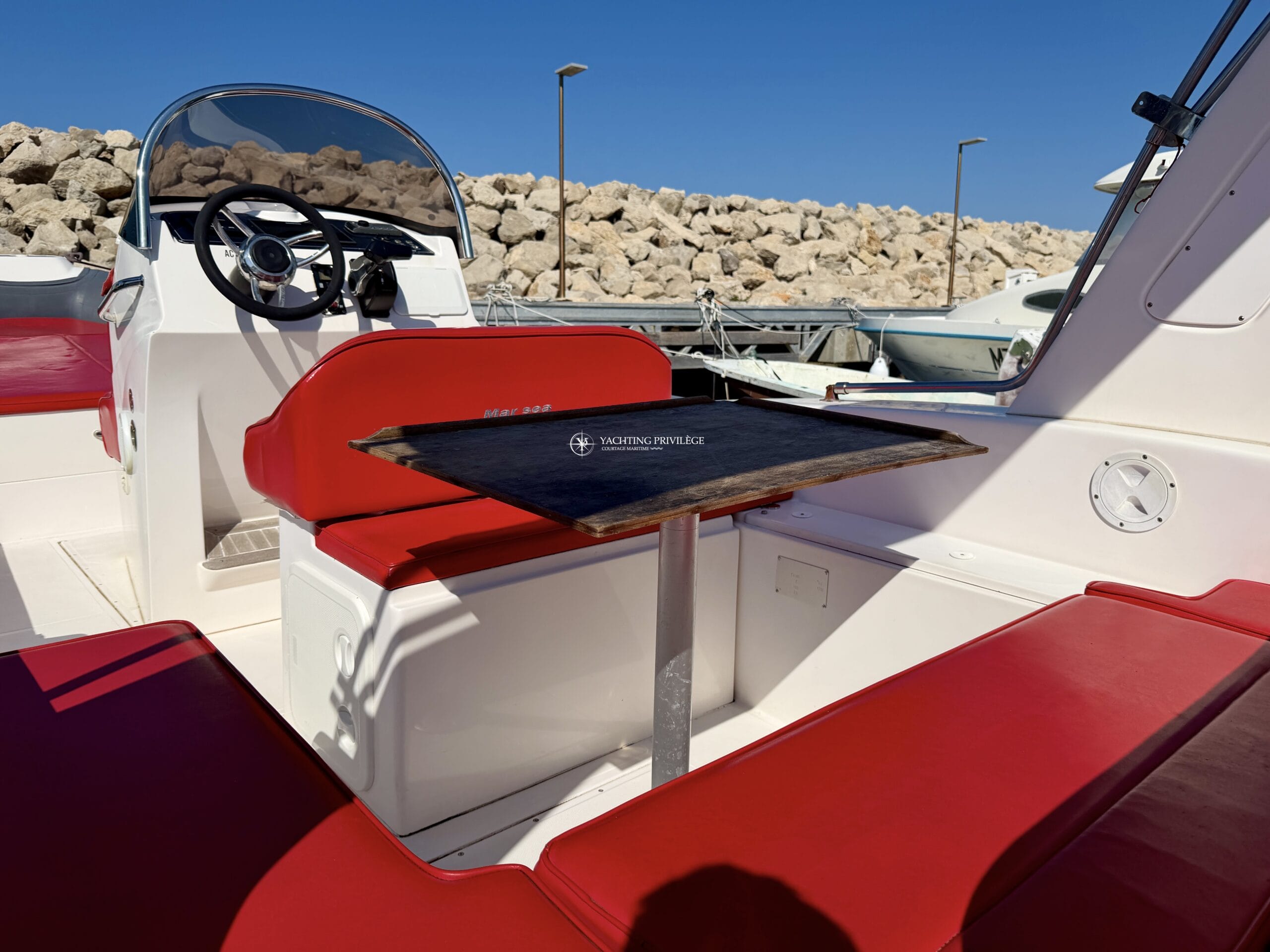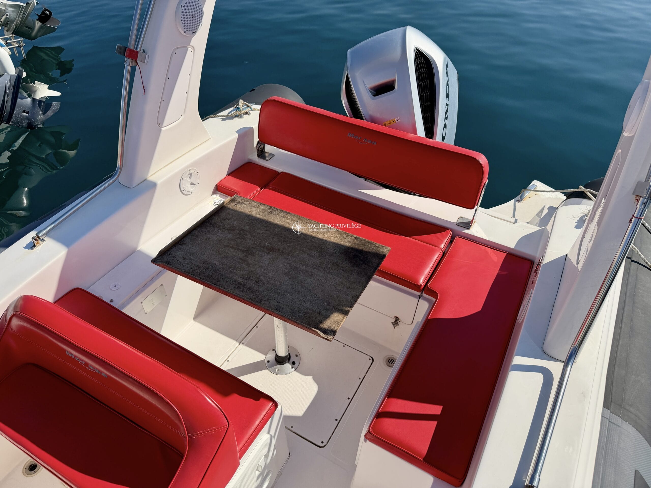 Avec ses 7,60 mètres de longueur et 2,99 mètres de largeur, ce bateau offre un espace de vie agréable à bord. Il dispose notamment d’une plateforme de bain avec échelle, d’une table de cockpit, d’un fauteuil à l’avant, ainsi que d’une sellerie gris et rouge. Une radio Fusion MS-RA55 est également installée pour agrémenter vos navigations.