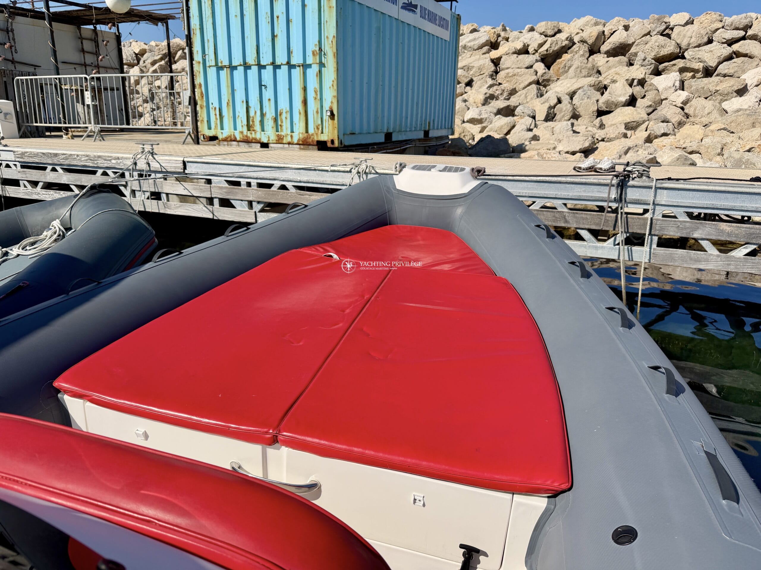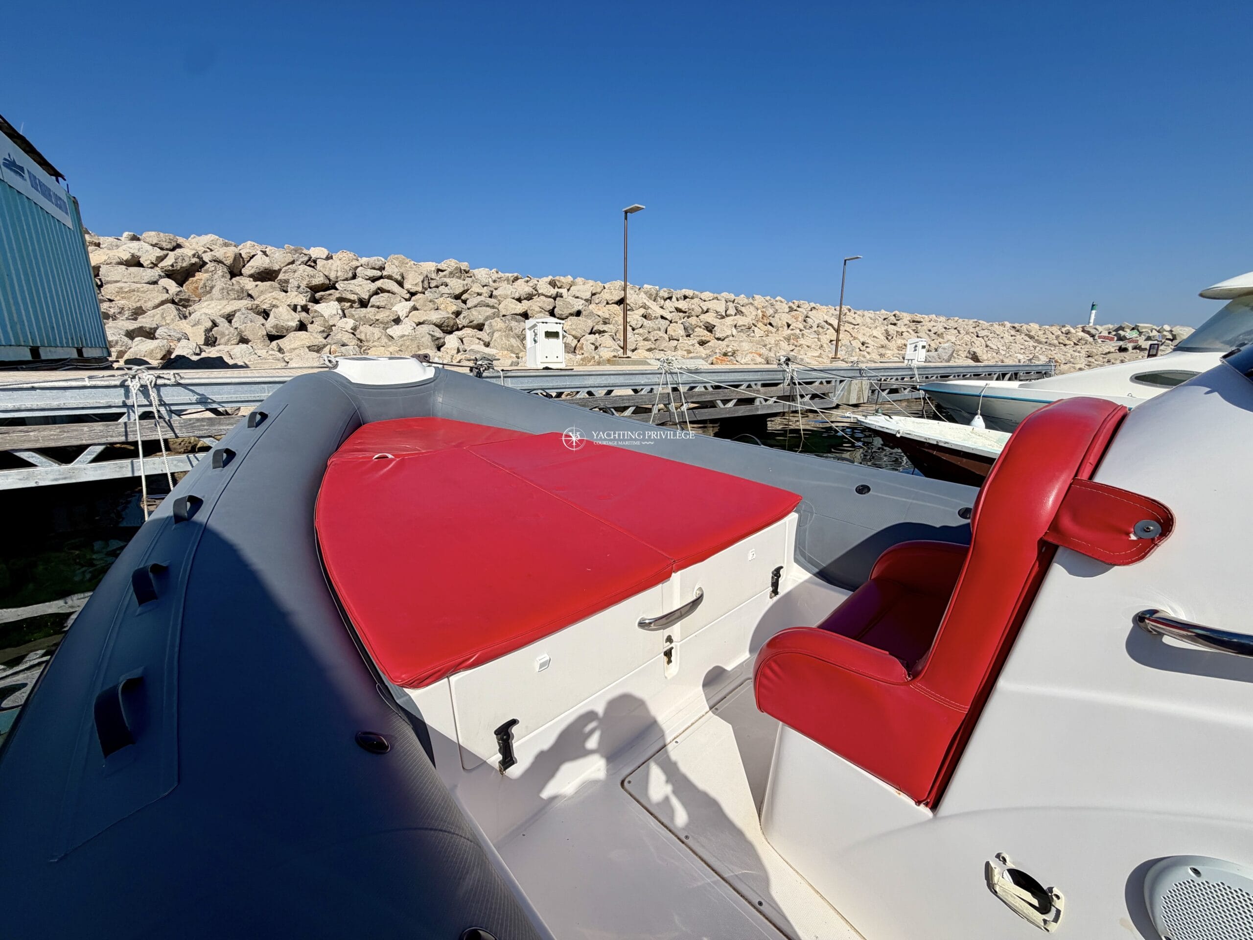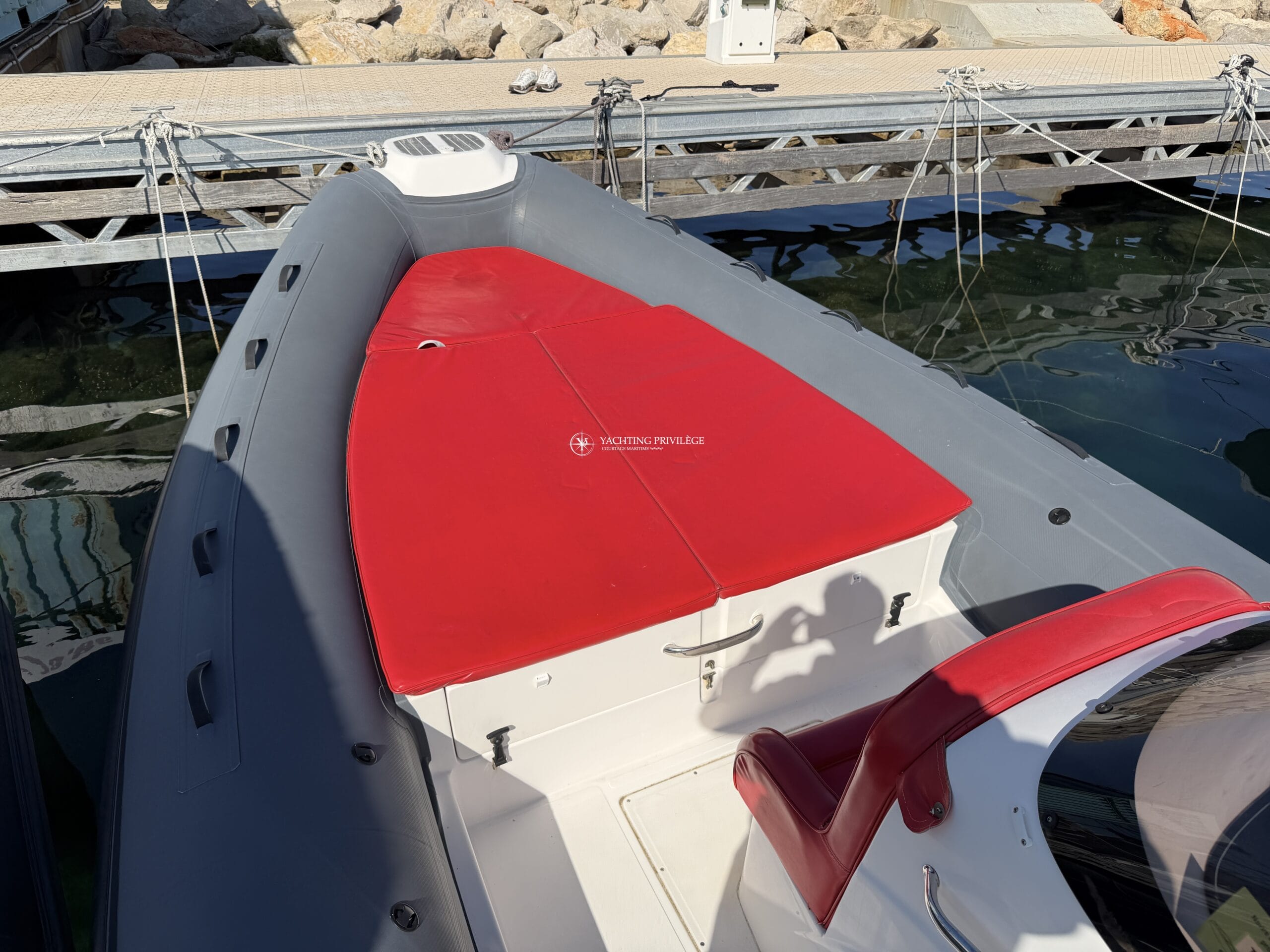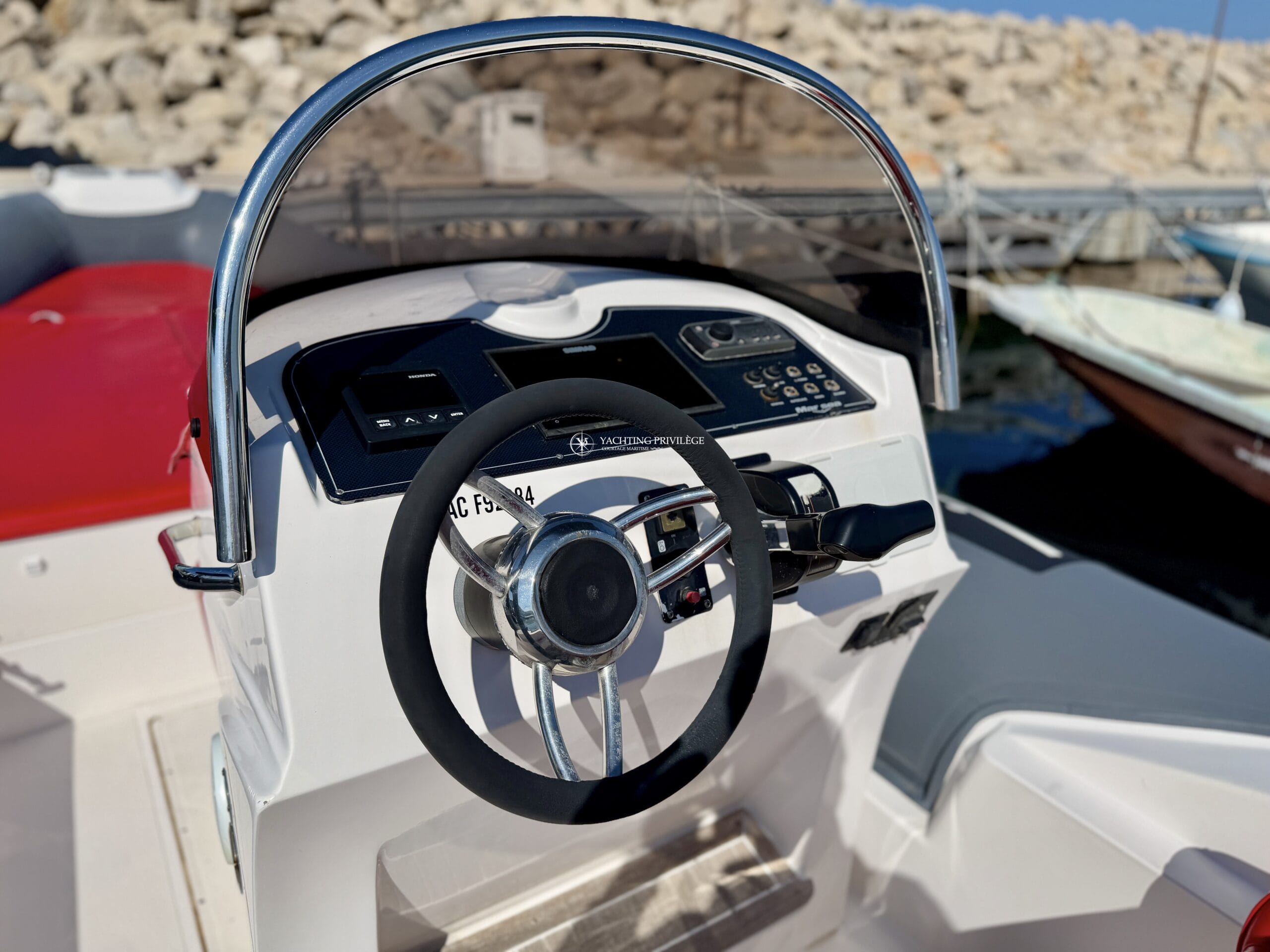 Avec ses 7,60 mètres de longueur et 2,99 mètres de largeur, ce bateau offre un espace de vie agréable à bord. Il dispose notamment d’une plateforme de bain avec échelle, d’une table de cockpit, d’un fauteuil à l’avant, ainsi que d’une sellerie gris et rouge. Une radio Fusion MS-RA55 est également installée pour agrémenter vos navigations.