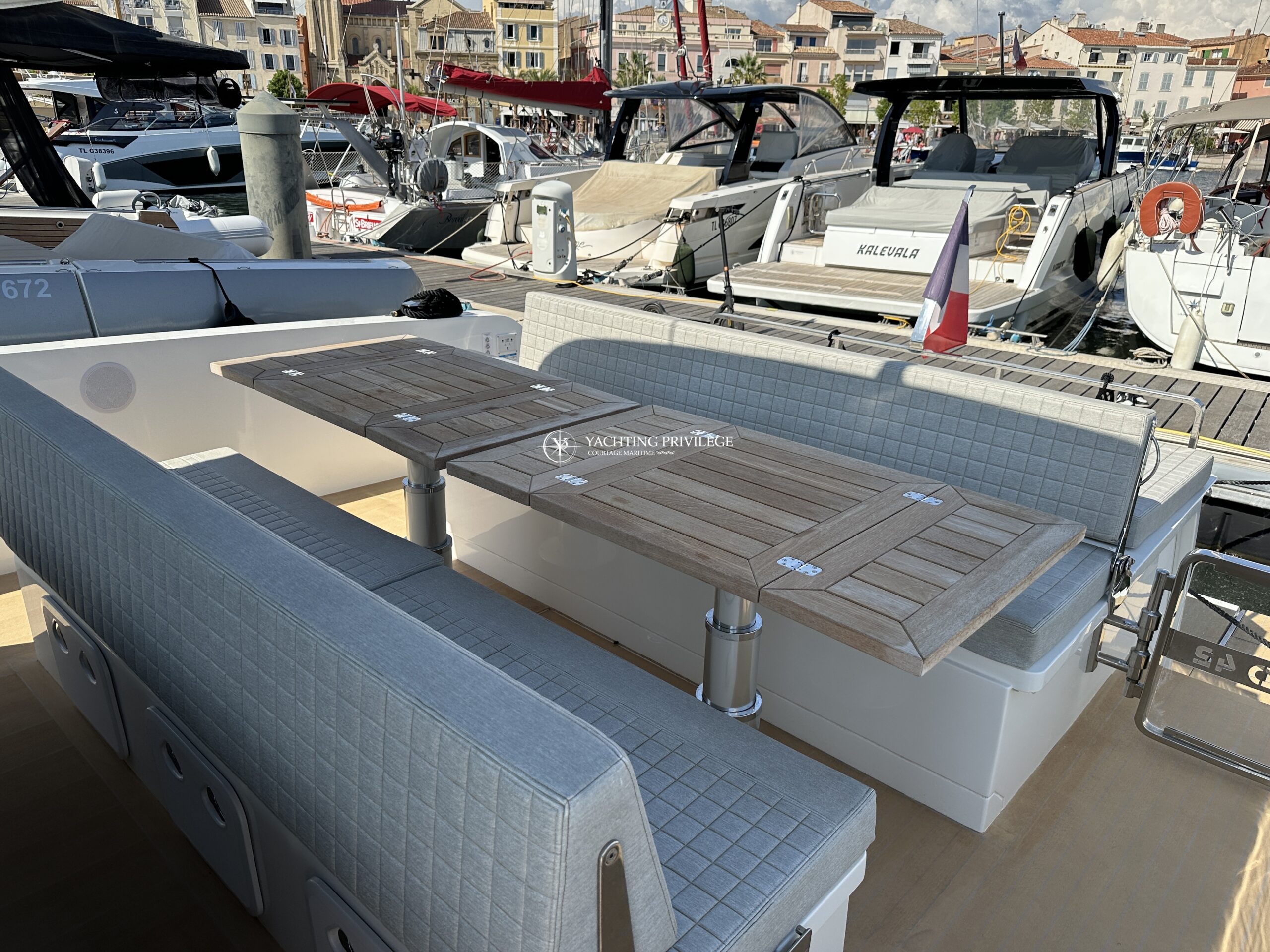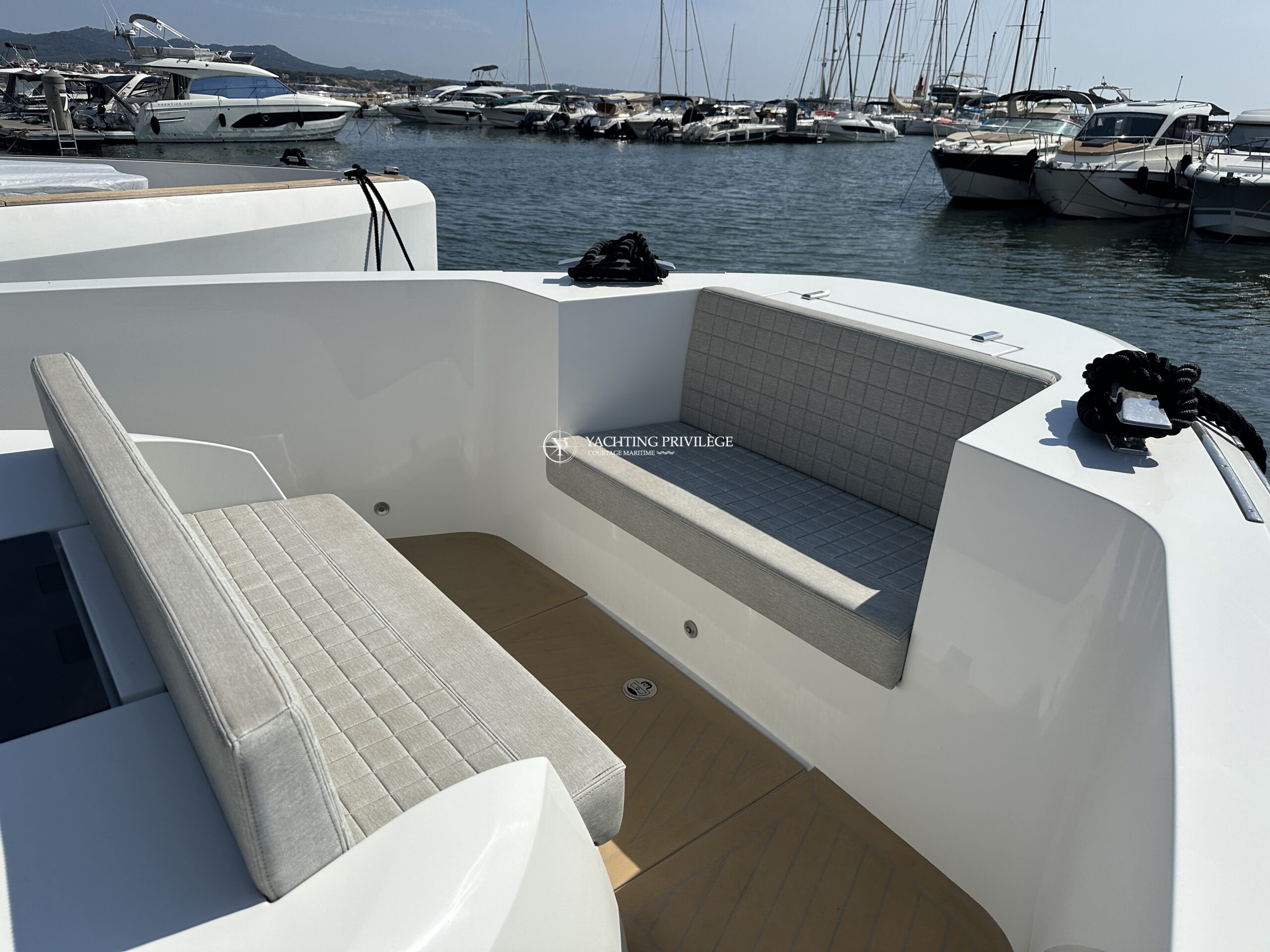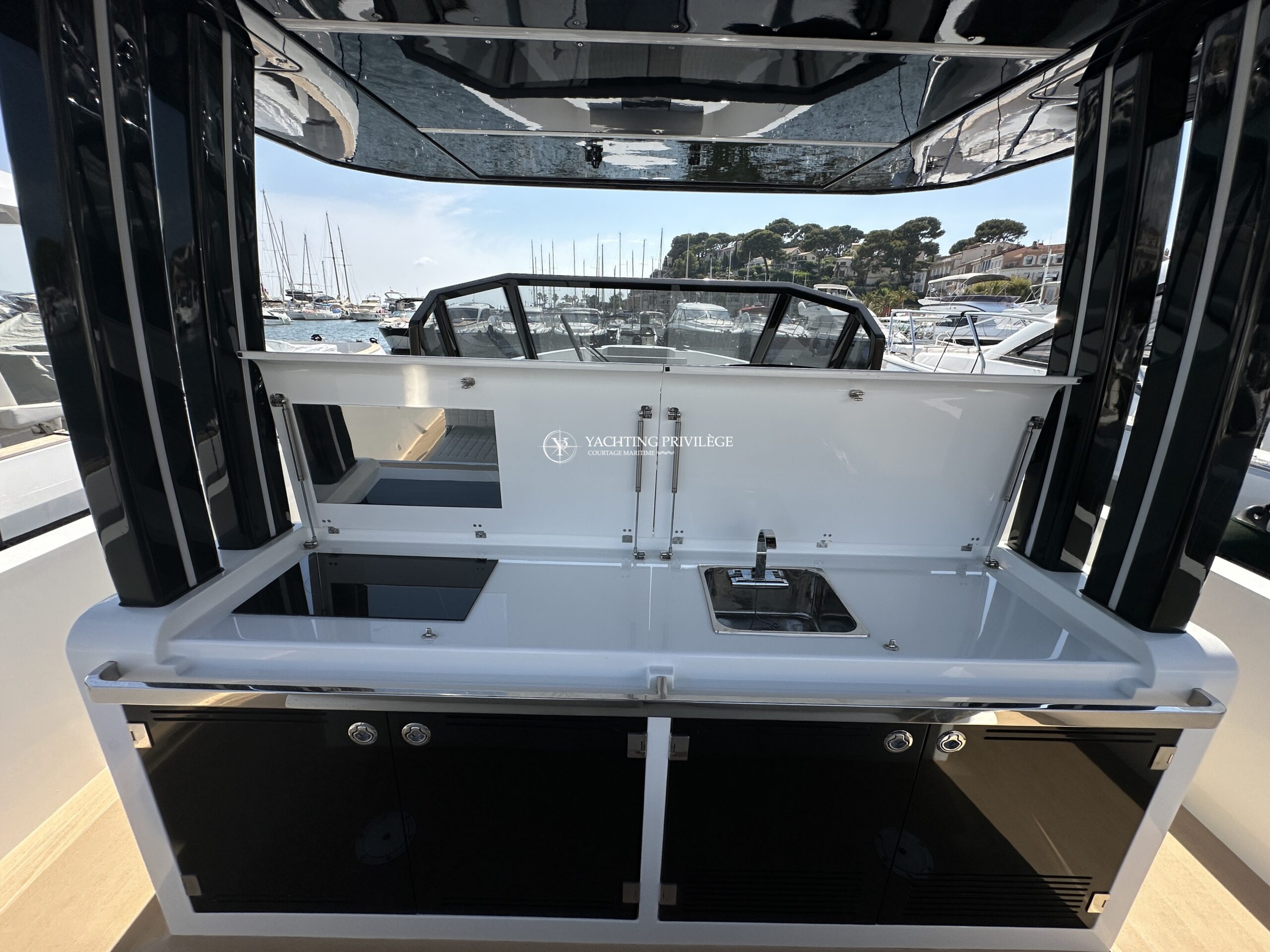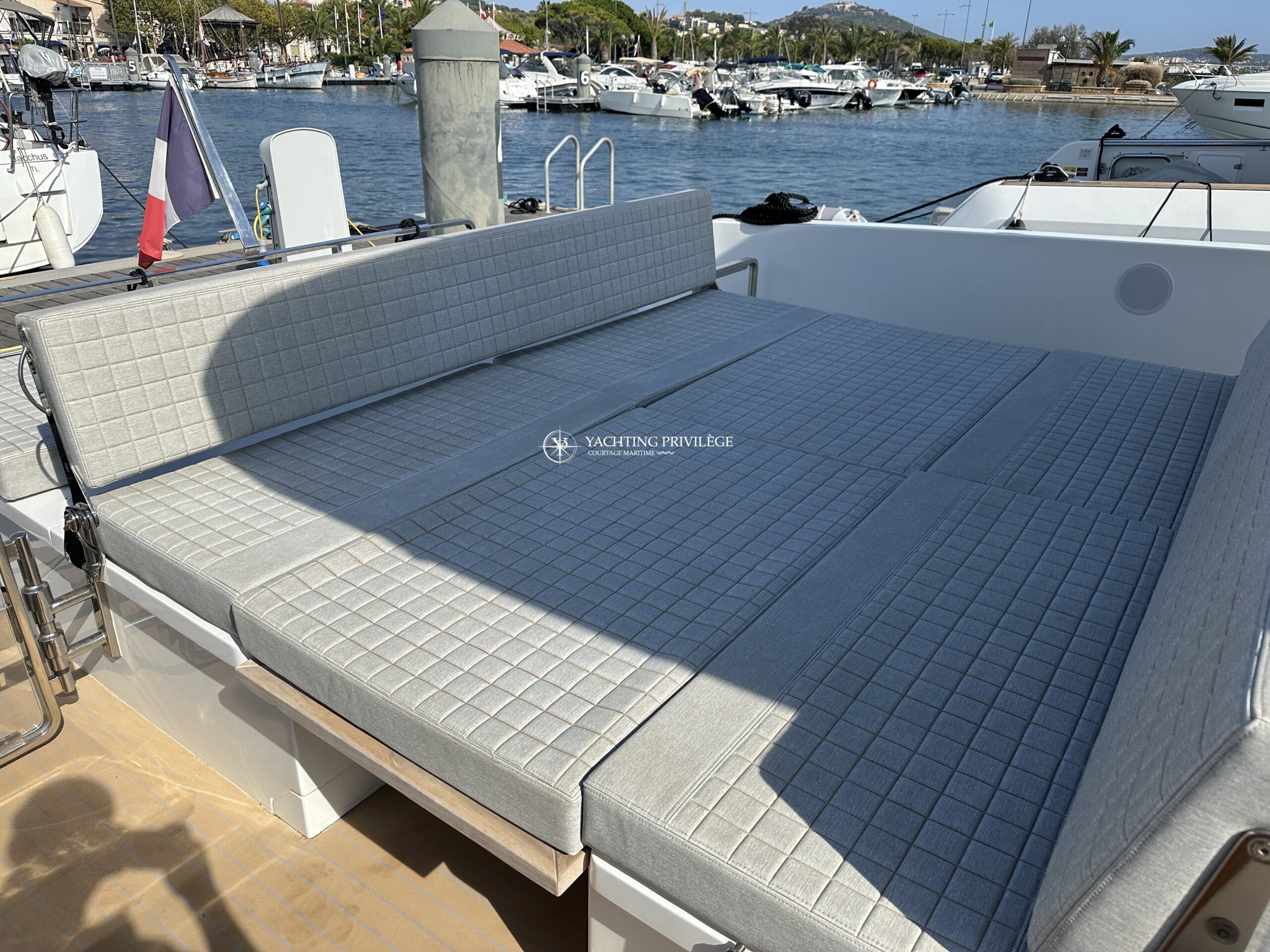 Navire équipé d'une plate-forme de bain hydraulique, guindeau électrique, table de cockpit hydraulique, cuisine extérieur, bain de soleil avant et arrière, groupe électrogène, centrale de navigation, GPS/Sondeur/Traceur, pilote automatique, climatisation...