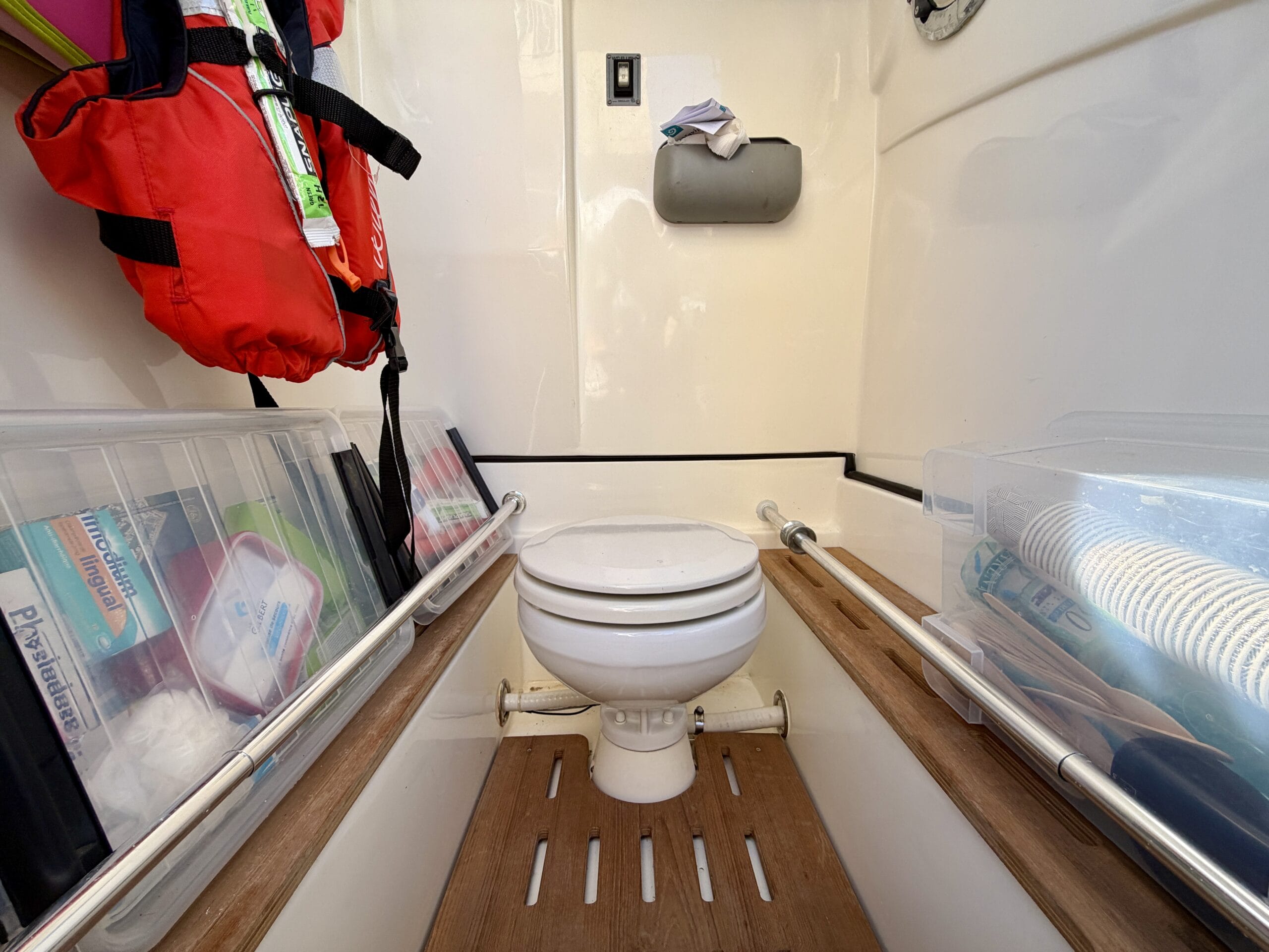 Côté électronique, l’équipement est complet avec un GPS / sondeur traceur Garmin, une VHF, un pilote automatique et un système hi-fi Fusion.