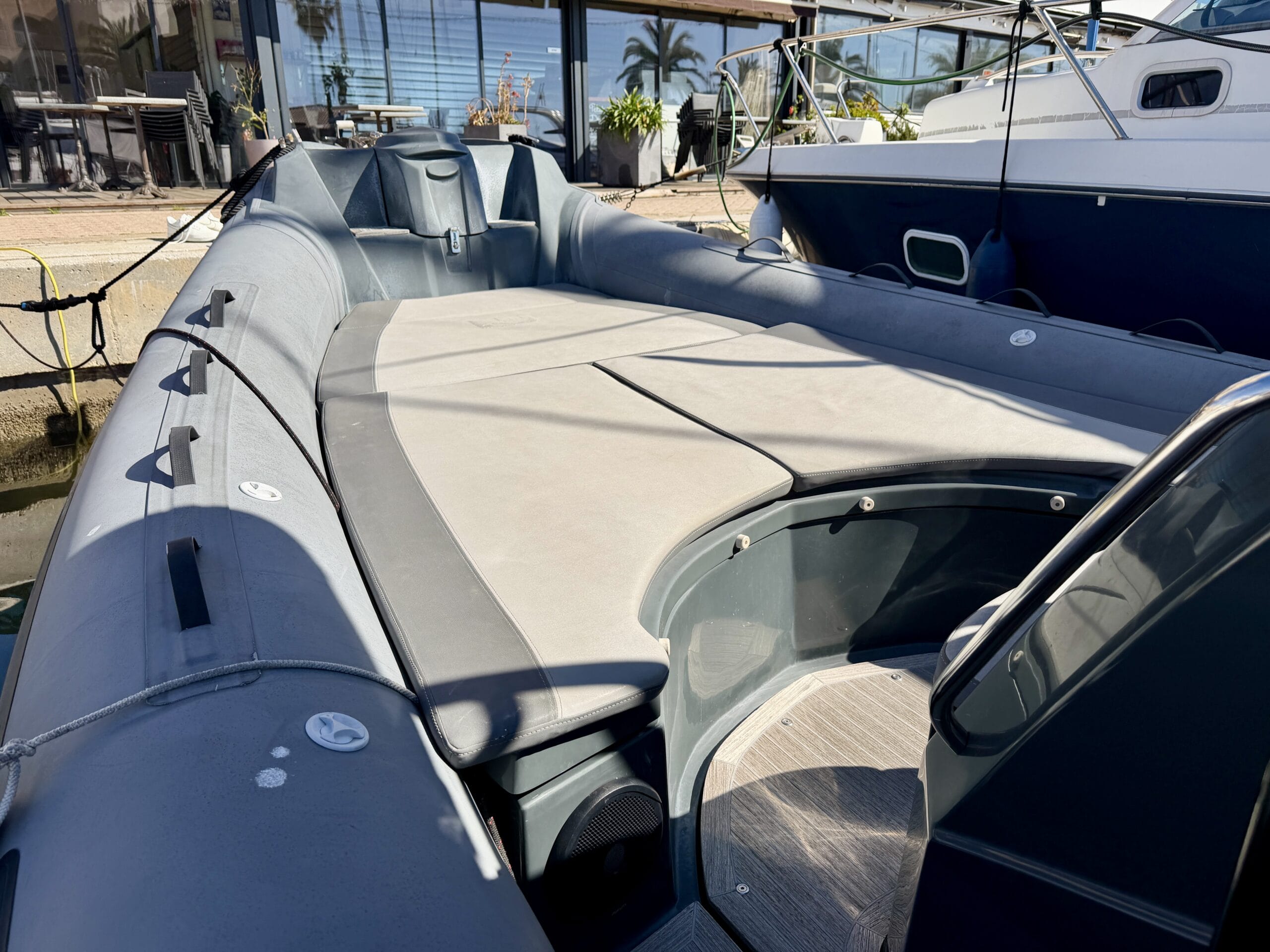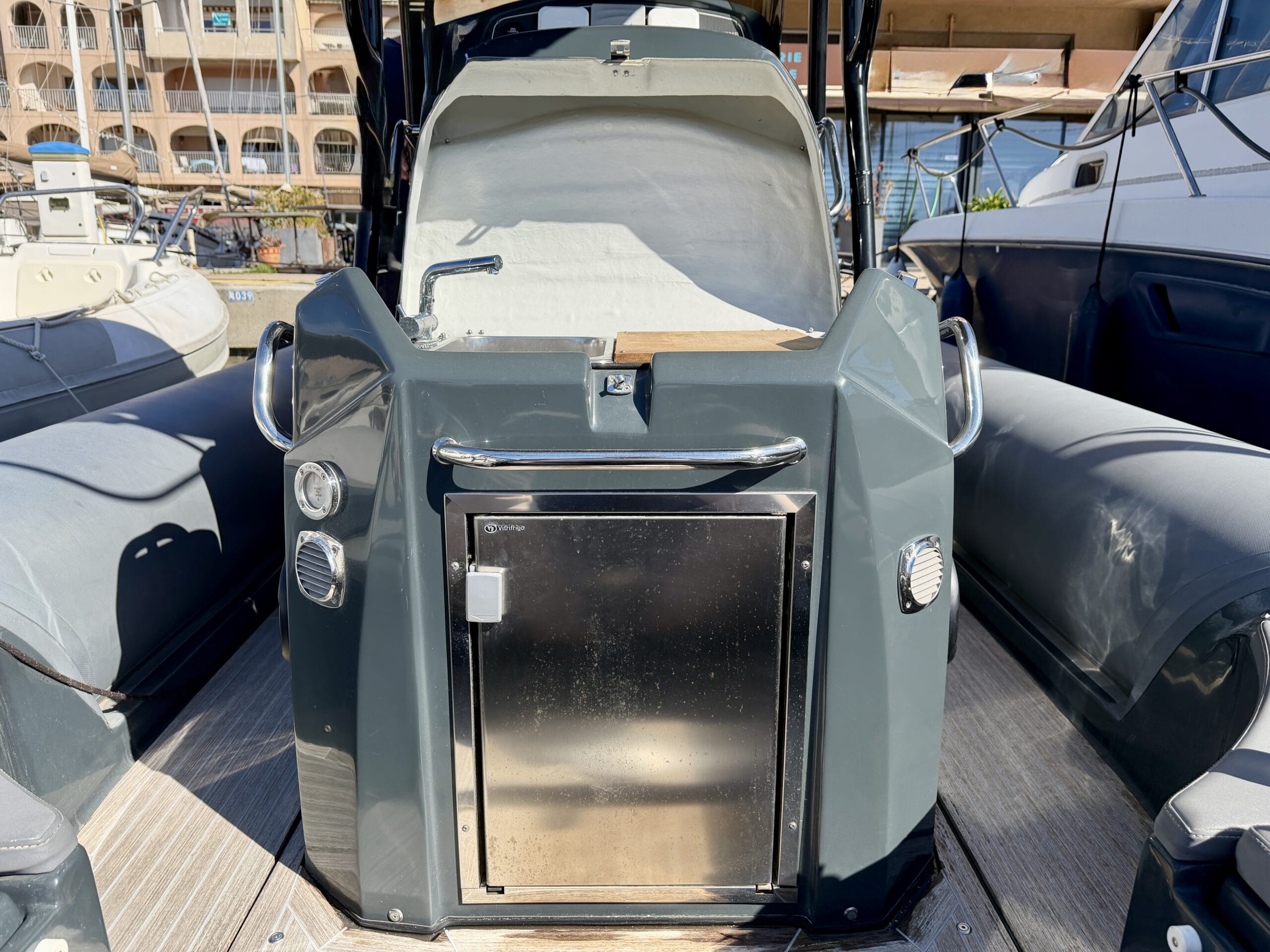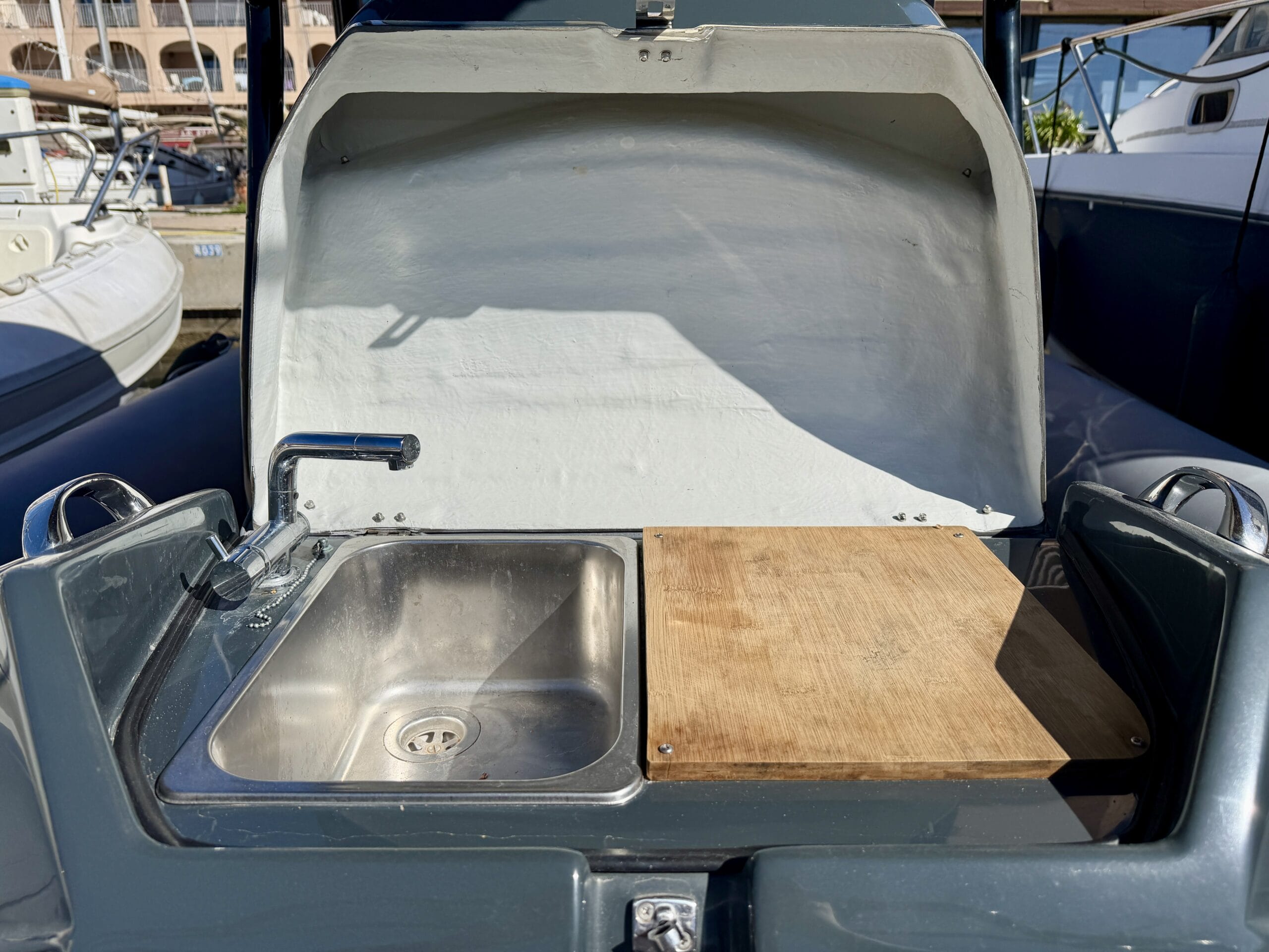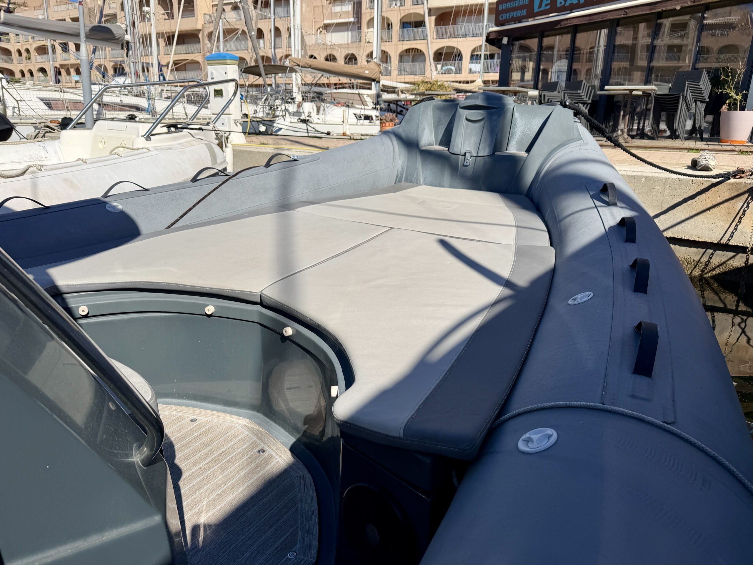 Le bateau est équipé d'un T-Top, des bains de soleil à l’avant et à l’arrière, ainsi qu’un espace convivial avec table de cockpit pour profiter pleinement des sorties en mer. Le bateau dispose également d’une petite cuisine avec évier et réfrigérateur, ainsi que d’un WC électrique avec cuve à eau noire, apportant un confort appréciable à bord sur un semi rigide de cette catégorie.