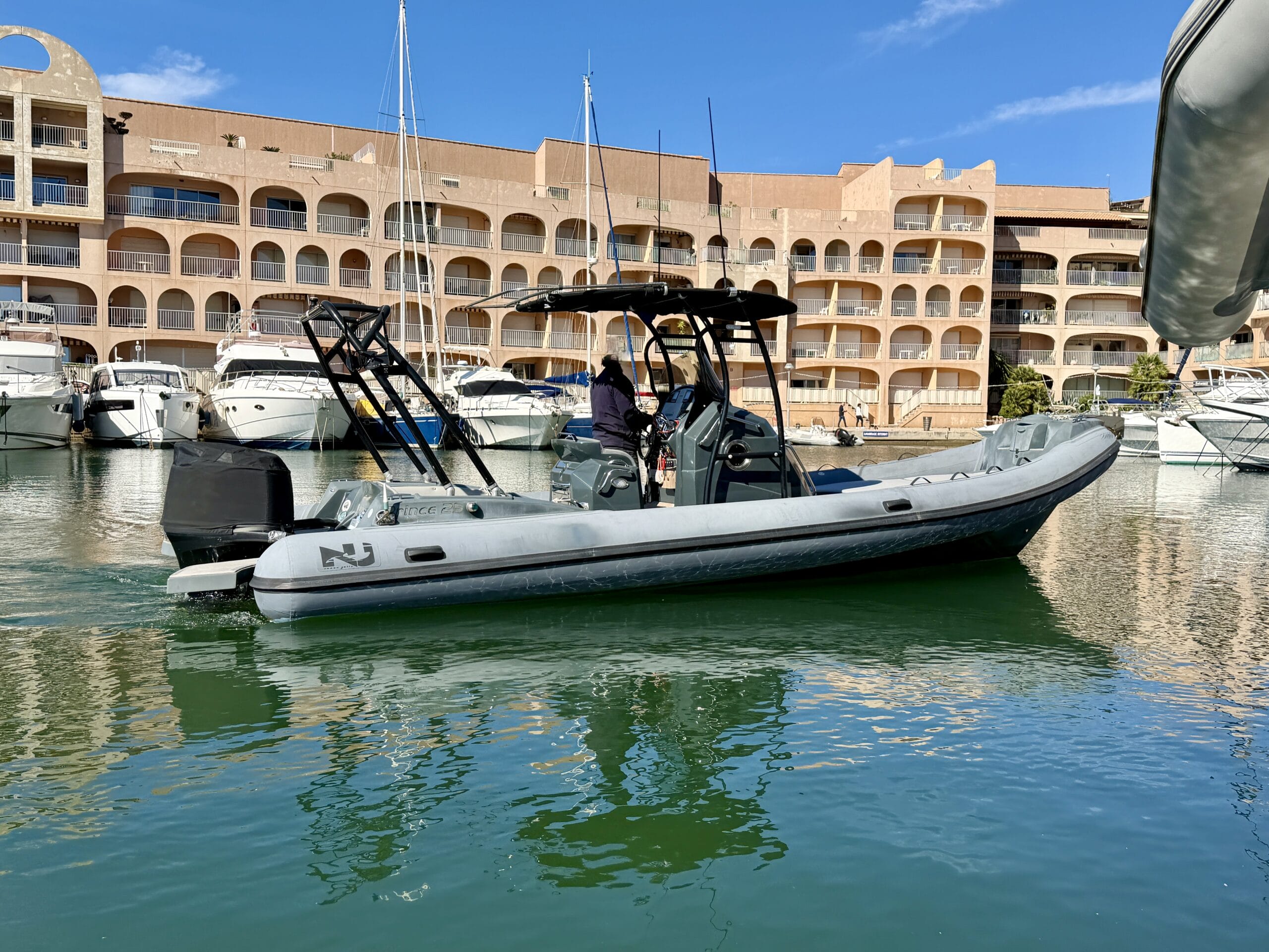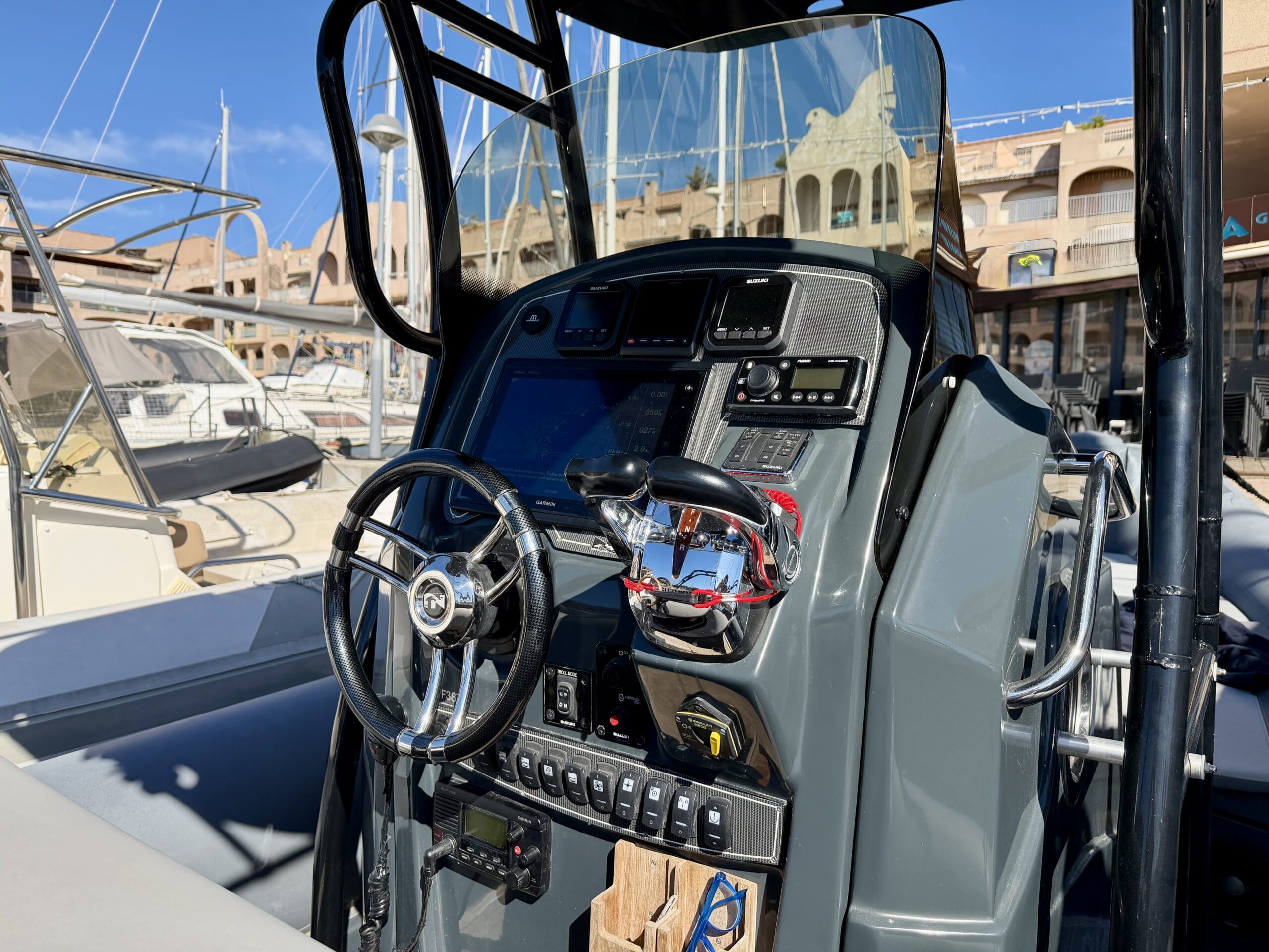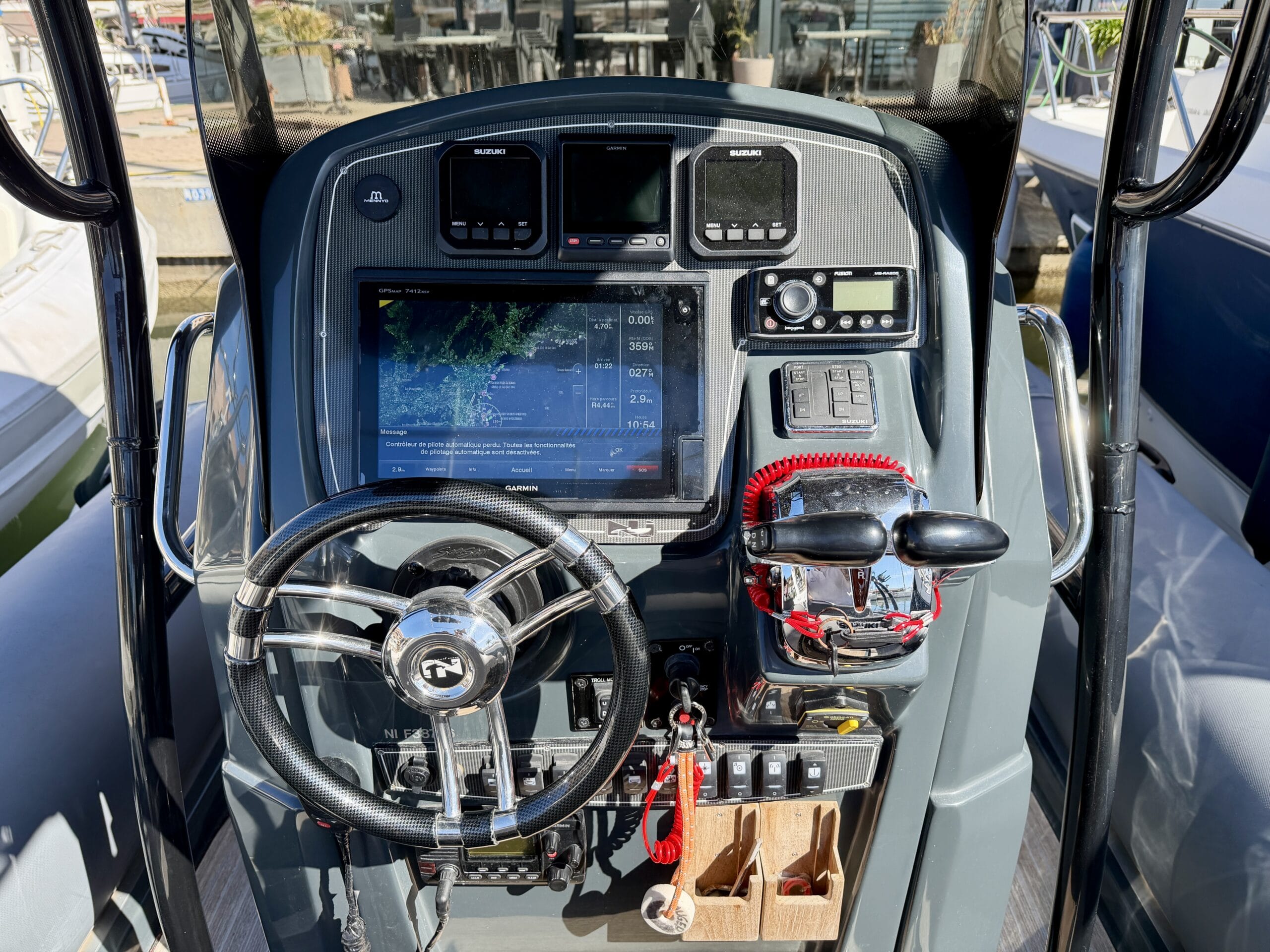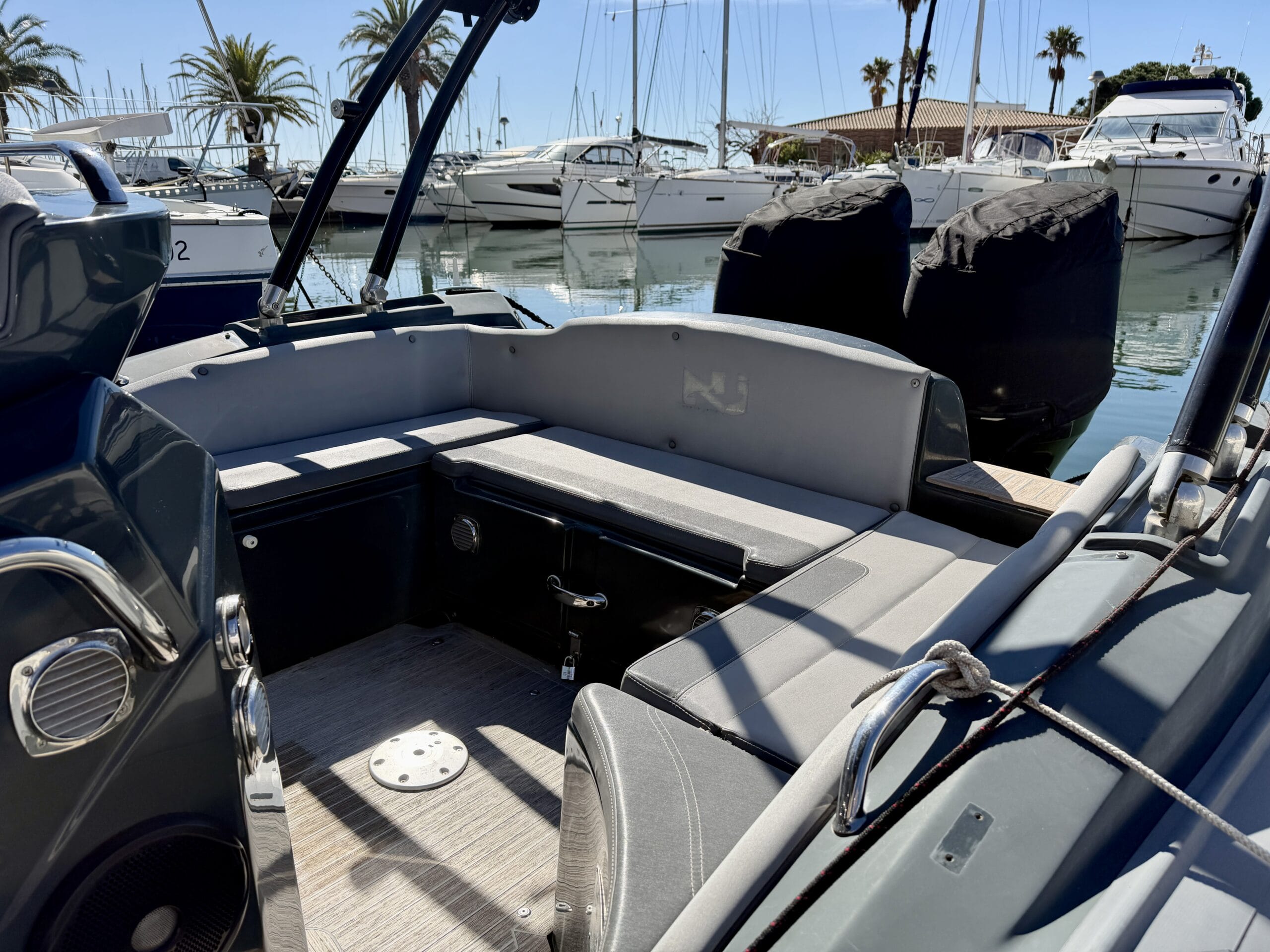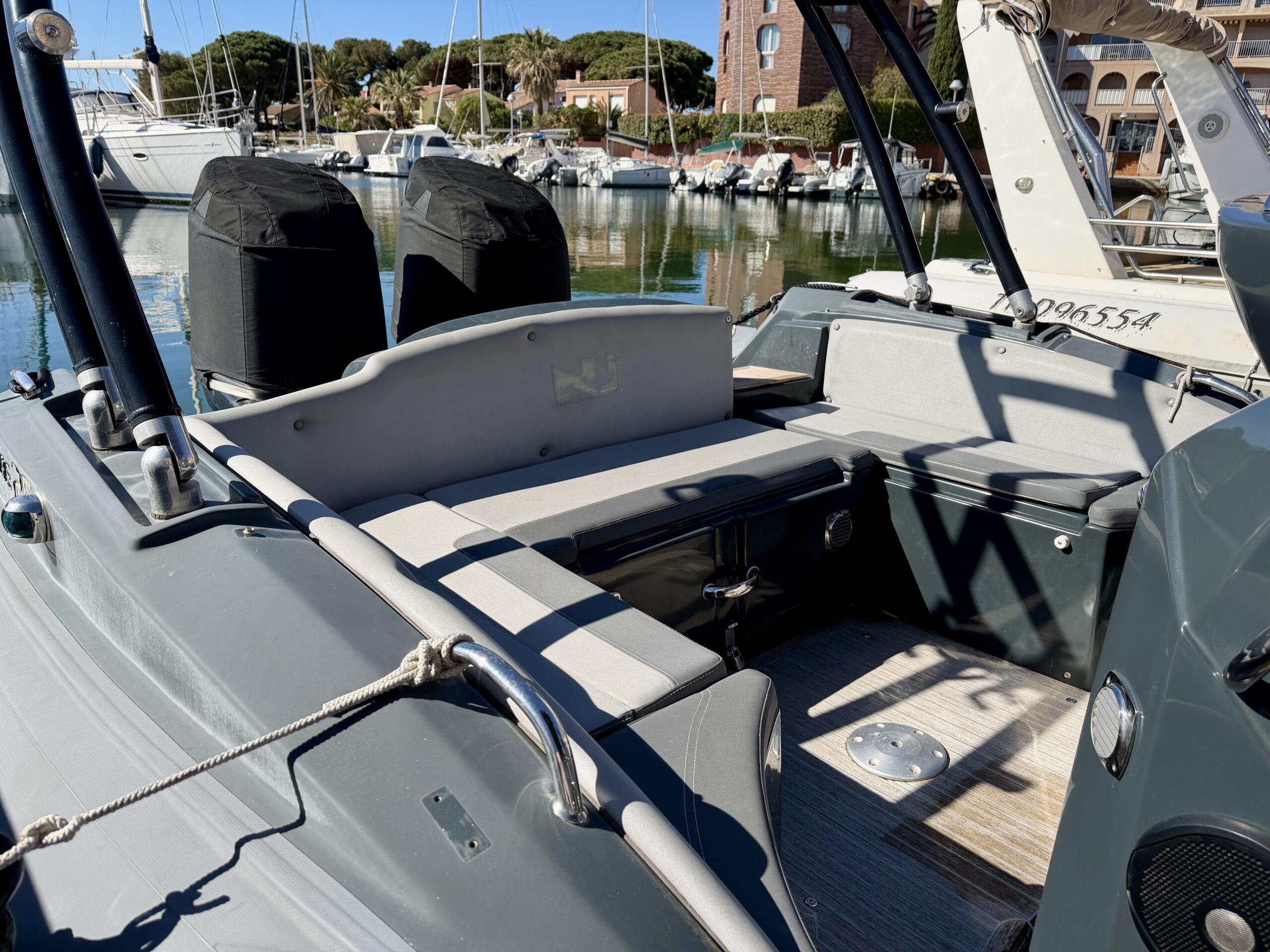 Le bateau est équipé d'un T-Top, des bains de soleil à l’avant et à l’arrière, ainsi qu’un espace convivial avec table de cockpit pour profiter pleinement des sorties en mer. Le bateau dispose également d’une petite cuisine avec évier et réfrigérateur, ainsi que d’un WC électrique avec cuve à eau noire, apportant un confort appréciable à bord sur un semi rigide de cette catégorie.