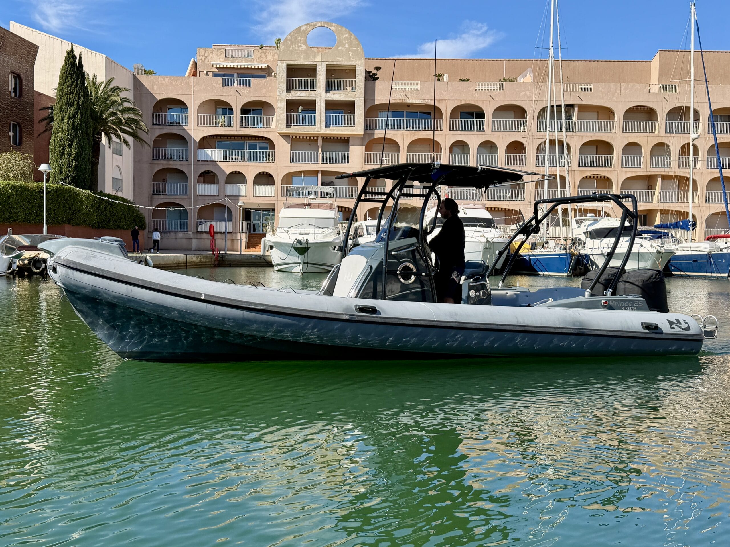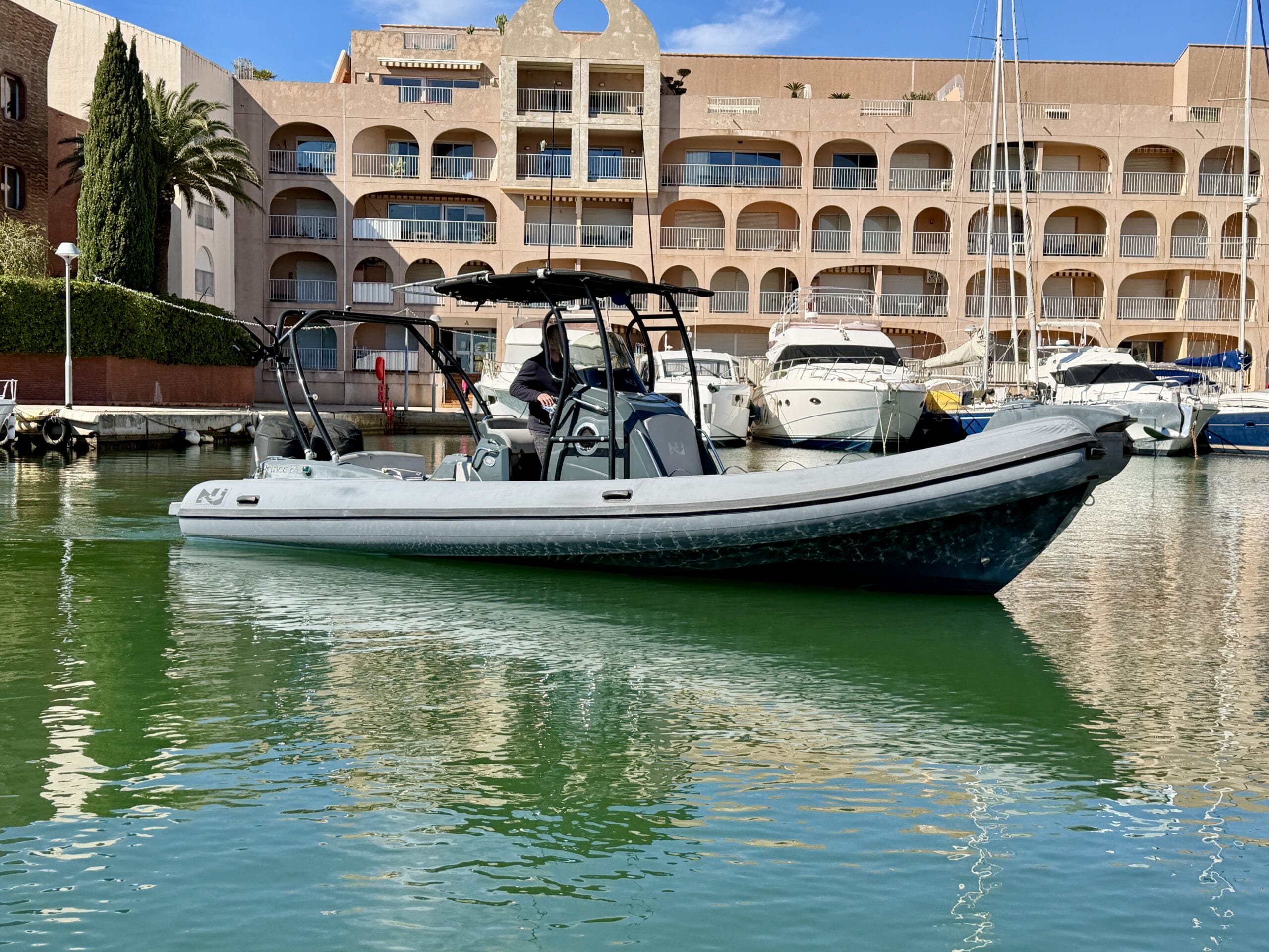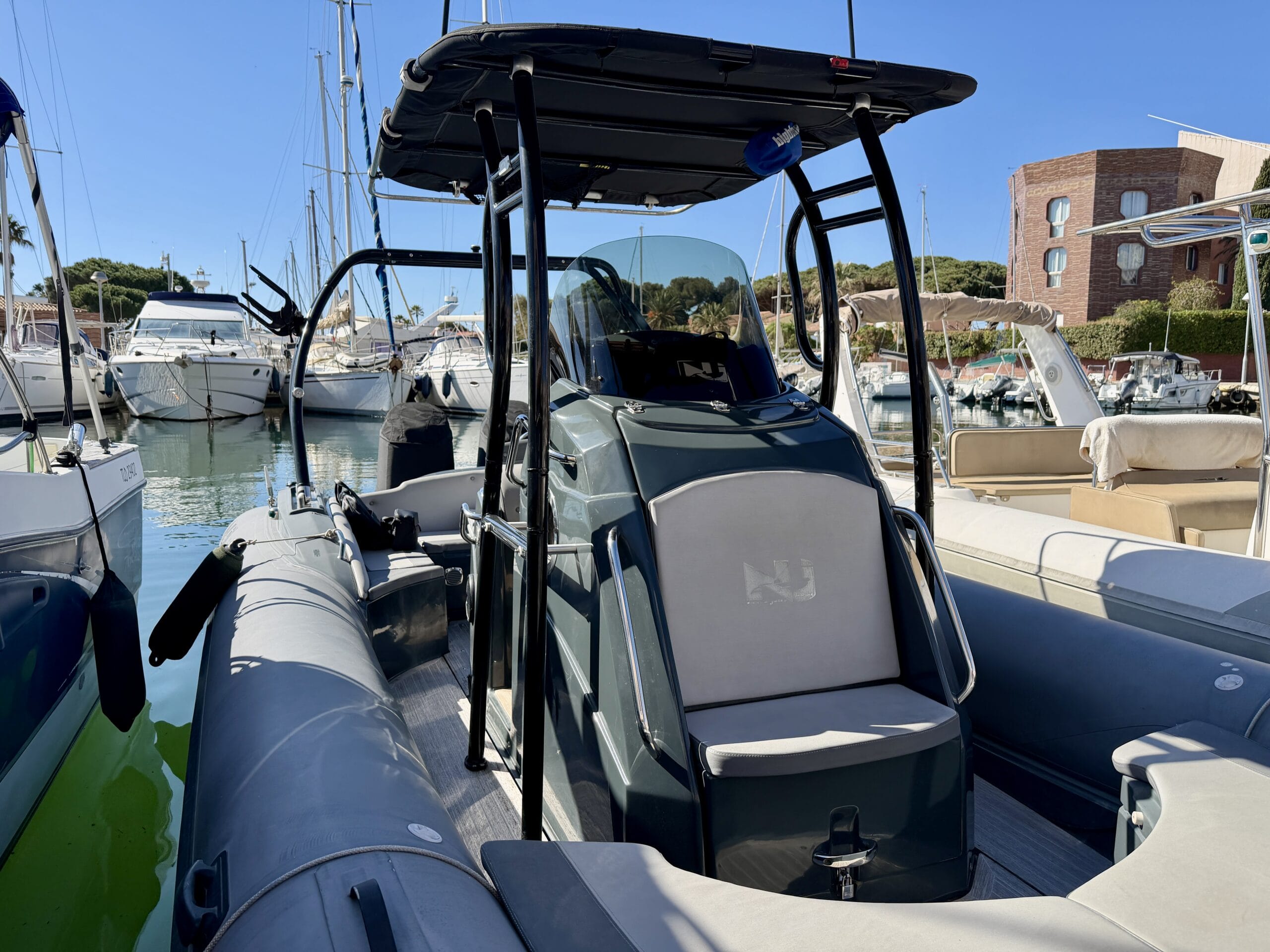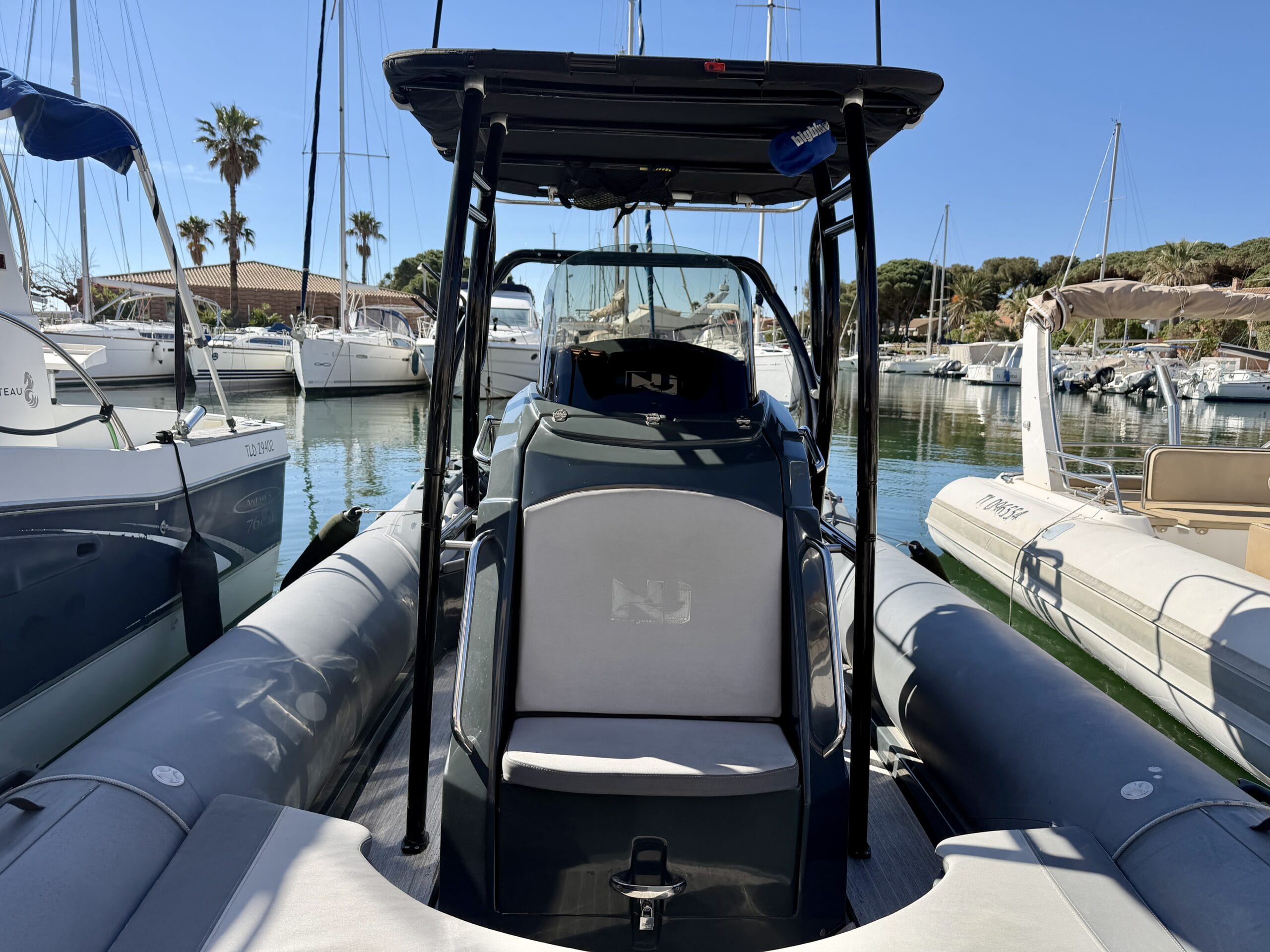 Le bateau est équipé d'un T-Top, des bains de soleil à l’avant et à l’arrière, ainsi qu’un espace convivial avec table de cockpit pour profiter pleinement des sorties en mer. Le bateau dispose également d’une petite cuisine avec évier et réfrigérateur, ainsi que d’un WC électrique avec cuve à eau noire, apportant un confort appréciable à bord sur un semi rigide de cette catégorie.
