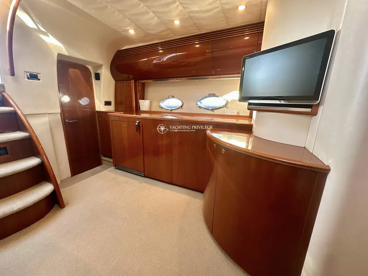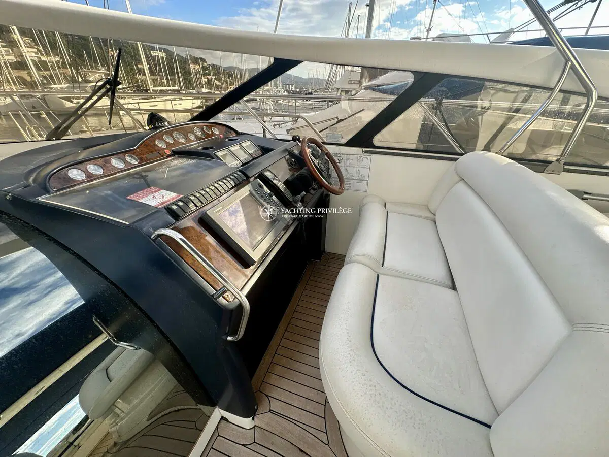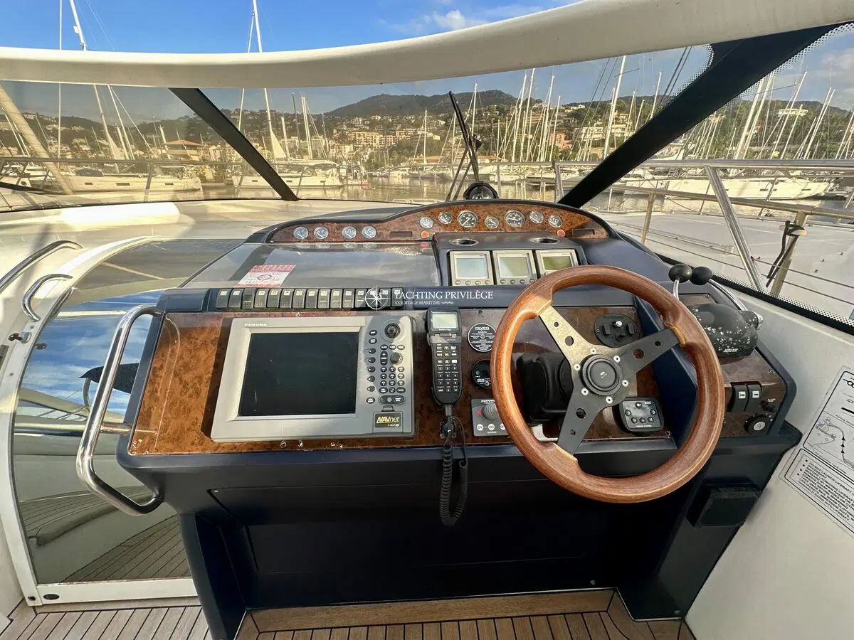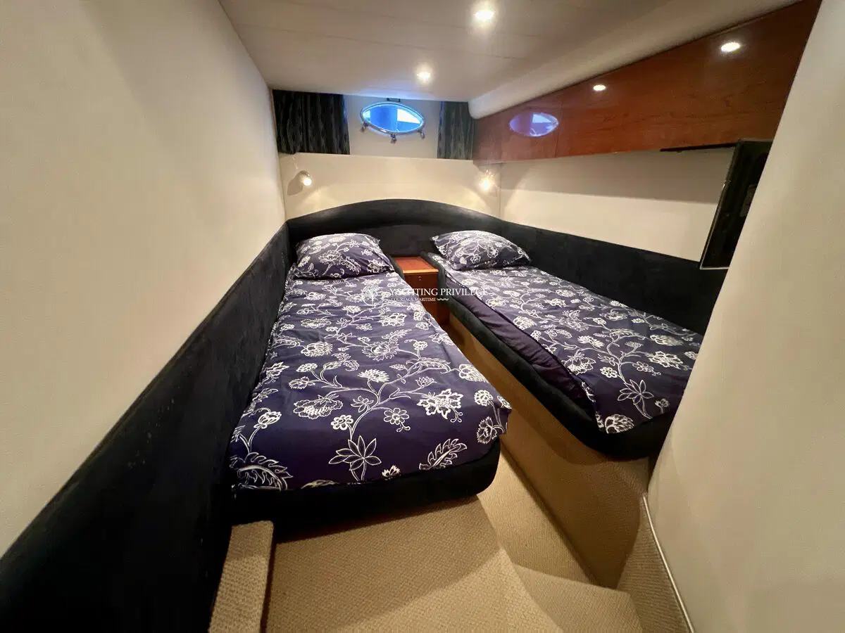Très bon état général pour cette unité, selleries et textiles extérieurs en très bon état. Gps sondeur traceur Furuno, vhf, radar, pilote automatique. Passerelles Hydraulique, climatisation réversible, générateur, chargeur de batteries, 2 cabines, 2 salles de bain, 2 wc, cuisine, salon, 2 télévisions.