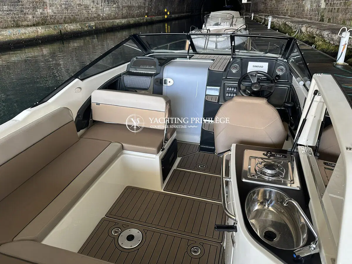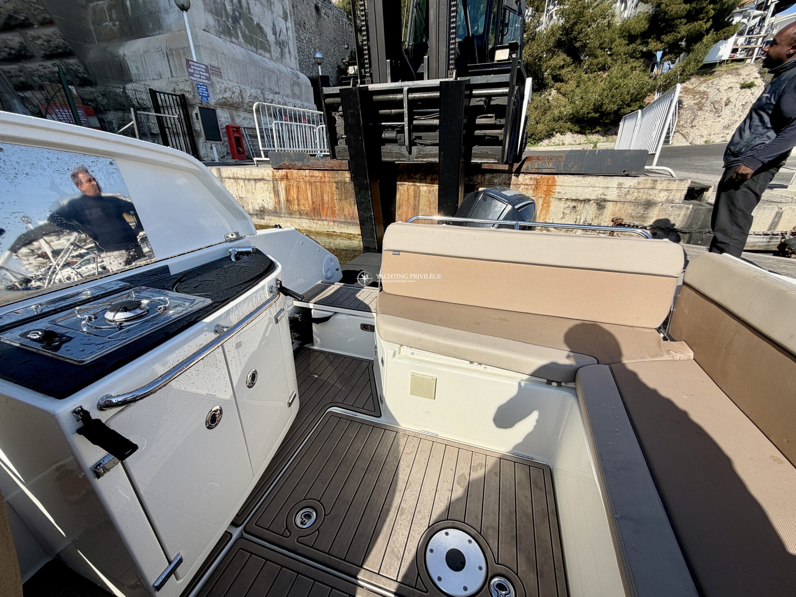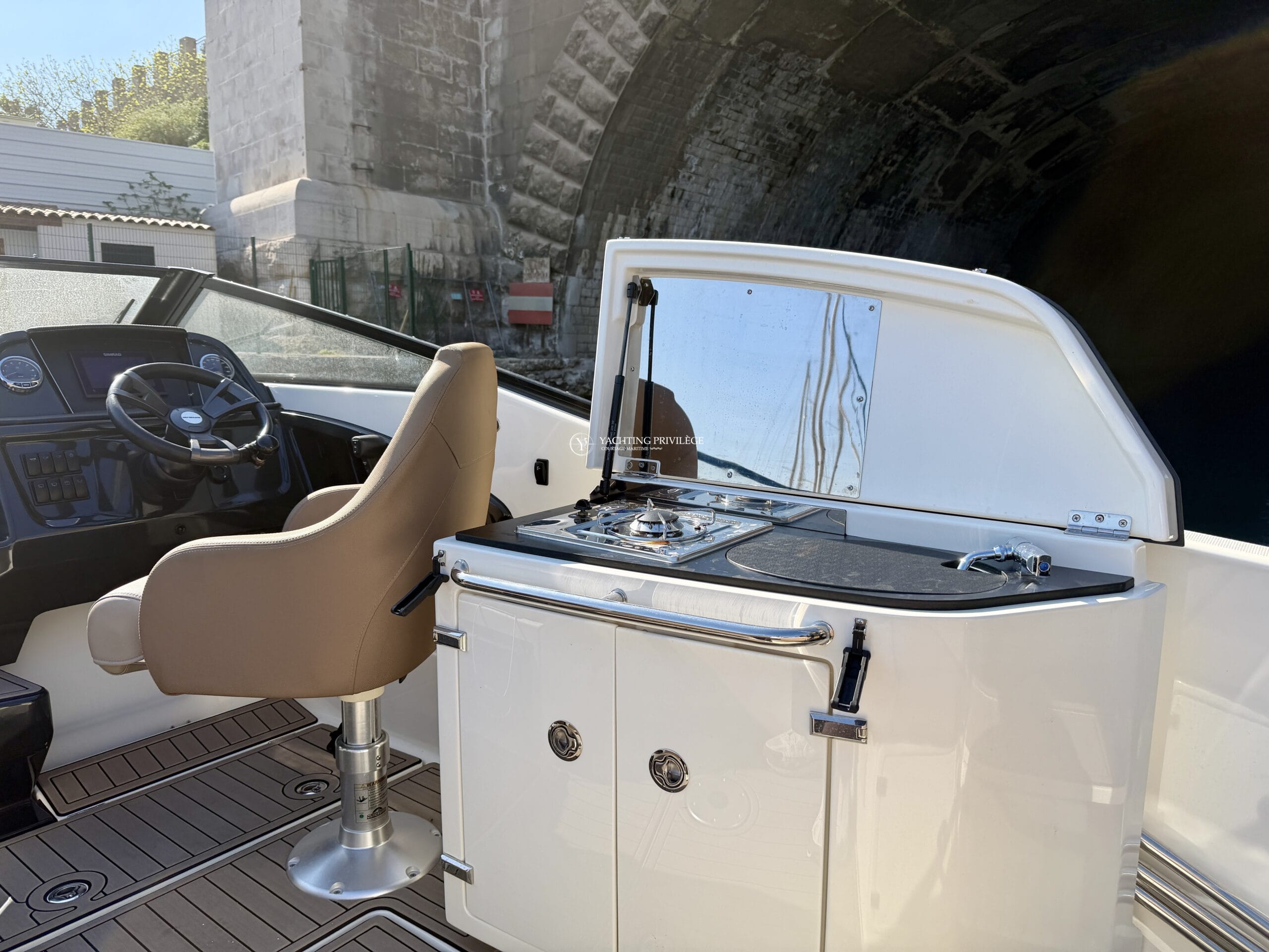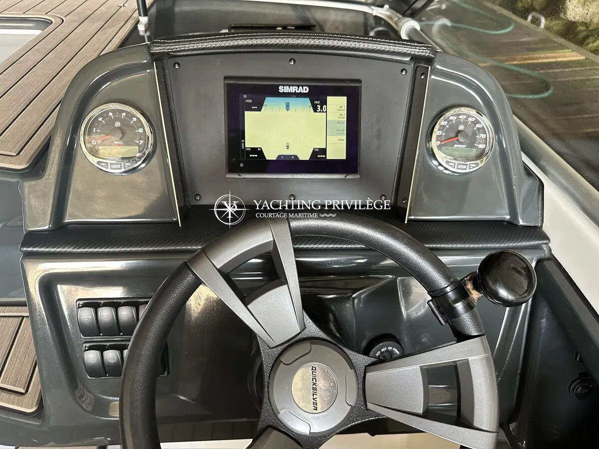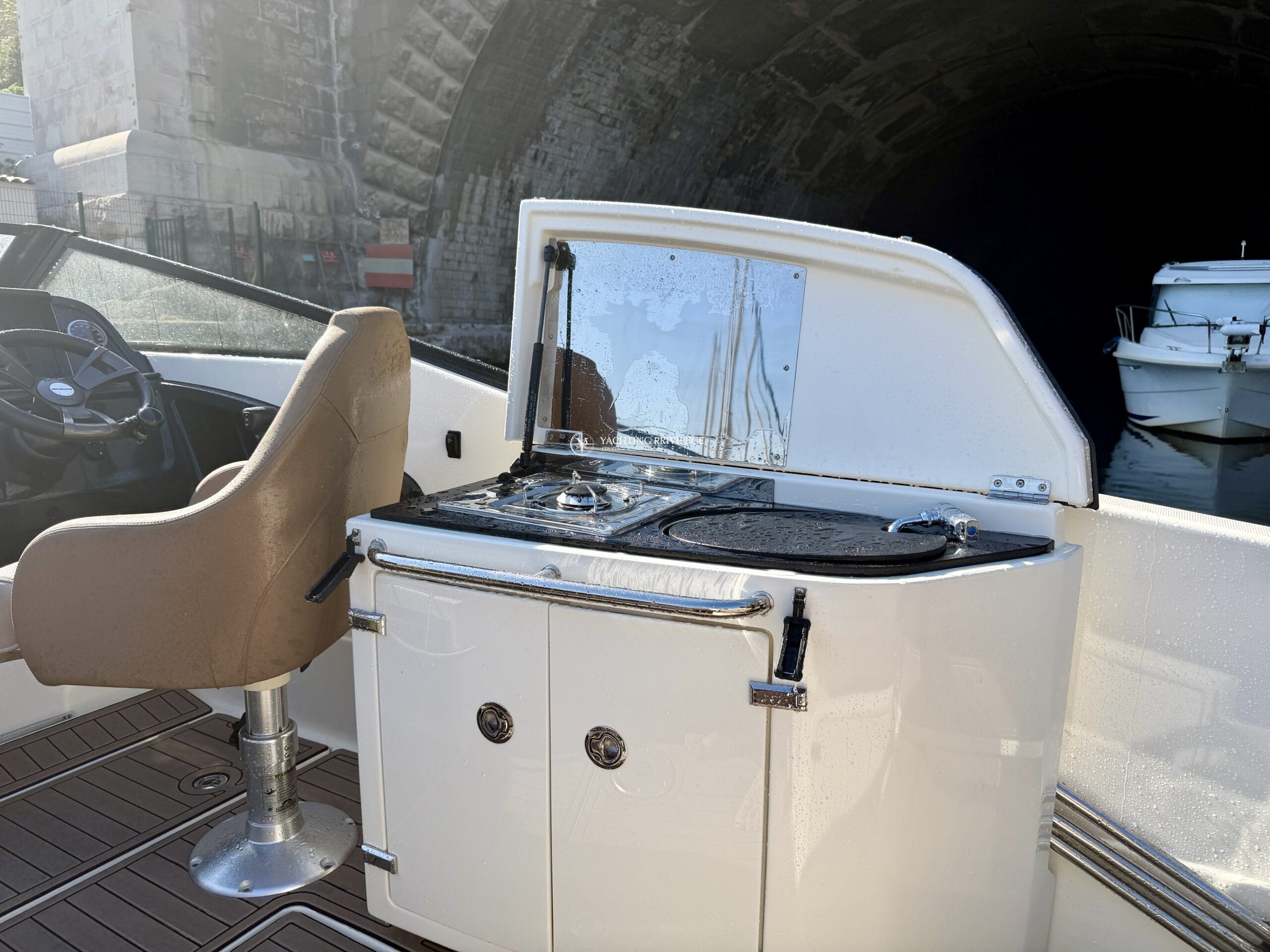 Le bateau est équipé d’une cuisine extérieure avec réfrigérateur, évier, réchaud à gaz. Bains de soleil avant, carré arrière, table de cockpit, bimini, taud d’hivernage, guideau électrique, GPS/Sondeur Simrad, Activ trim, cabine avec deux couchages et WC marin.