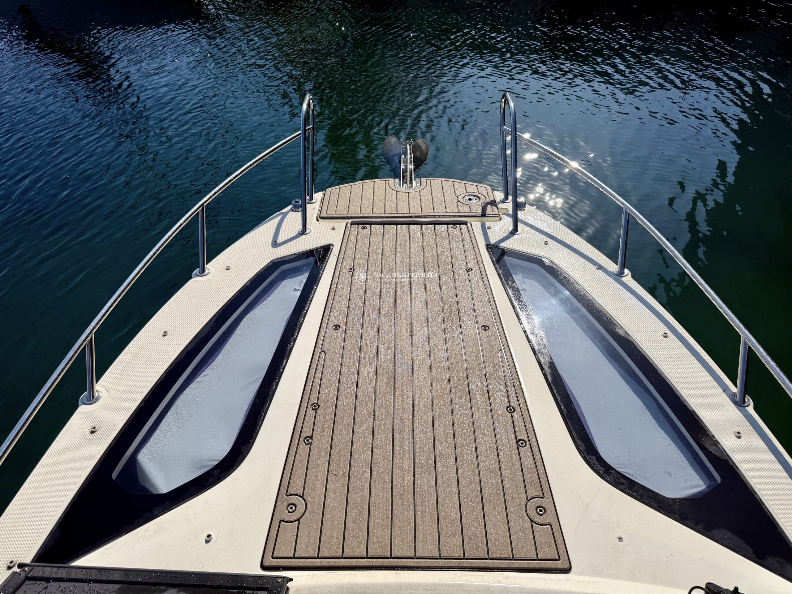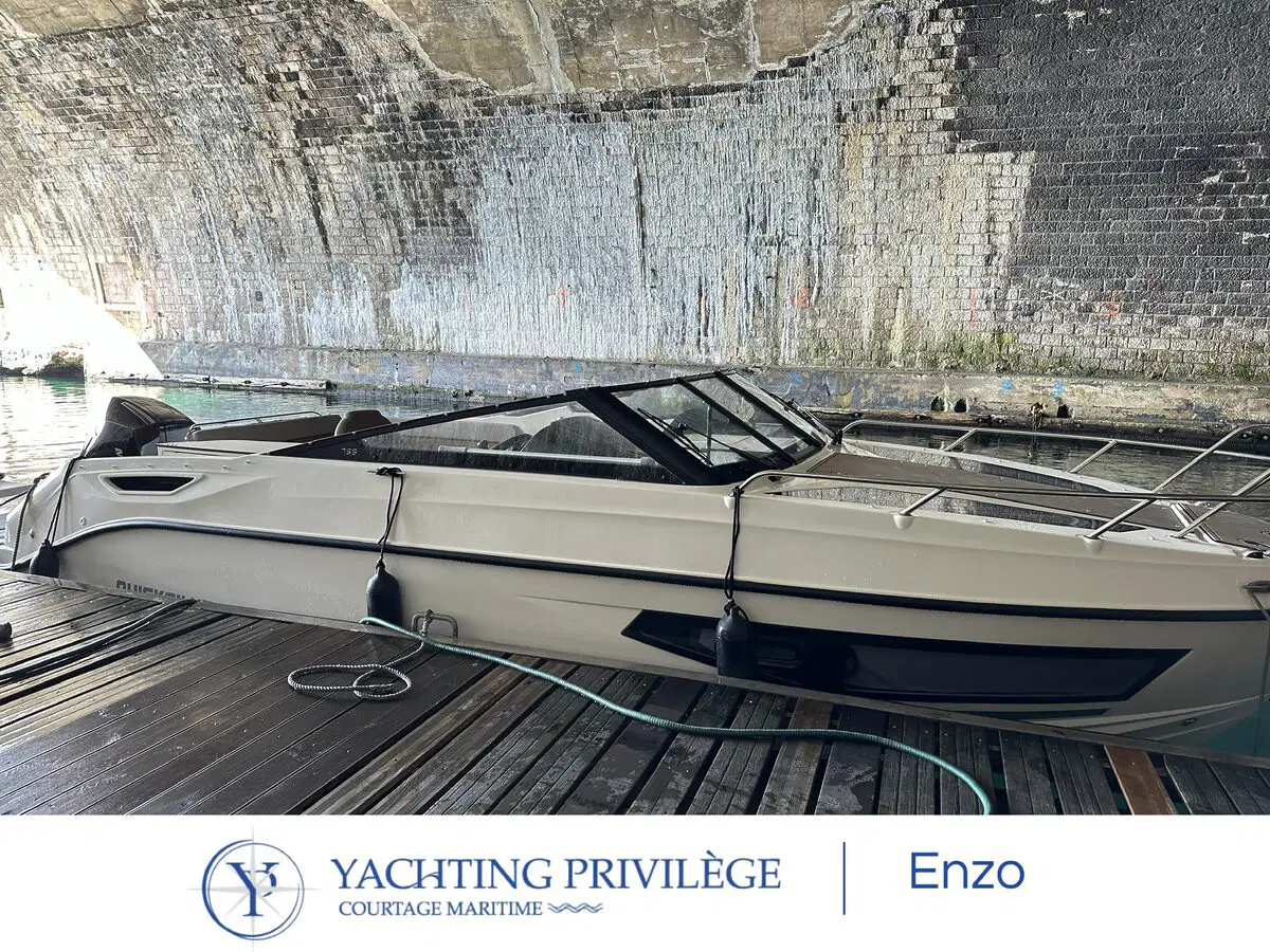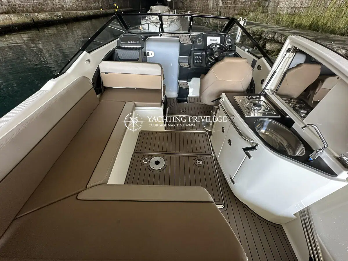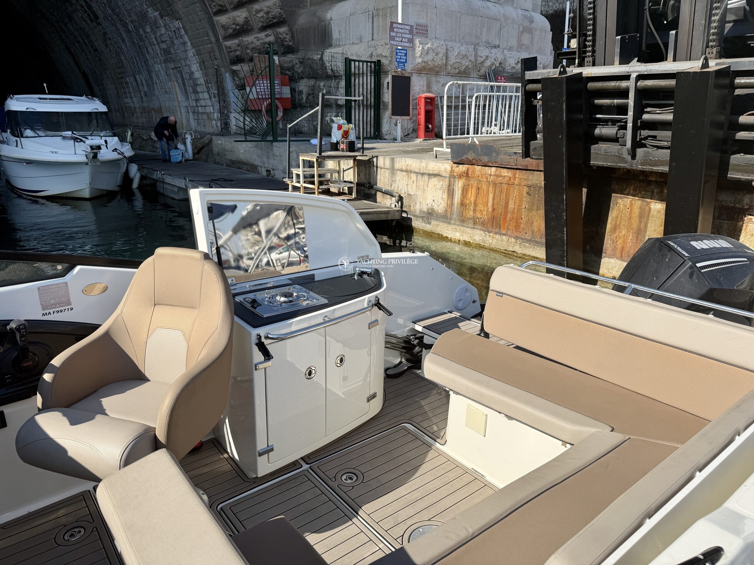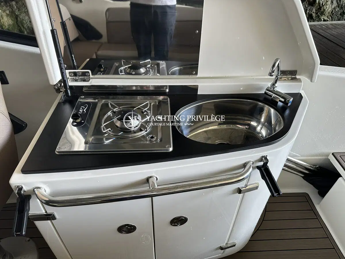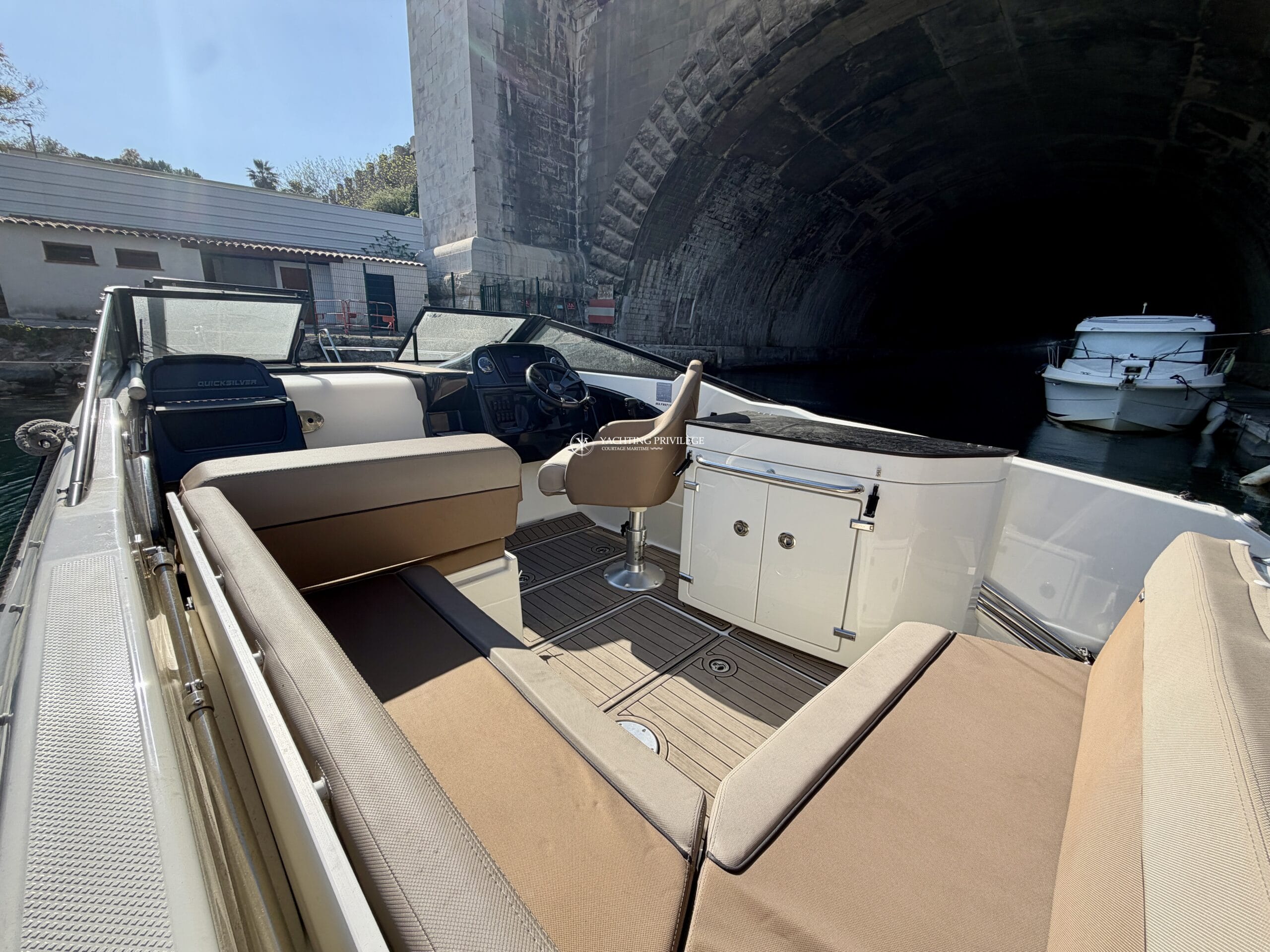 Le bateau est équipé d’une cuisine extérieure avec réfrigérateur, évier, réchaud à gaz. Bains de soleil avant, carré arrière, table de cockpit, bimini, taud d’hivernage, guideau électrique, GPS/Sondeur Simrad, Activ trim, cabine avec deux couchages et WC marin.