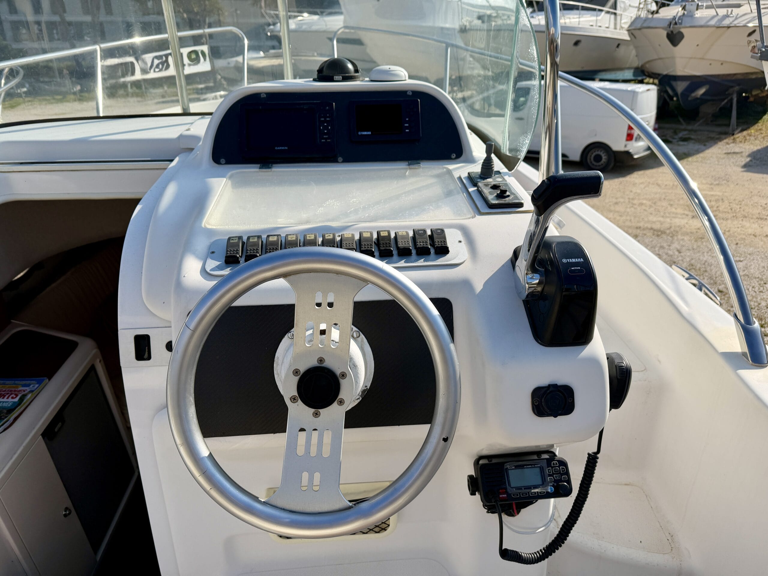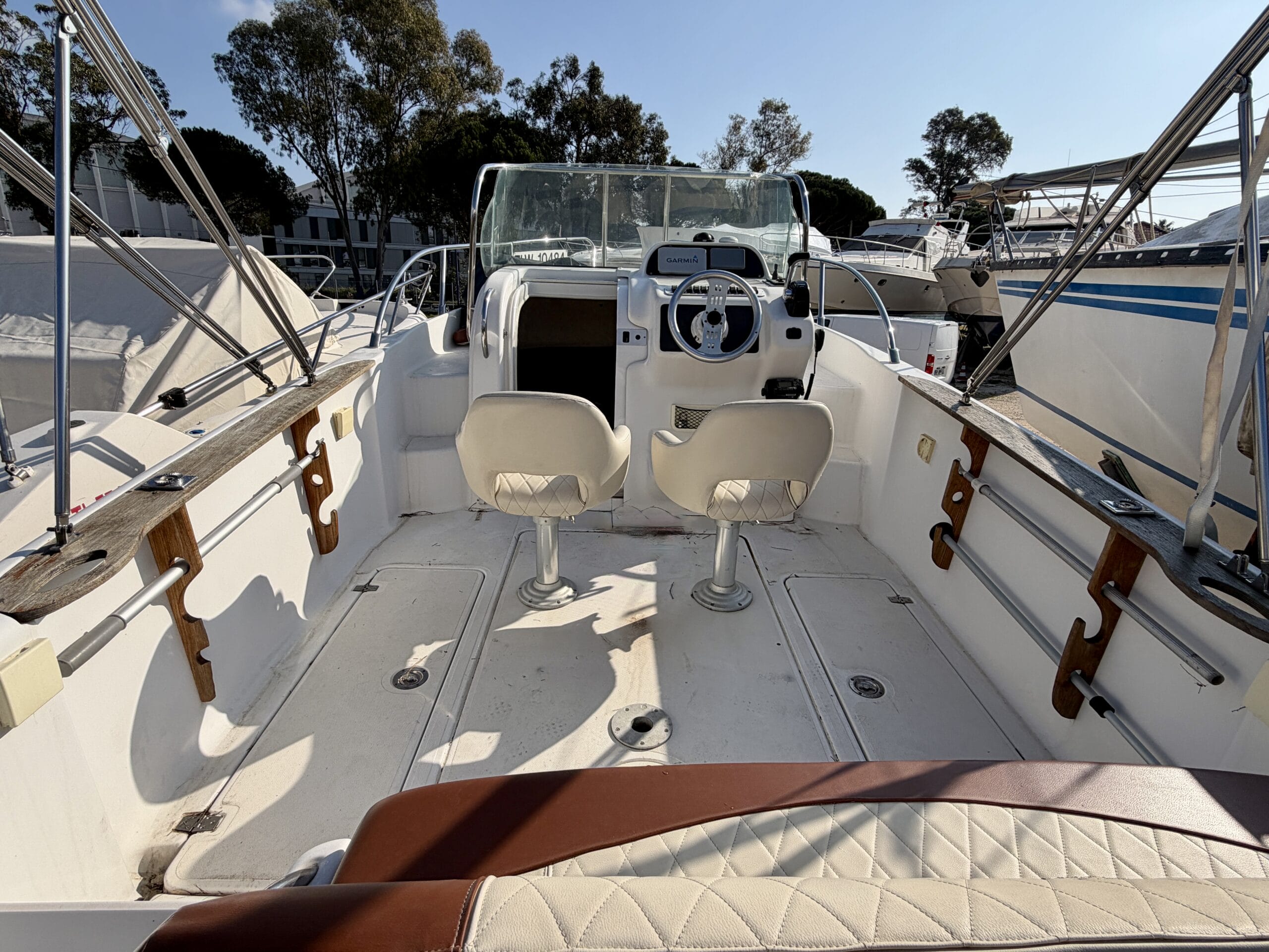 Côté électronique et électricité, le bateau dispose d’un GPS sondeur Garmin ainsi que d’un chargeur de batteries avec prise de quai.