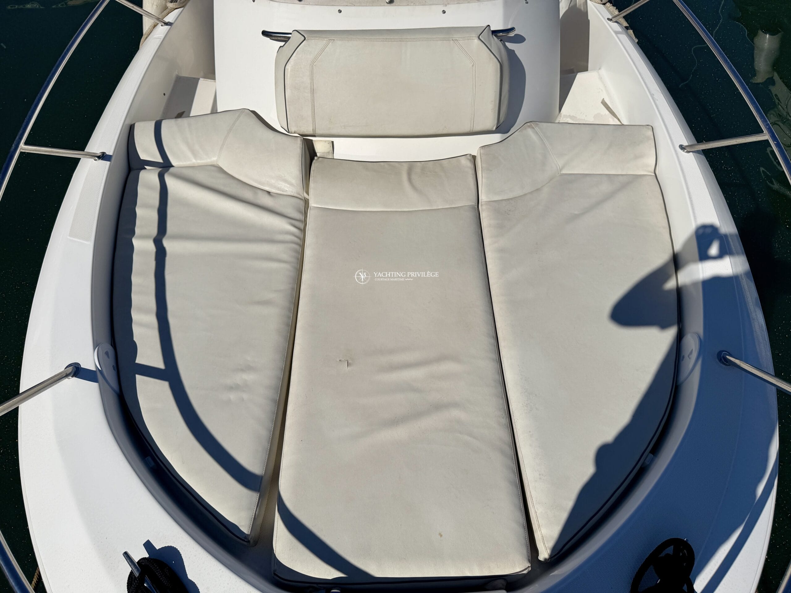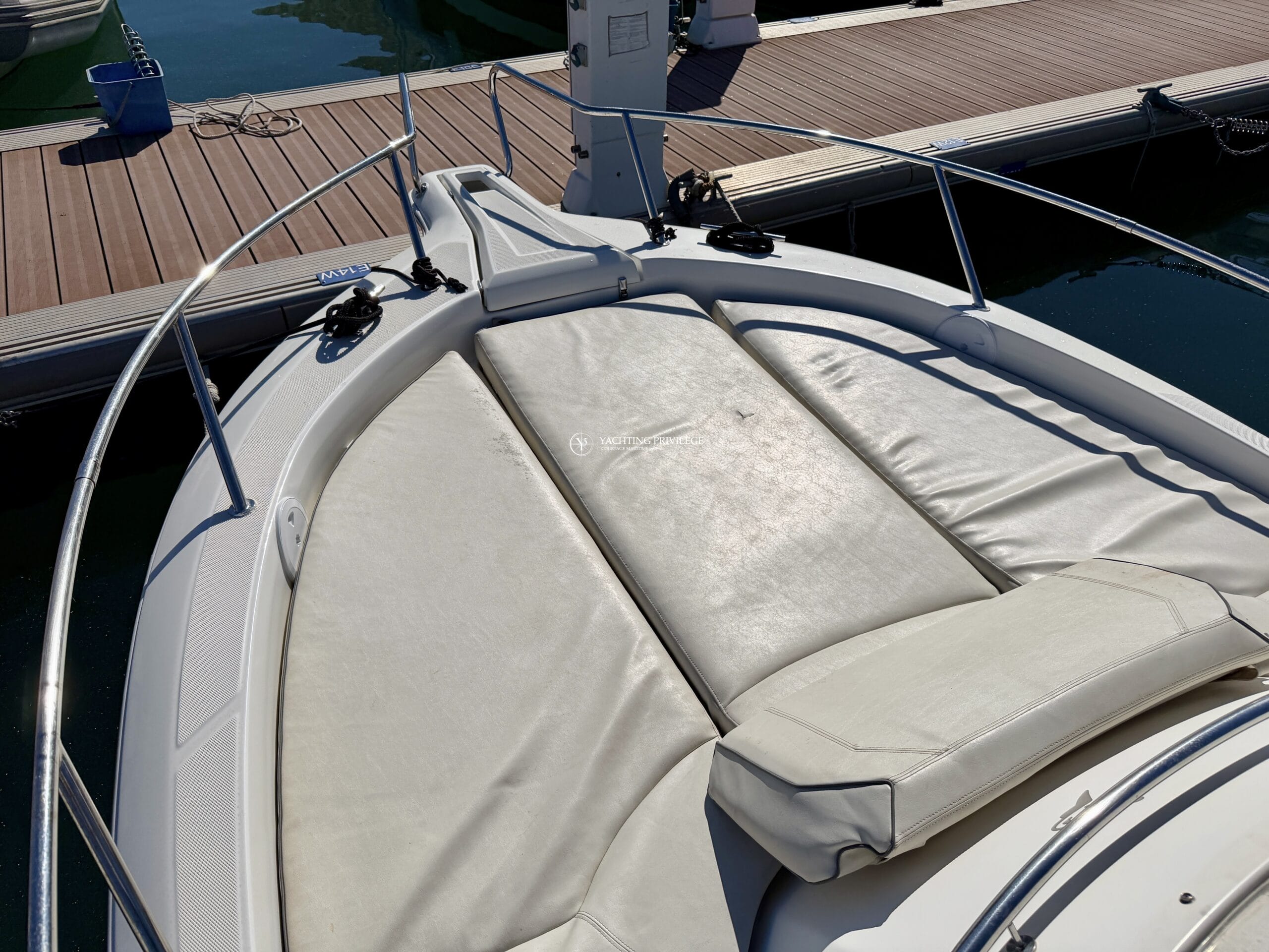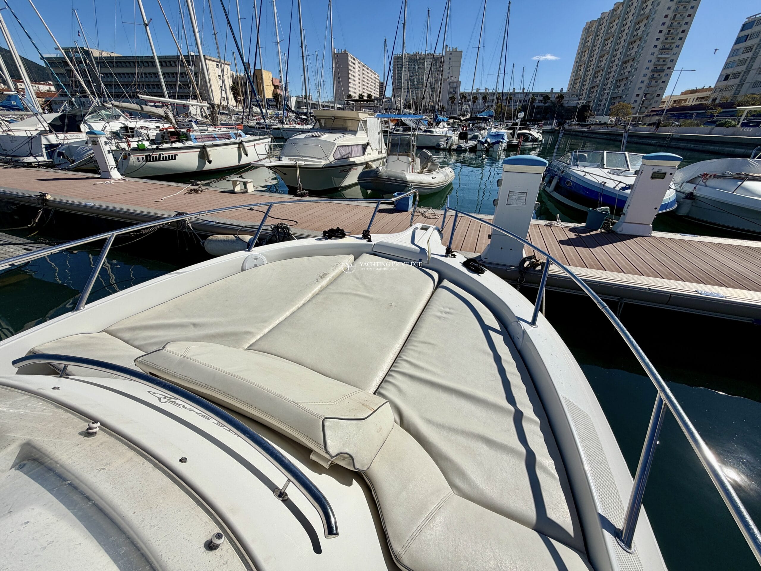 À bord, vous bénéficiez de nombreux équipements assurant confort et sécurité, tels qu’un guindeau électrique, un sondeur, un Navtex, un bain de soleil avant, un taud de soleil, des coussins de cockpit, une radio Sony, un chargeur de batterie ainsi qu’une VHF.